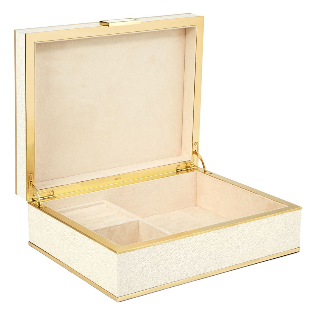 Tasteful and refined, this jewelry box in rich, delicately embossed shagreen and brass trim creates a pretty storage space. The large size is endlessly versatile, whether placed on a vanity to hold favorite accessories or set upon an office desk to store odds and ends.