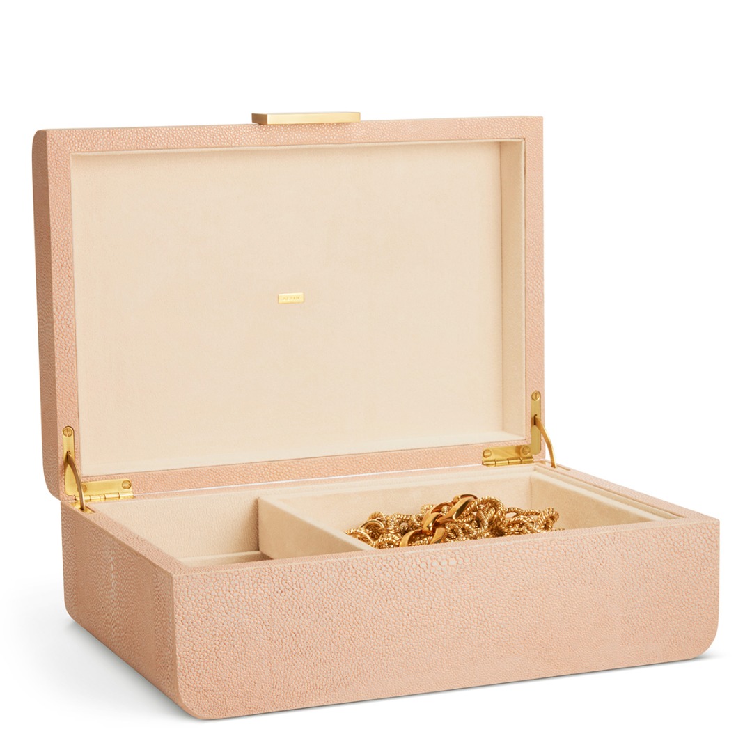 his decorative box is finished with a textured, embossed shagreen. Its curved lines have a sculptural appeal, while brass detailing adds a stylish touch. Use it for jewelry on a vanity or to organize personal objects on a desk or table.