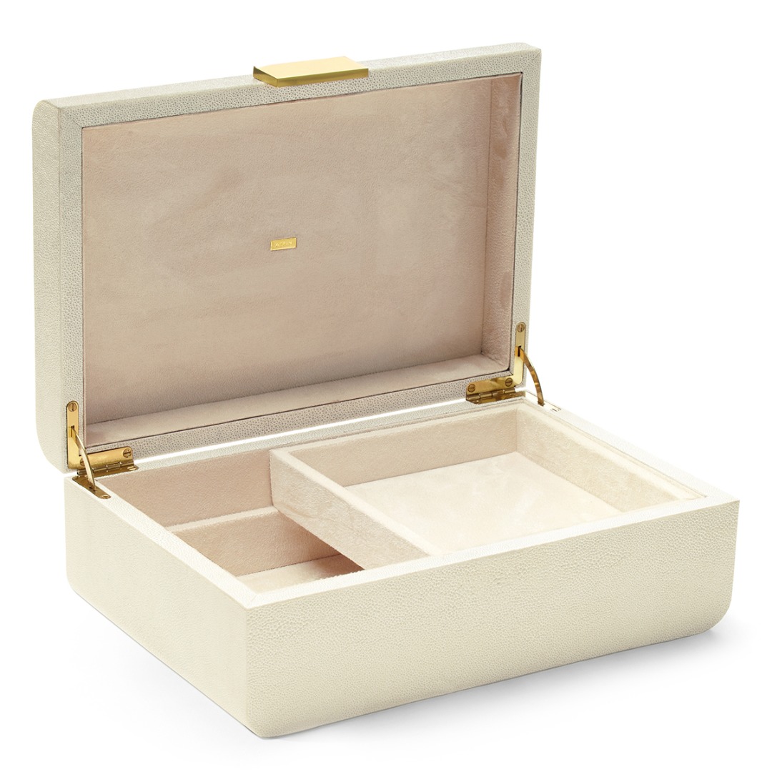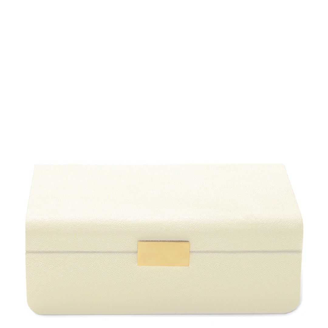 This decorative box is finished with a textured, embossed shagreen. Its curved lines have a sculptural appeal, while brass detailing adds a stylish touch. Use it for jewelry on a vanity or to organize personal objects on a desk or table.