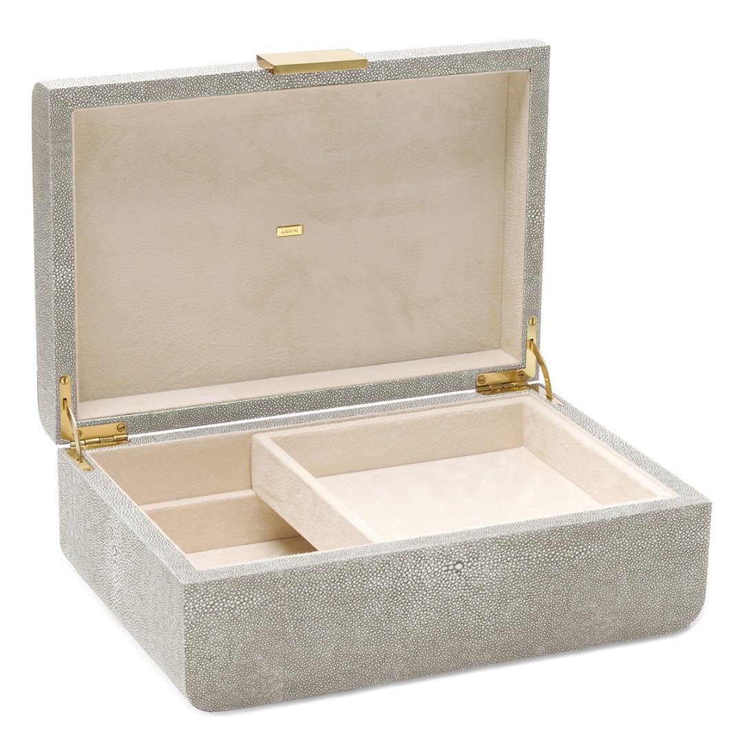 This decorative box is finished with a textured, embossed shagreen. Its curved lines have a sculptural appeal, while brass detailing adds a stylish touch. Use it for jewelry on a vanity or to organize personal objects on a desk or table.