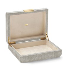 This decorative box is finished with a textured, embossed shagreen. Its curved lines have a sculptural appeal, while brass detailing adds a stylish touch. Use it for jewelry on a vanity or to organize personal objects on a desk or table.
