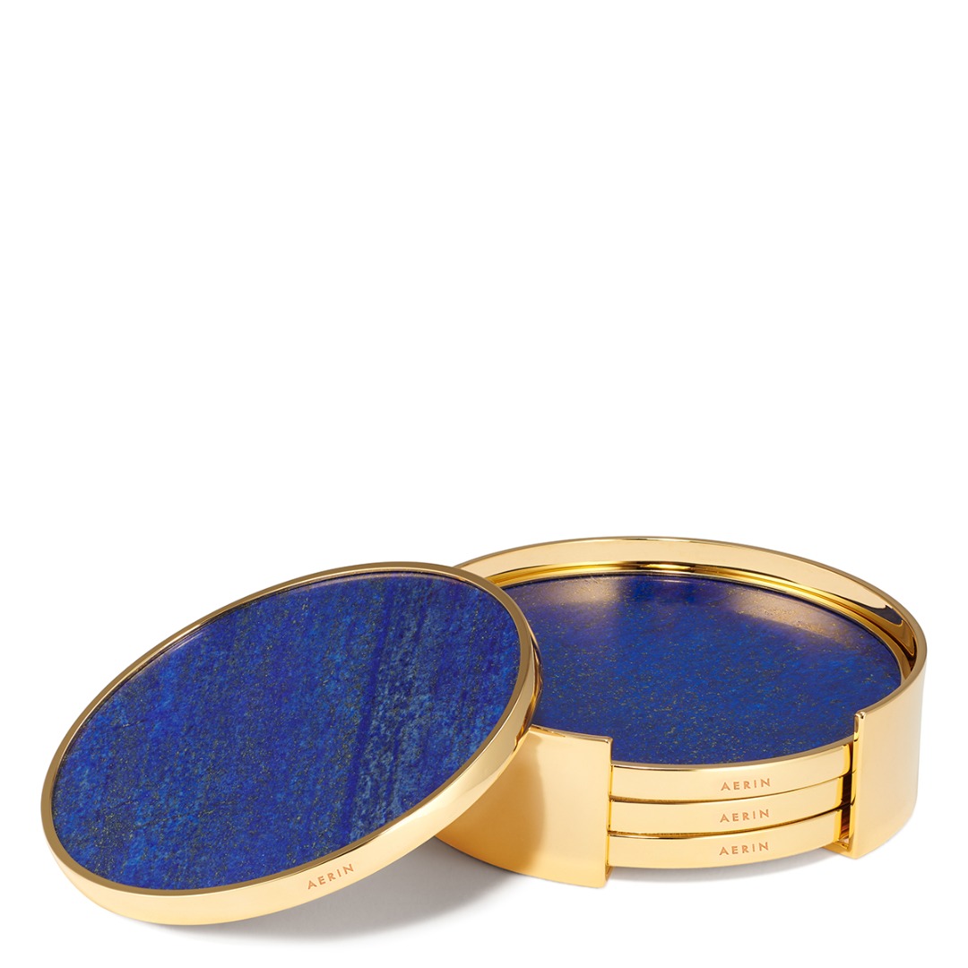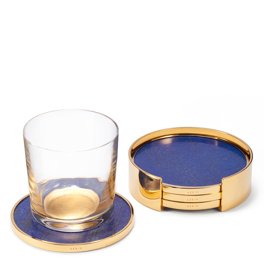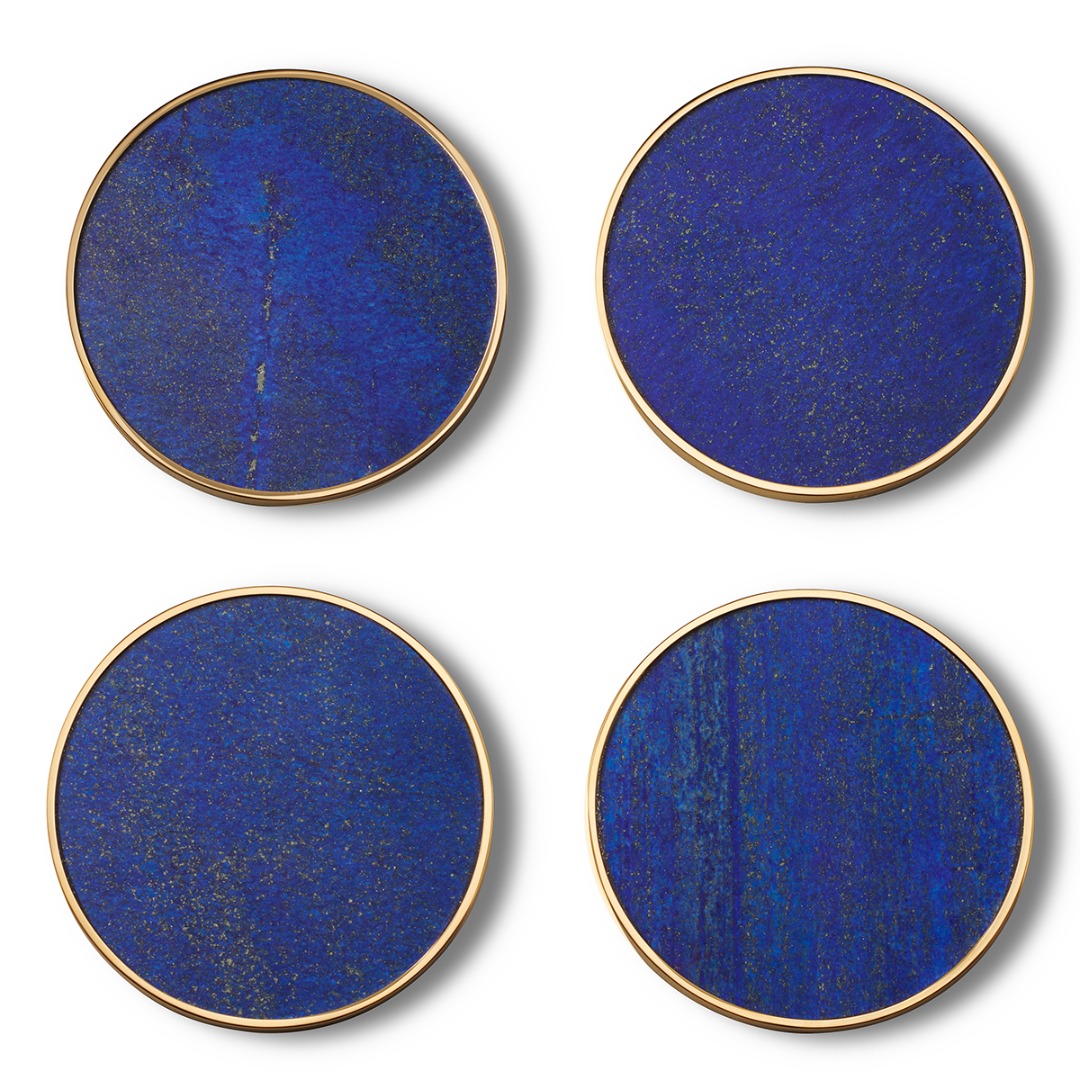 This set of four coasters adds a sophisticated touch to entertaining. Topped with semi-precious blue stone edged in warm gold, the four coasters can be stored in an attractive circular gold case. The Lapis coasters were inspired by the rich colors of European mosaic stone and tilework.