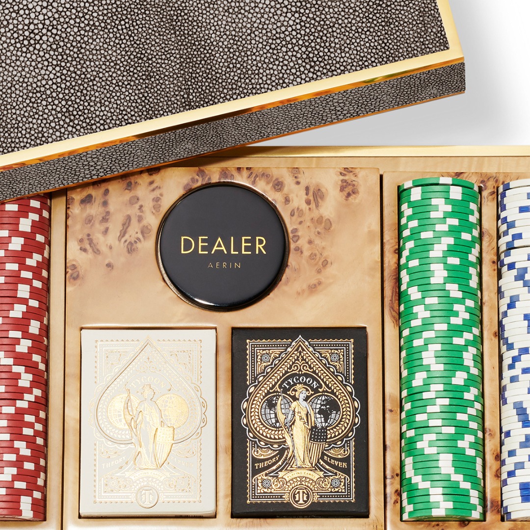 This stylish 300-piece poker set comes in a luxurious shagreen case that looks beautiful stored on a table or shelf. It includes two decks of playing cards, along with an AERIN-embossed dealer button and poker chips, all stored neatly in partitioned columns. Chips come in 50 pieces x 6 colors.