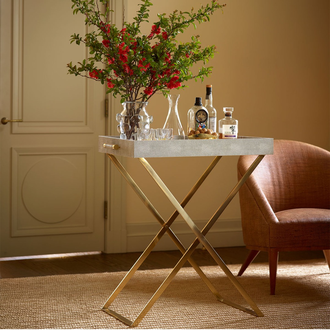 A solid brass stand that works with Aerin's range of trays to help tableside serving or as a glamorous bar for entertaining at home.