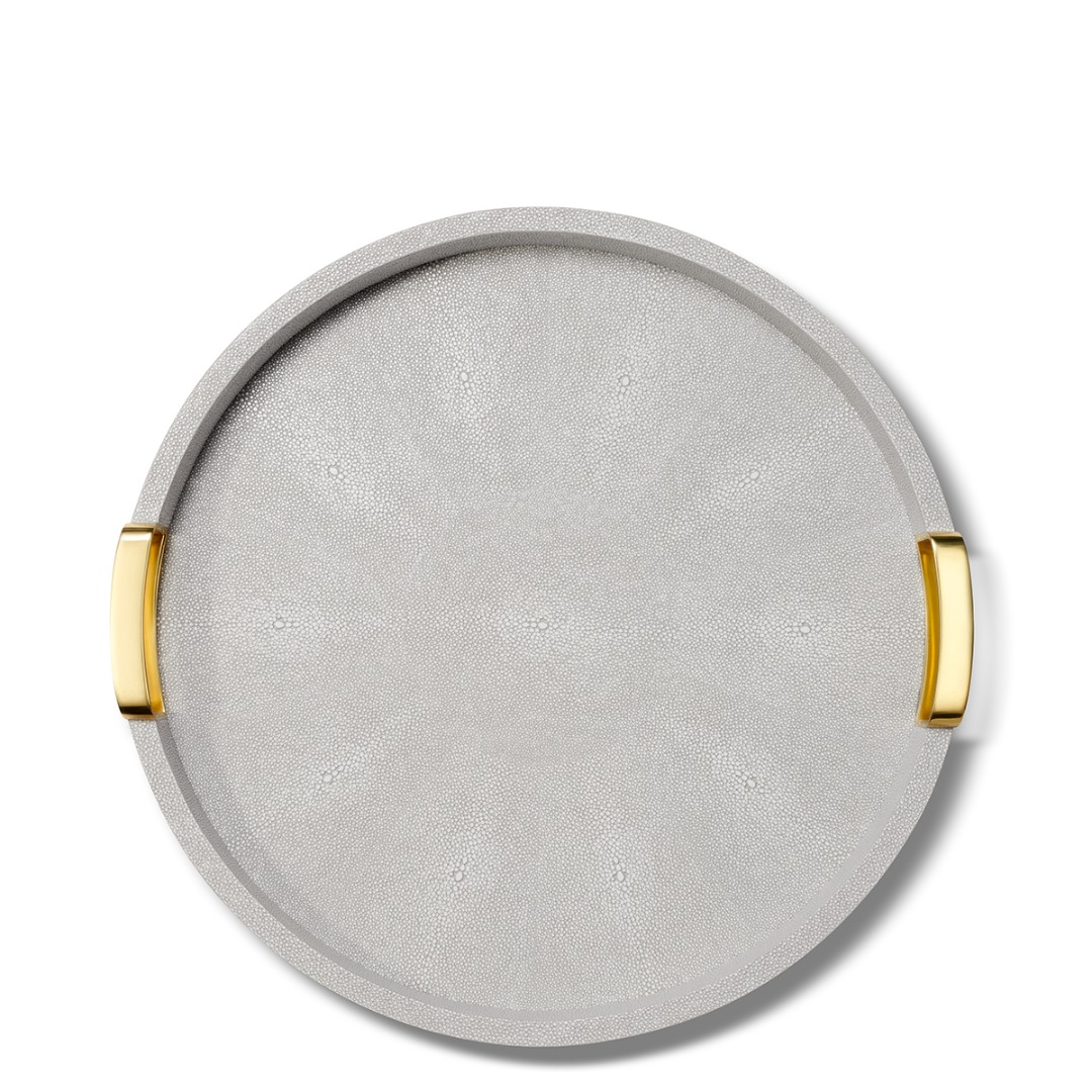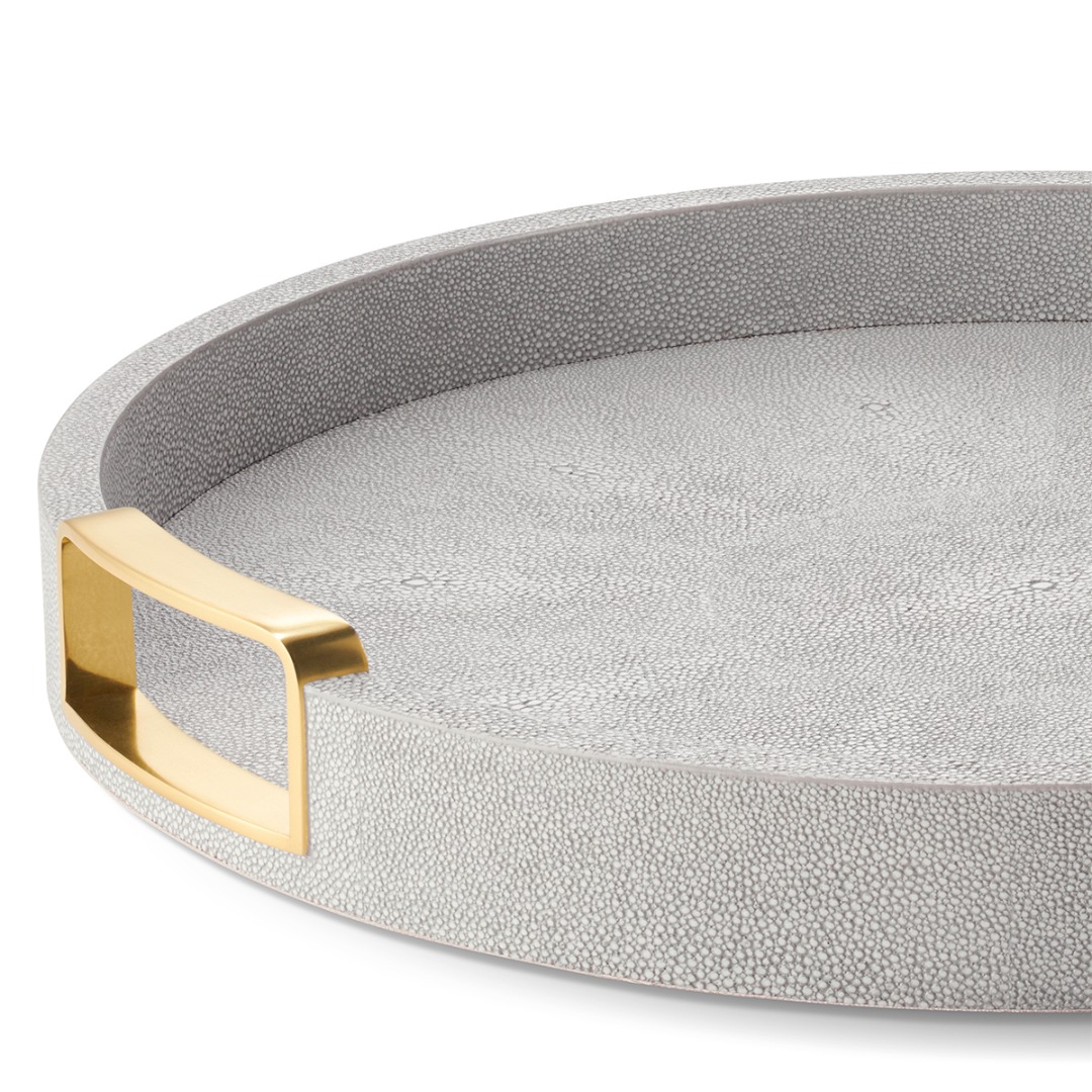 This circular tray is a stylish addition to entertaining, with an embossed shagreen finish and two rectangular integrated handles made of brass. Its compact size is perfect for carrying drinks or organizing a home bar in smaller spaces.