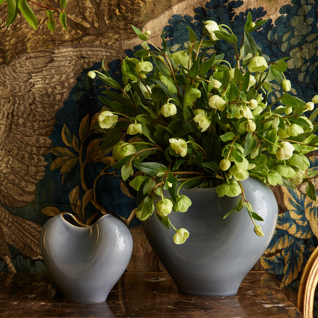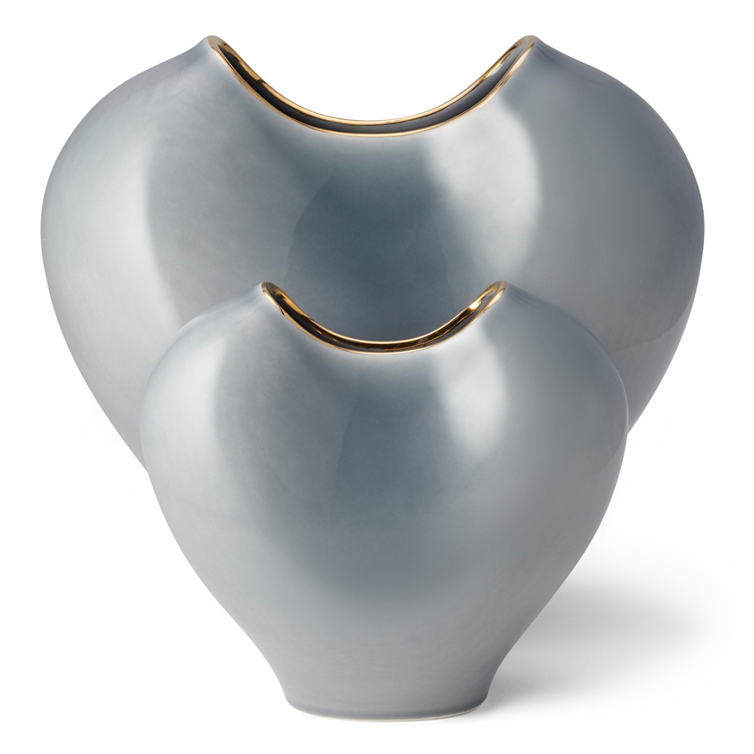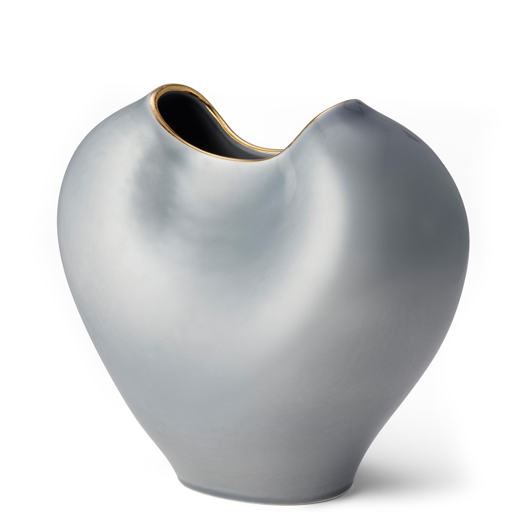 Crafted by artisans in Italy, the concave shape of this large vase is enhanced with a transparent glaze that provides a unique variation. It is further elevated by a hand-painted gold rim. The vase looks beautiful alone or with long-stemmed flowers.