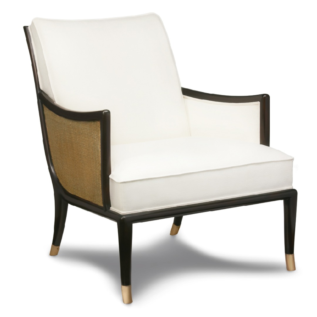 Frame of beech wood, down and feather cushions and double caned back with antiqued brass caps.