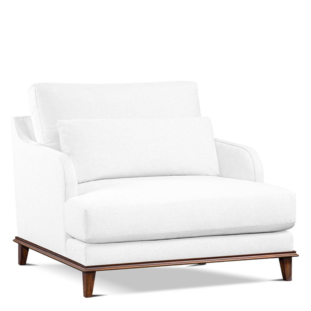 Pine and primavera woods; webbing, foam upholstery and down filled cushions.