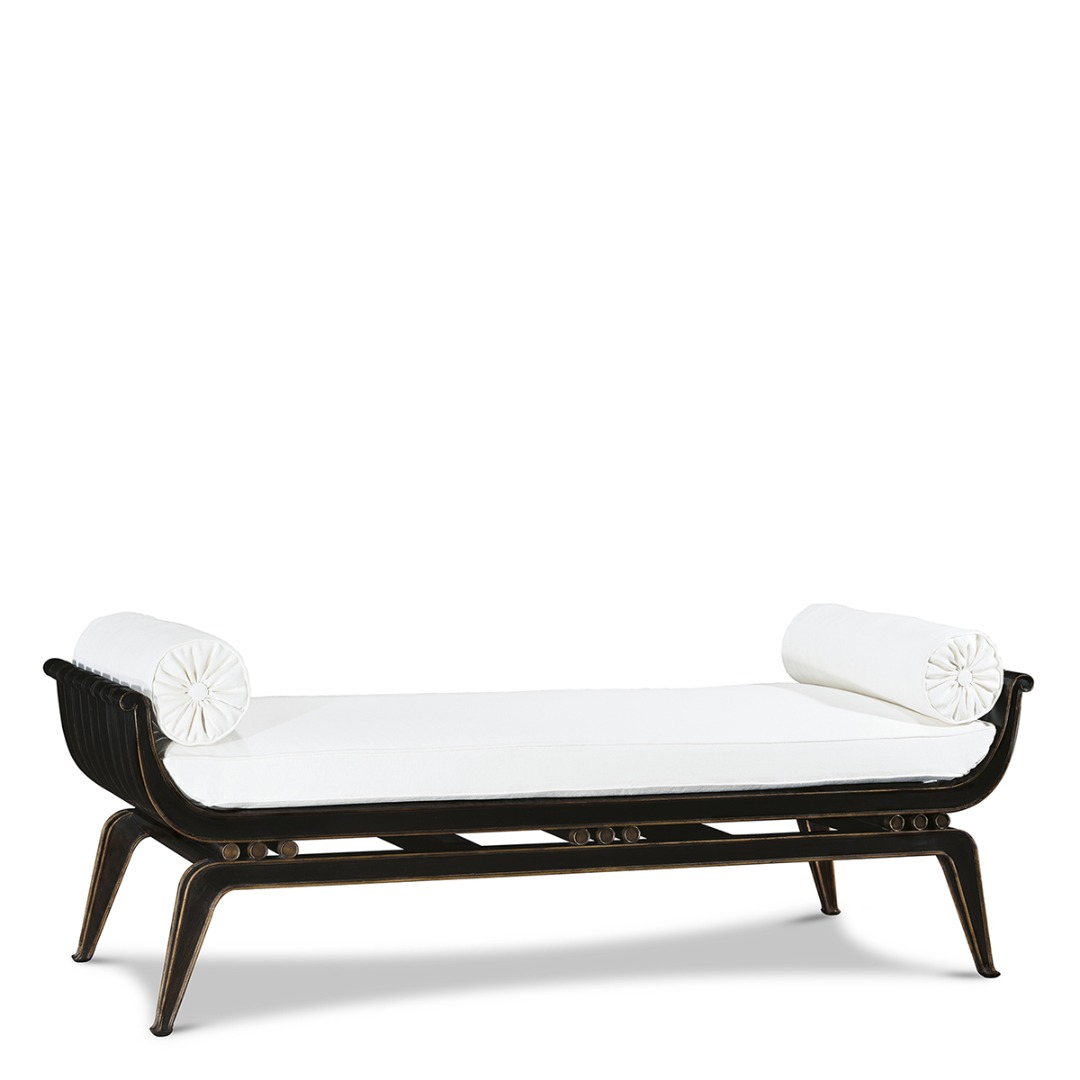 Primavera wood, down and feather loose cushions, antiqued brass details.