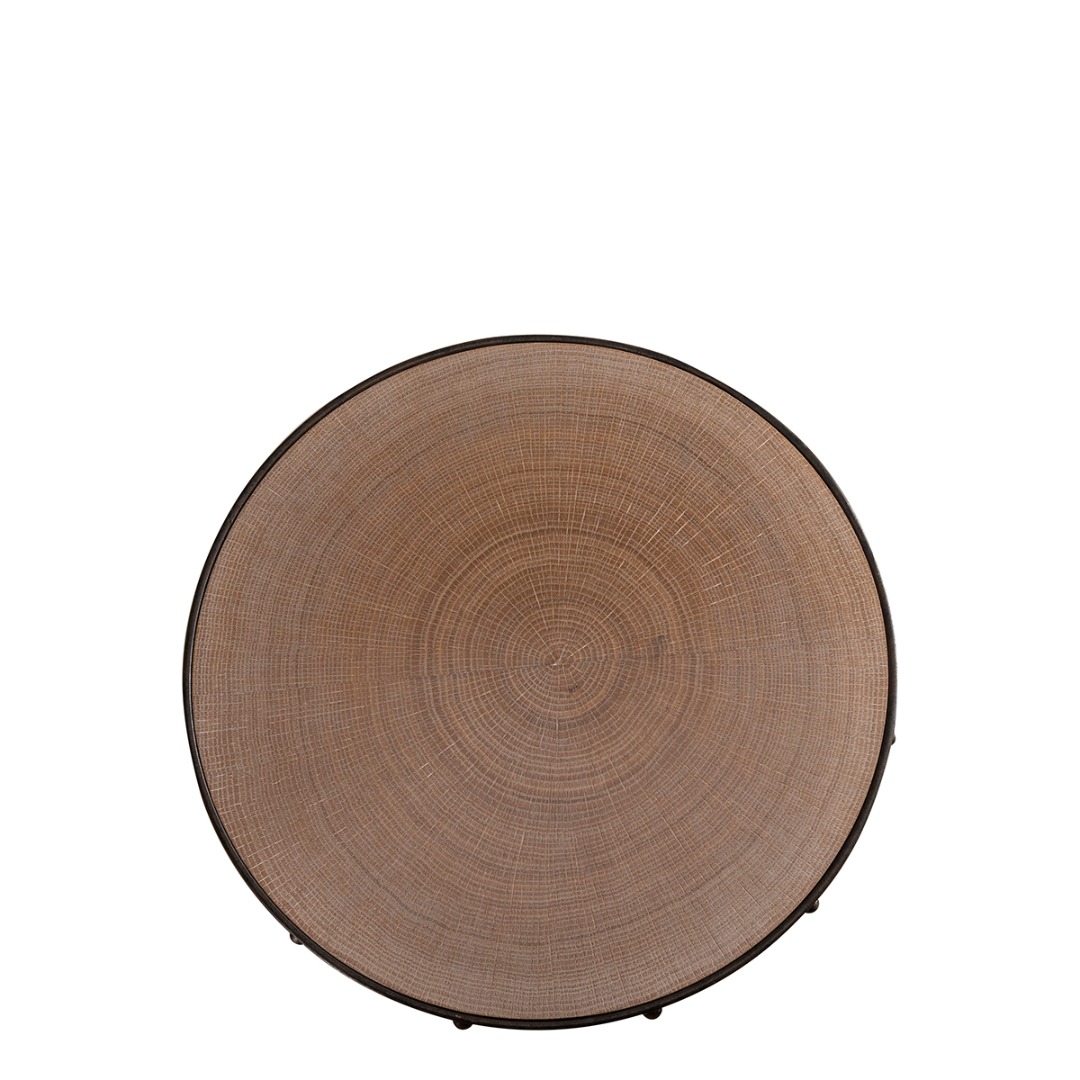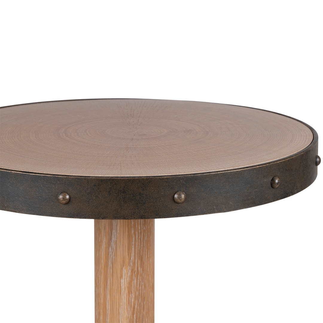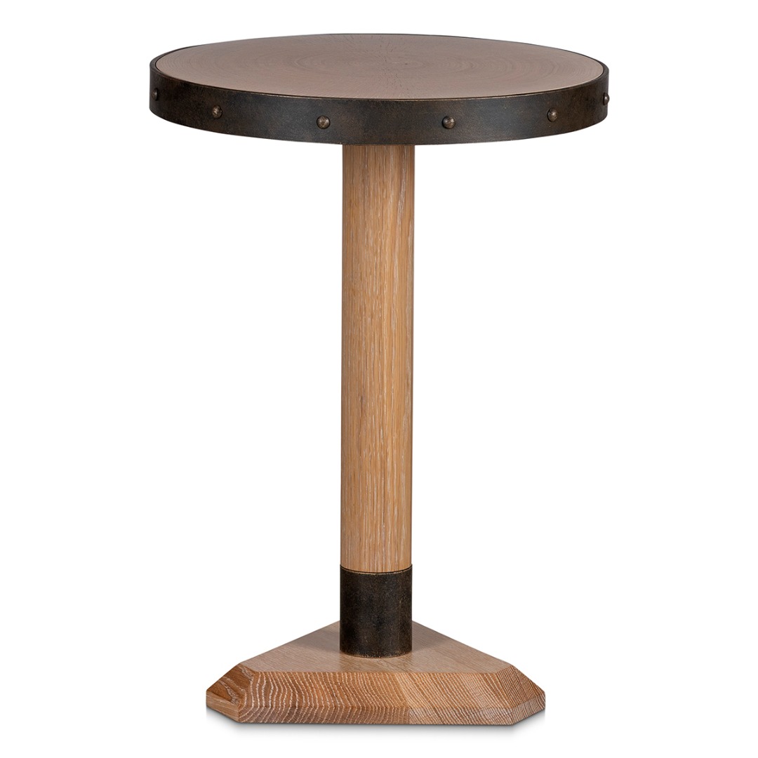 American craftsmanship at its best in this artisanal pedestal occasional table composed of an end grain oak top and post banded with forged steel, standing on a chamfered triangular wood base.