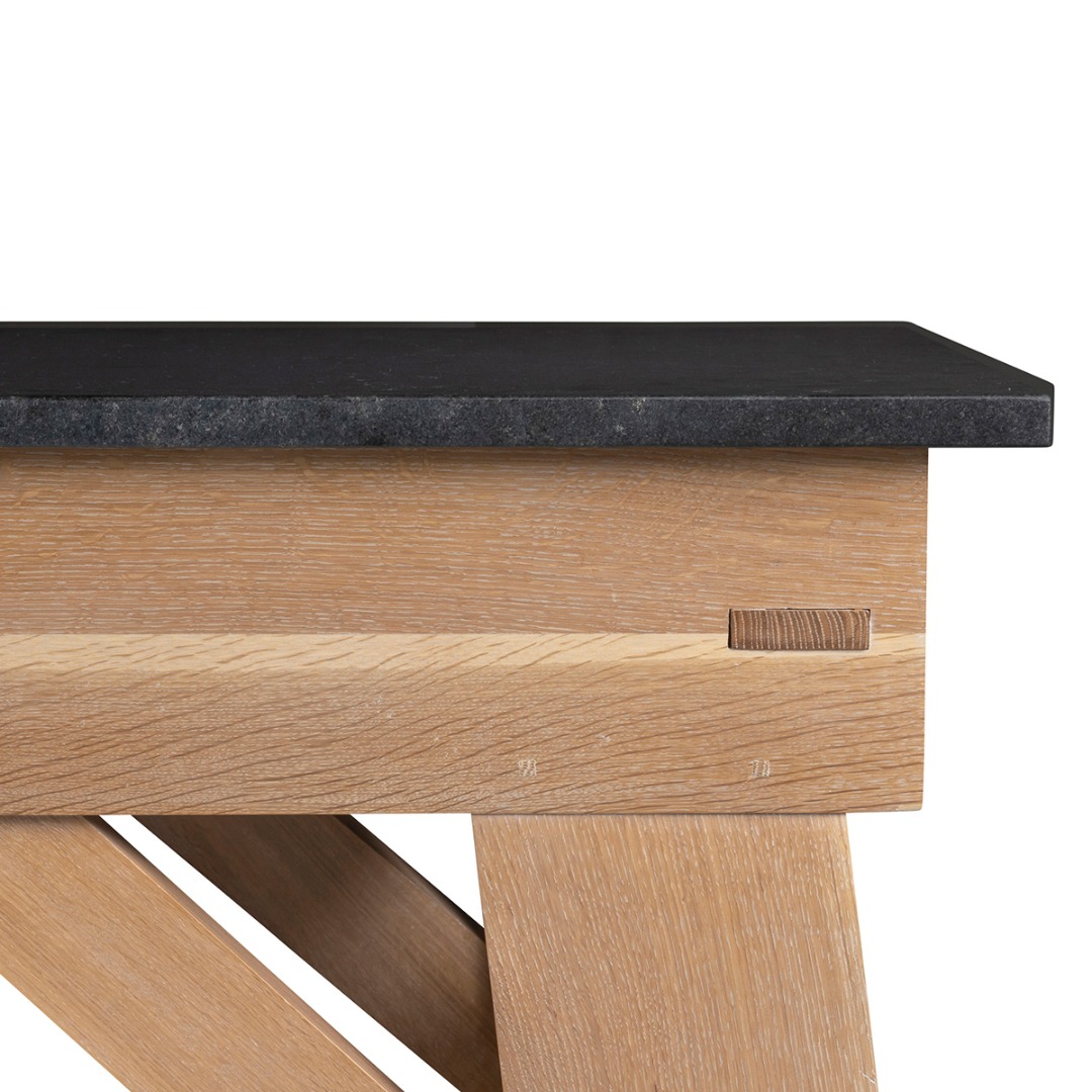 A monumental architectural console based on a nineteenth-century French foundry workbench. The massive oak timbers and two-piece stone slab top convey a sense of strength and permanence.