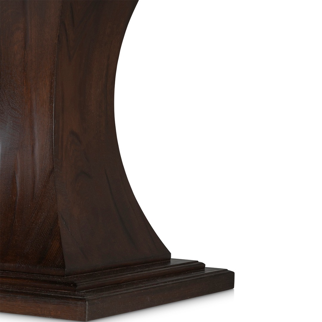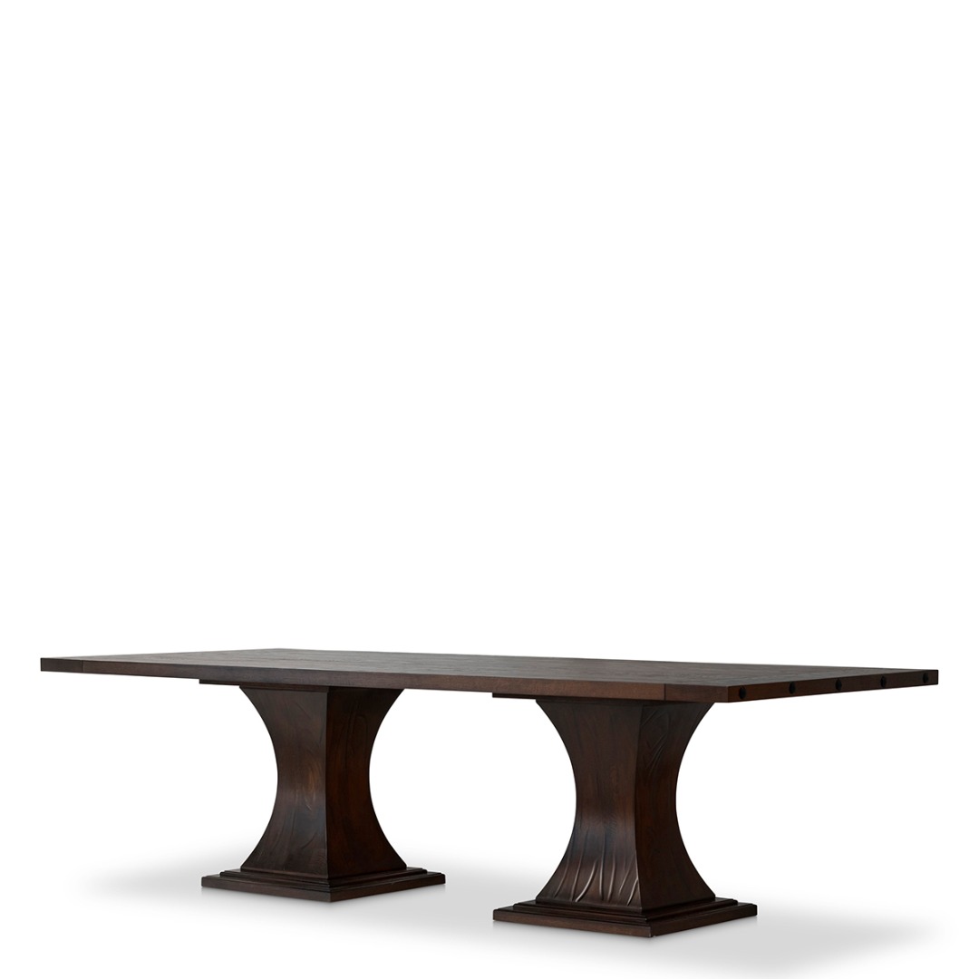 Casual yet elegant, this rectangular dining table has a hand scythed plank top supported by a pair of coved block bases that allow generous legroom for guests. The rustic oak finish and exposed iron bolt heads give the piece a relaxed feel. Finished here in Cerilla, with a solid oak top and cast resin base.