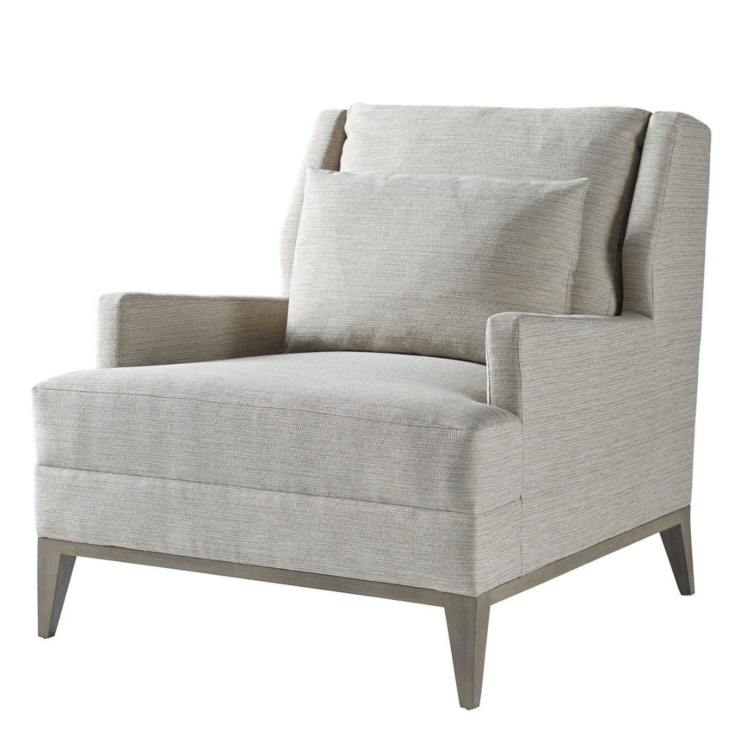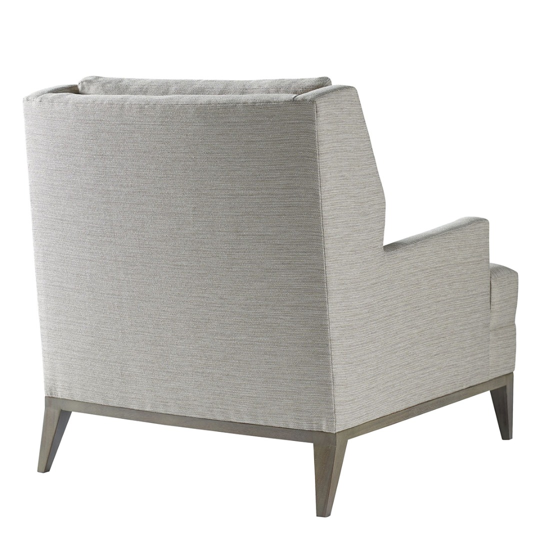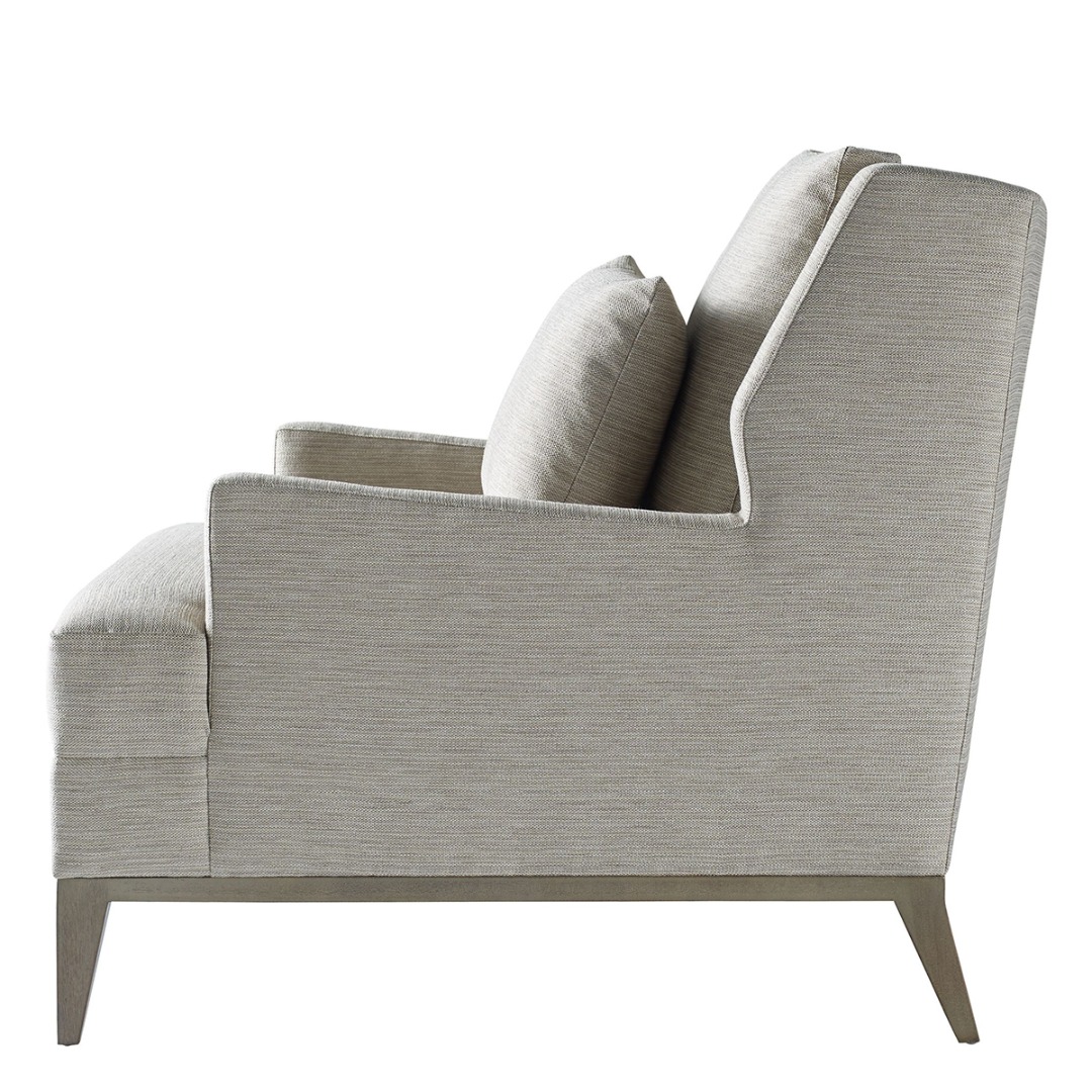 Exposed wood in Mahogany. Tight seat and loose boxed back pillow. Topstitching at outer perimeter of arm and back.