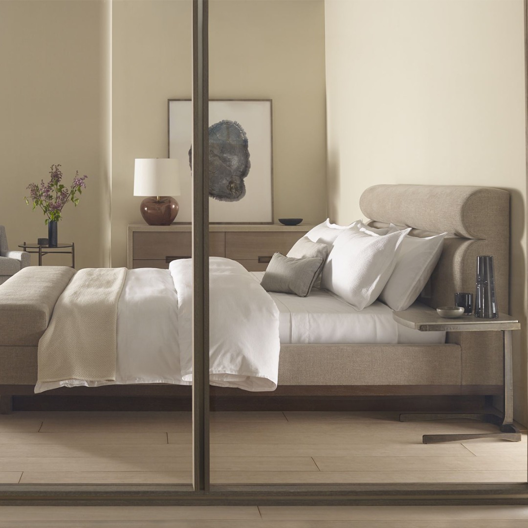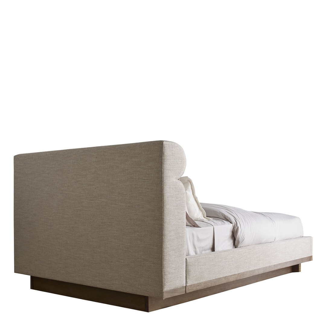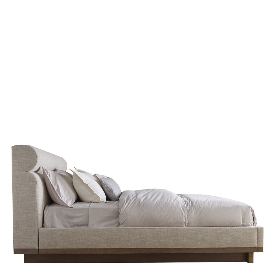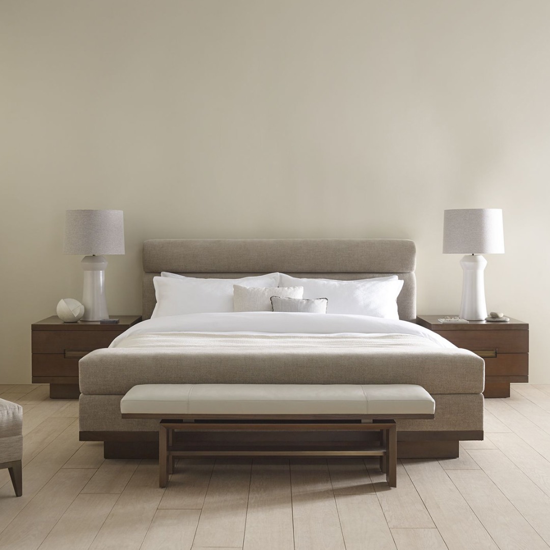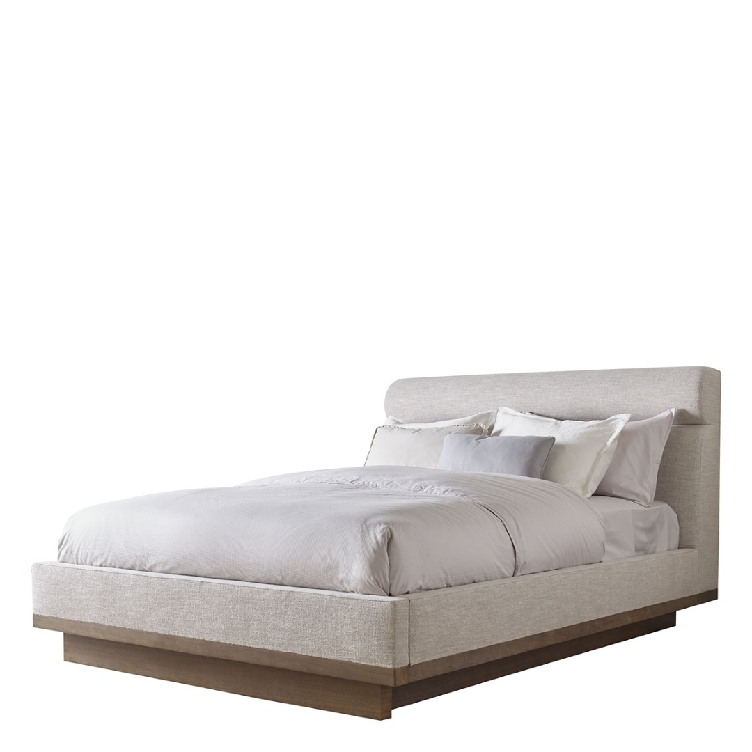 Fully upholstered headboard and rails with simple footboard with micro-welt at mahogany base. Also avaialble with integrated bench at base. A variety of stains available.