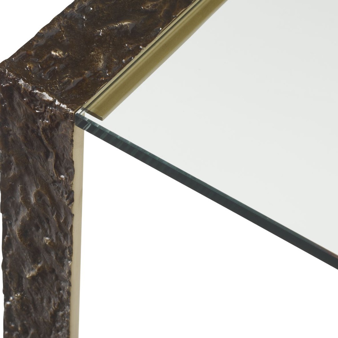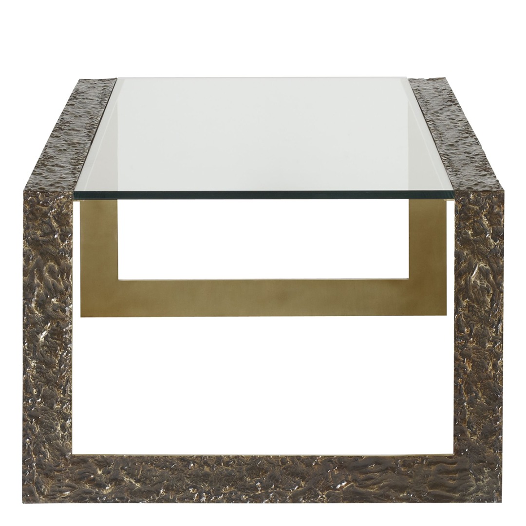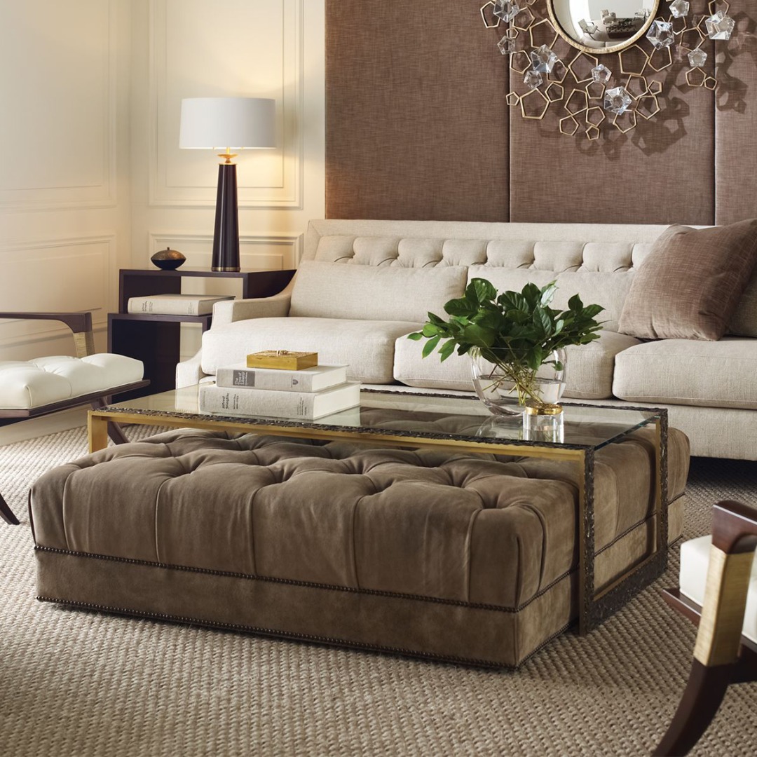 Cast Brass base with clear glass top with an organic bronze finish. This table works perfectly with the large deep buttoned ottoman from the Thomas Pheasant collection.
