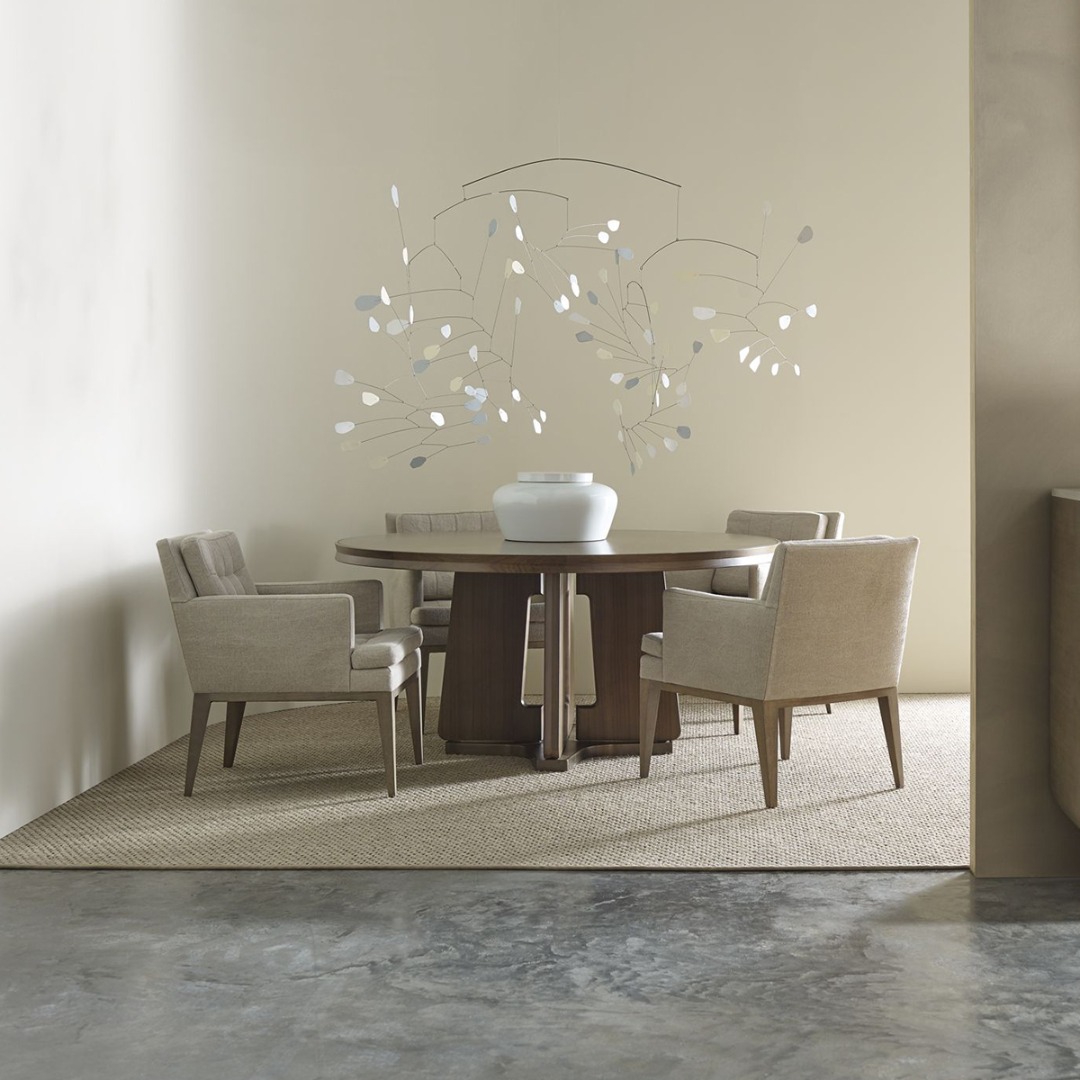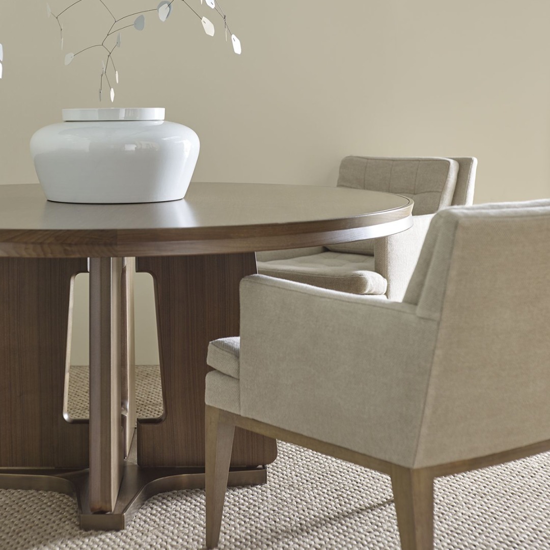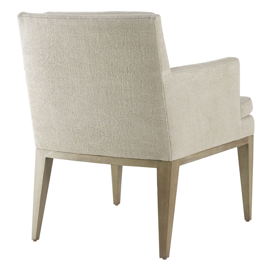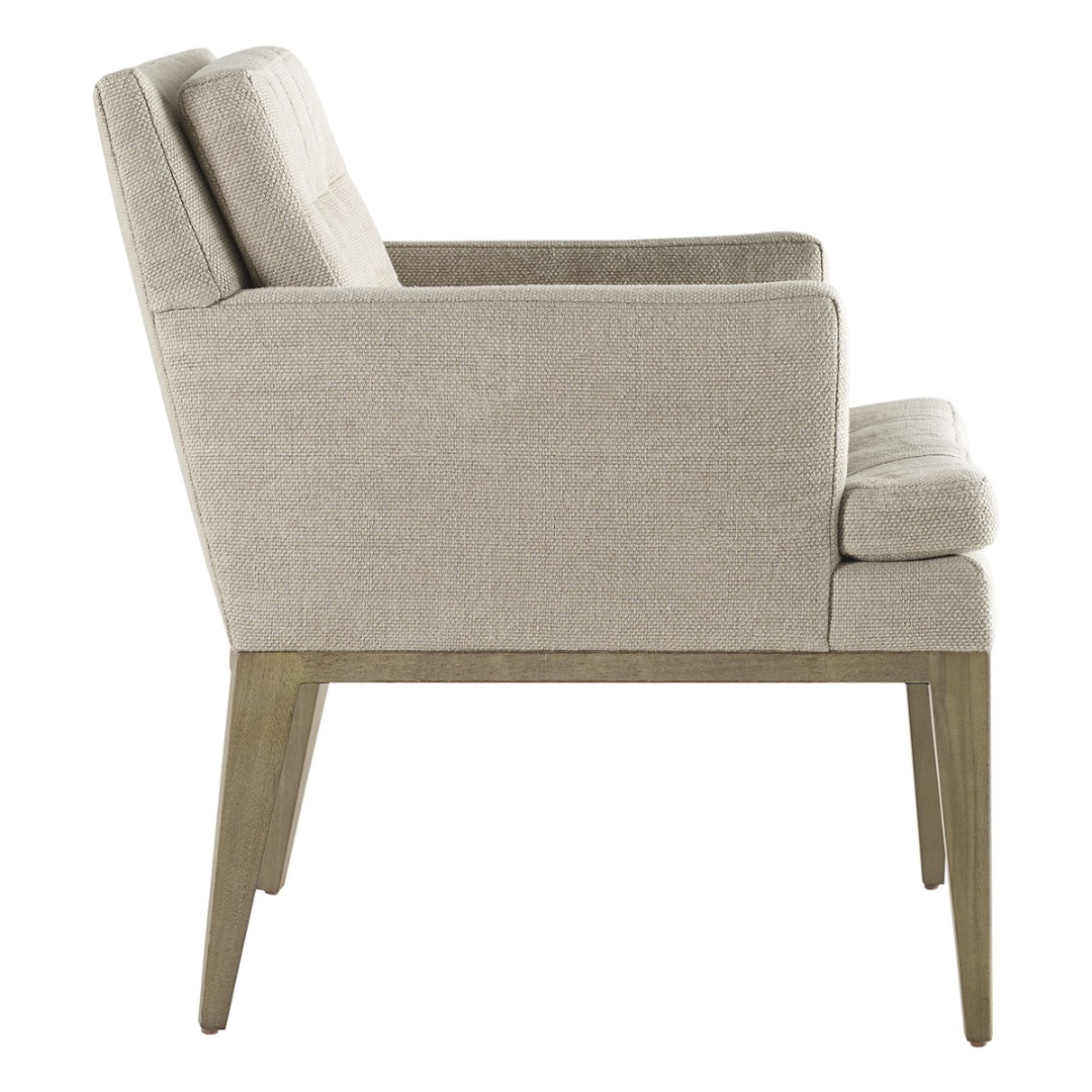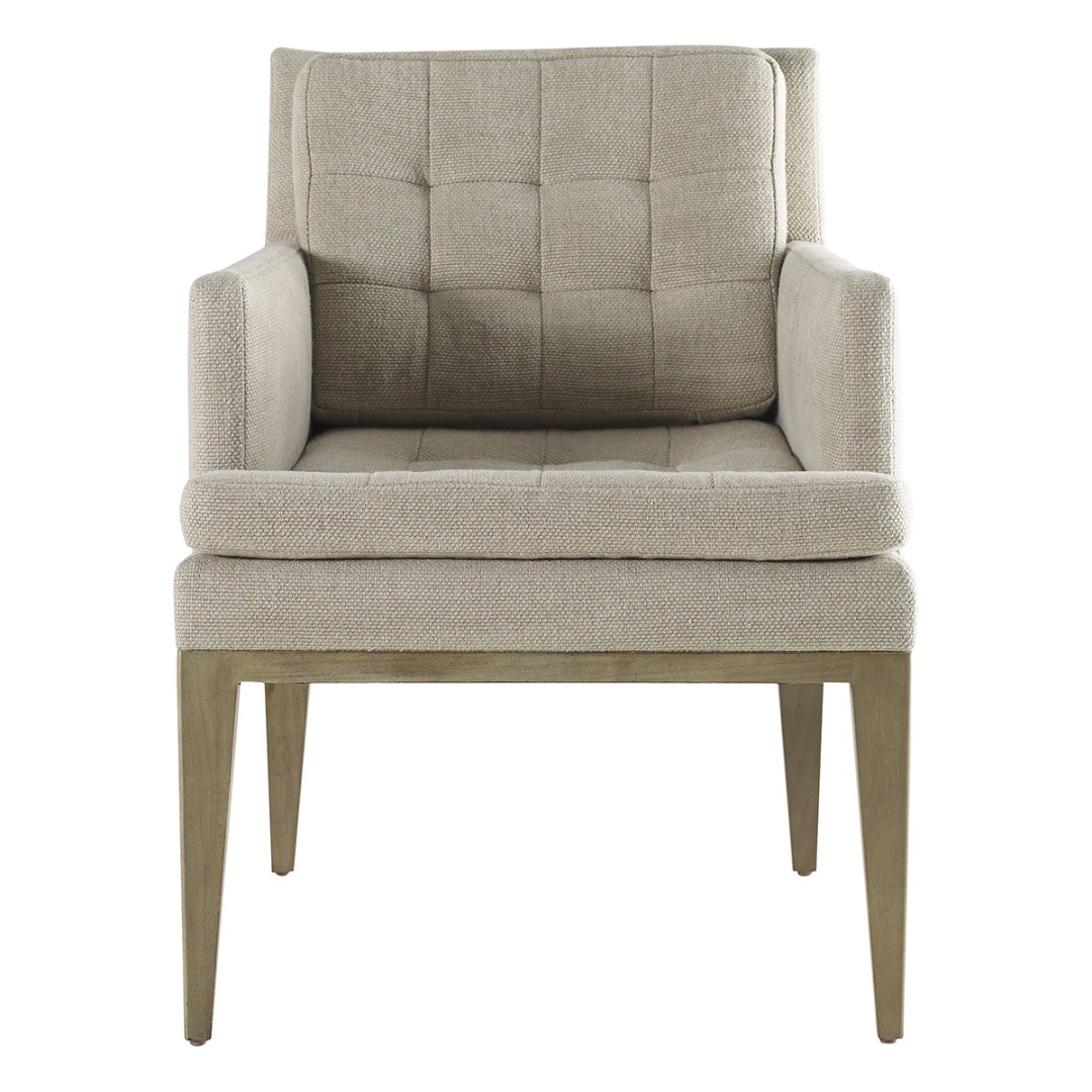 Upholstered dining armchair with semi-attached seat and back cushion with pin tufting. Mahogany frame available in a variety of stains and finishes.