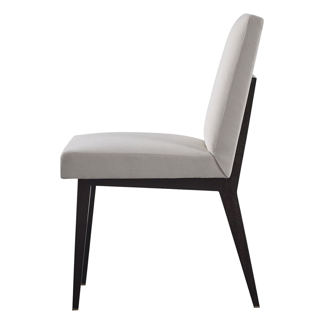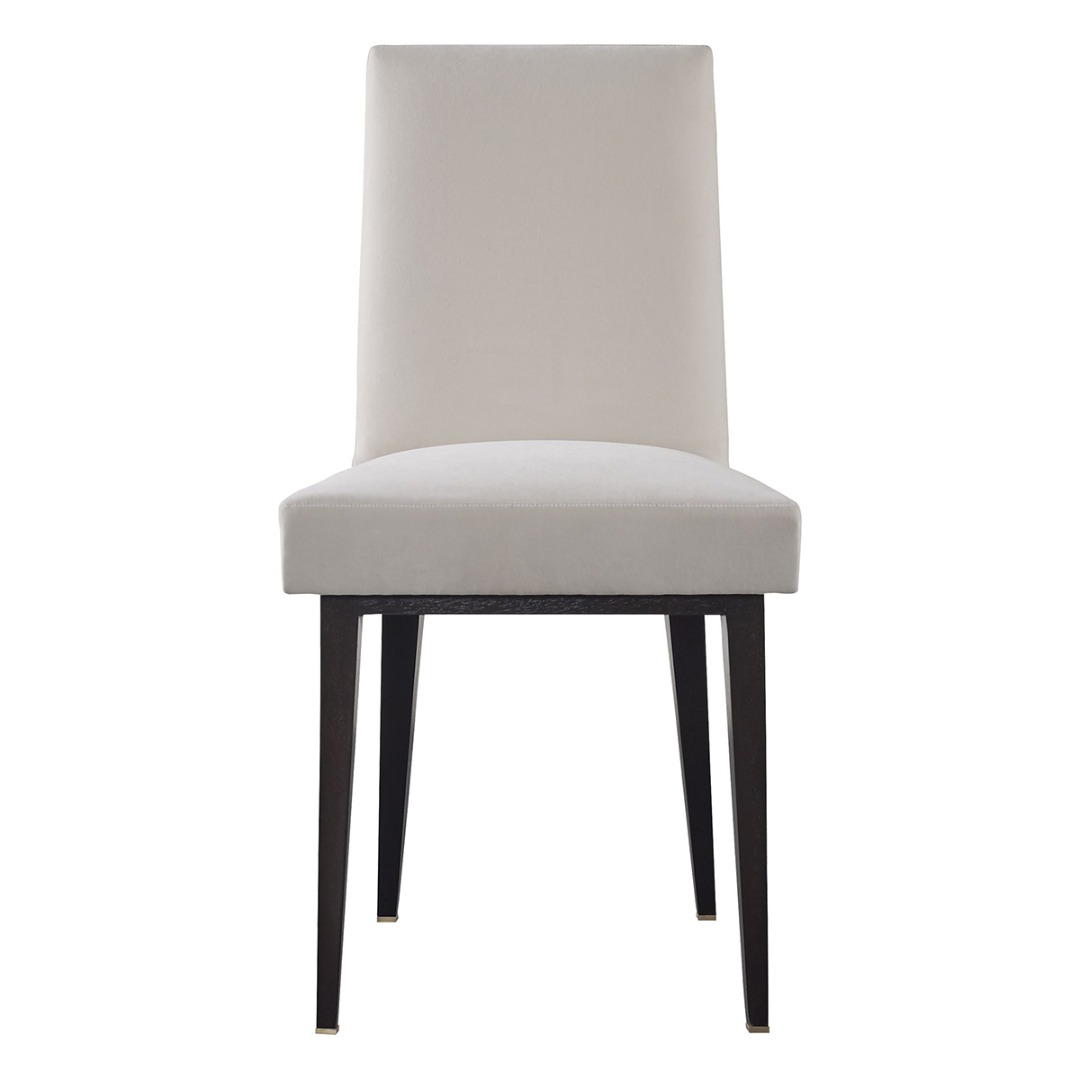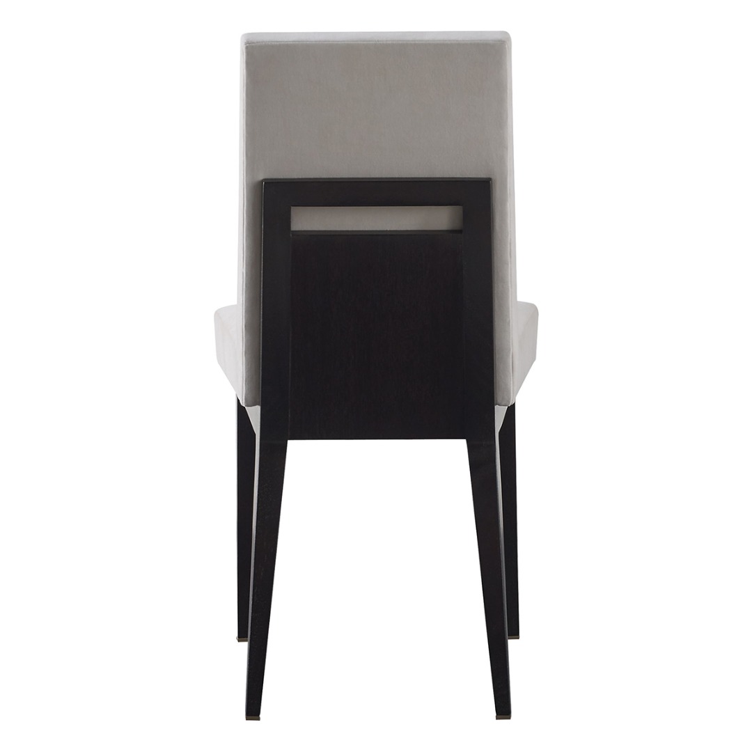 Dining chair frame in Mahogany with brass accents. standard finish in Caviar or Luxe. Metal accents in Bright Bronze finish.
