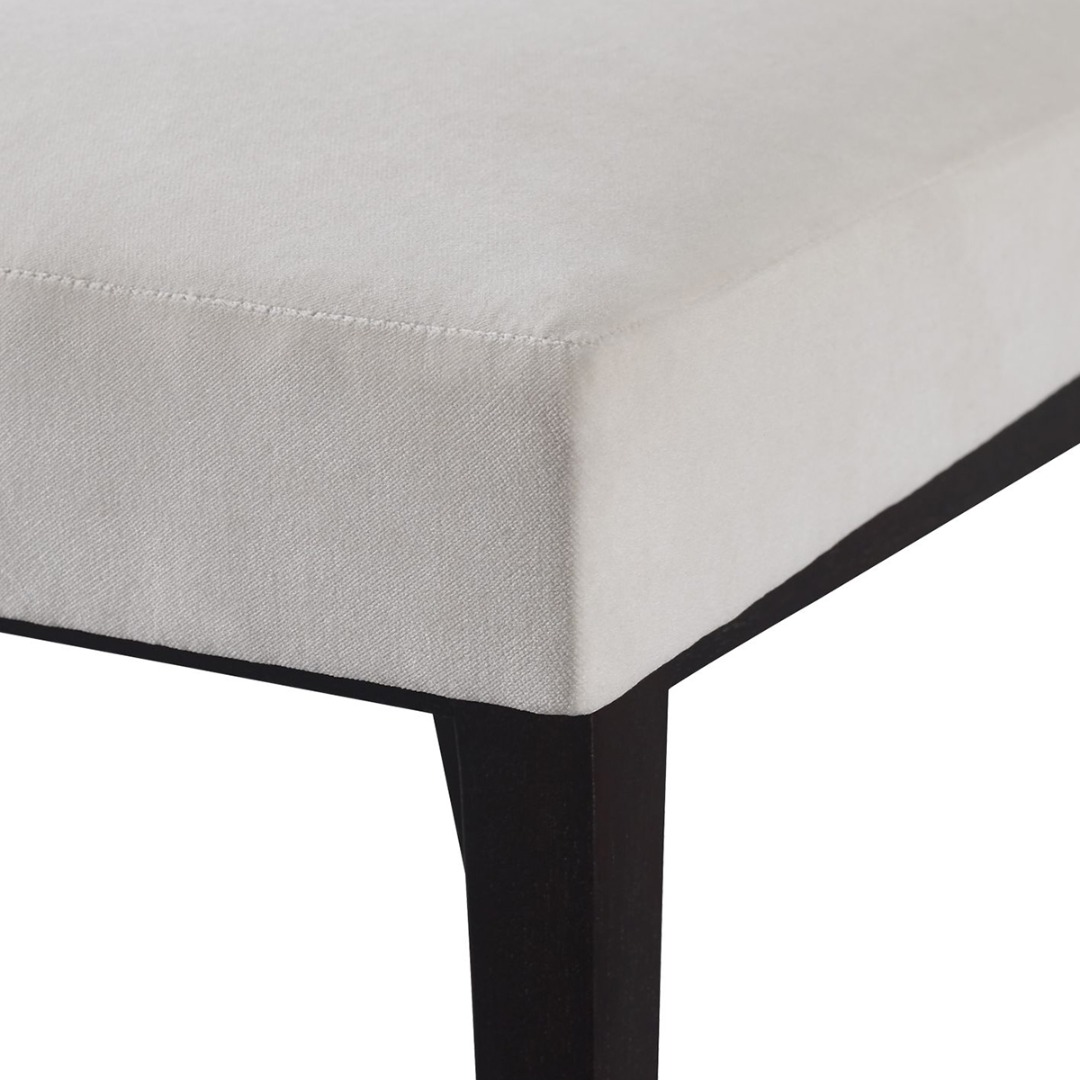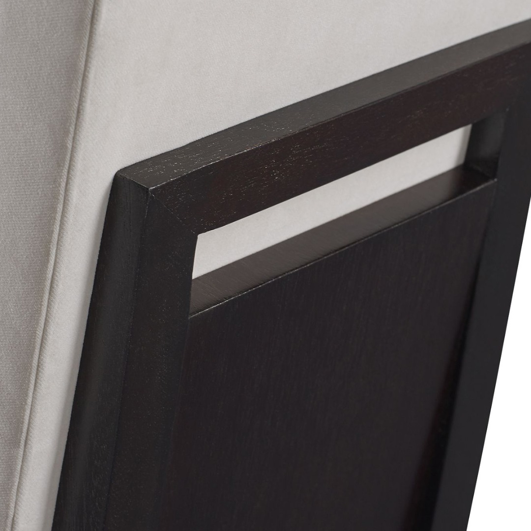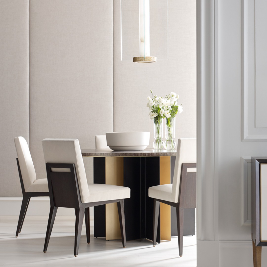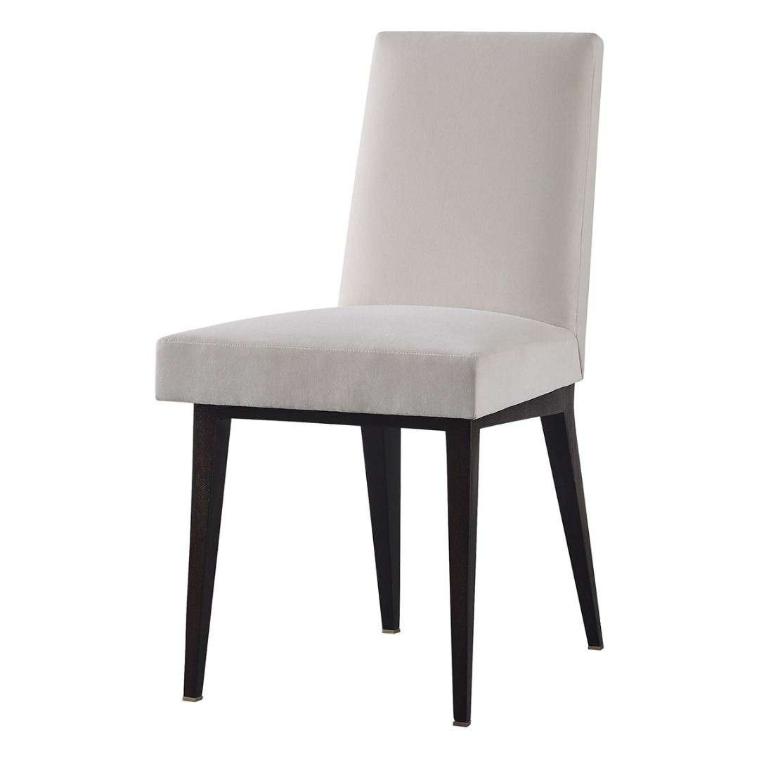 Dining chair frame in Mahogany with brass accents. standard finish in Caviar or Luxe. Metal accents in Bright Bronze finish.