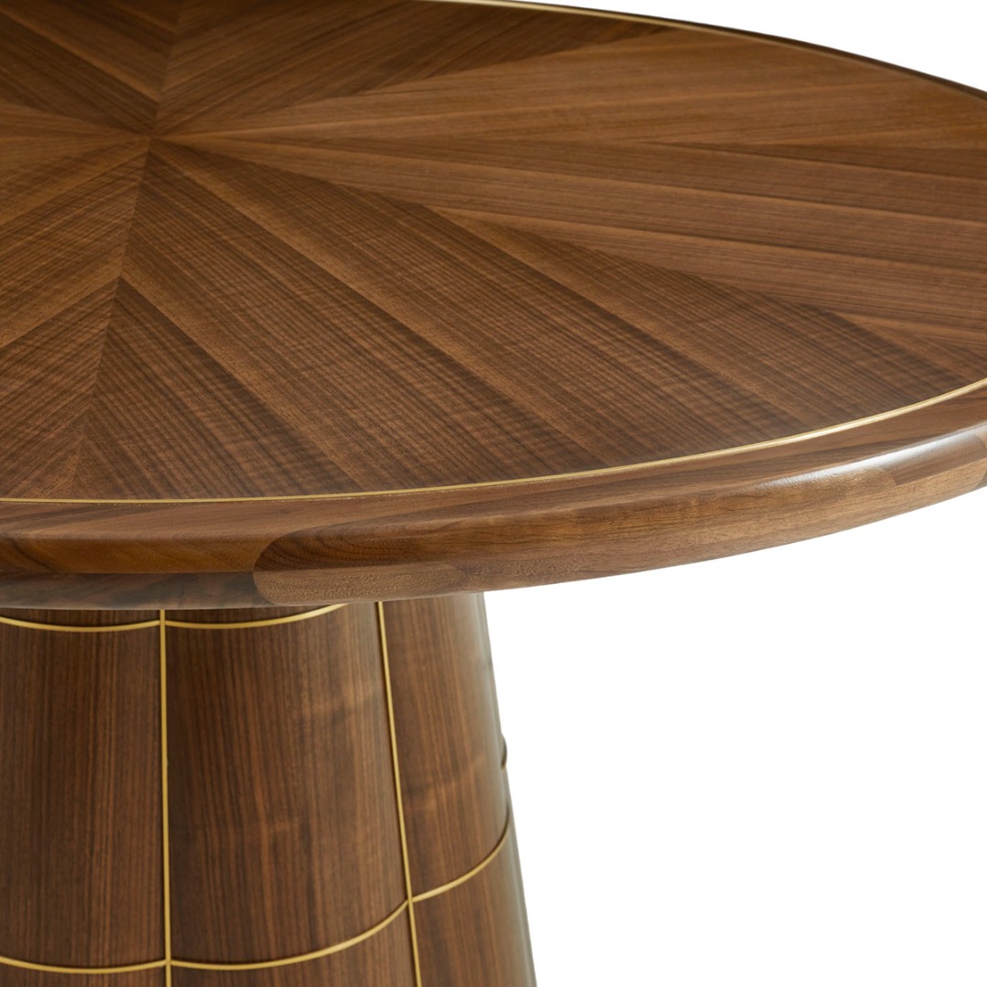 Quartered figured walnut veneer pedestal dining table. Topped with a 60" diameter sunburst patterned quartered figured walnut veneer top. Brass inlay on top and base.
