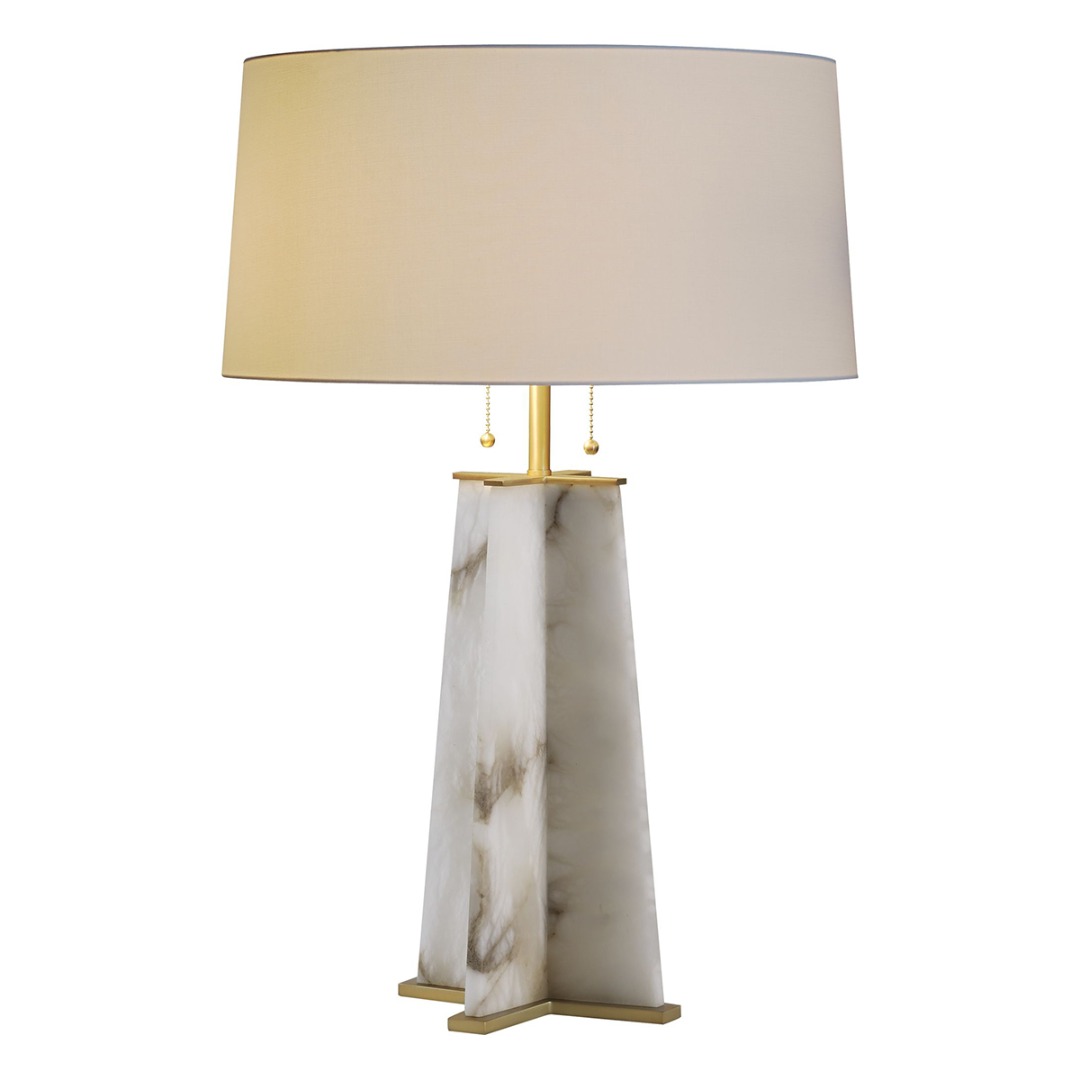Alabaster and Brass body. Sand cotton shade. Silver fabric power cord with cord switch. Two 60 watt medium base bulbs required.