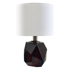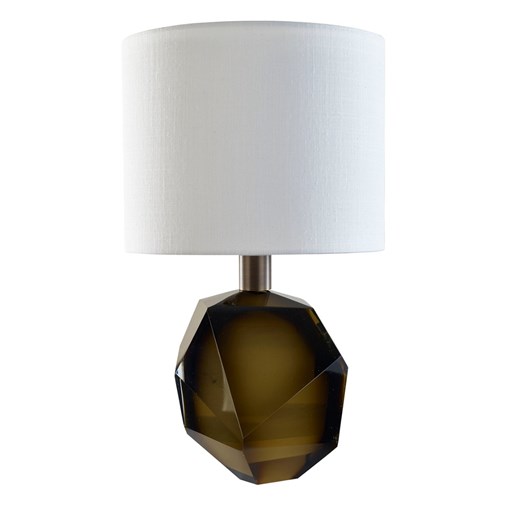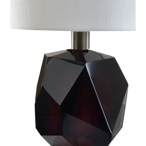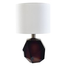 Solid Murano glass lamp base with brass details and brown fabric cord. Available in deep Topaz or amethyst. White linen shade with diffuser.