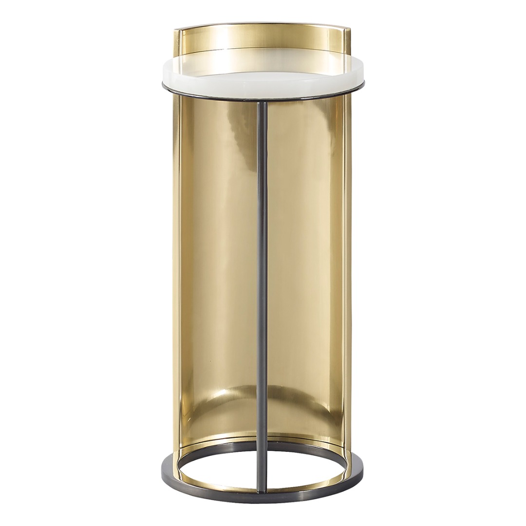 Brass Shield. Chocolate Metal Base. Choice Metal Shield. White Onyx Top.