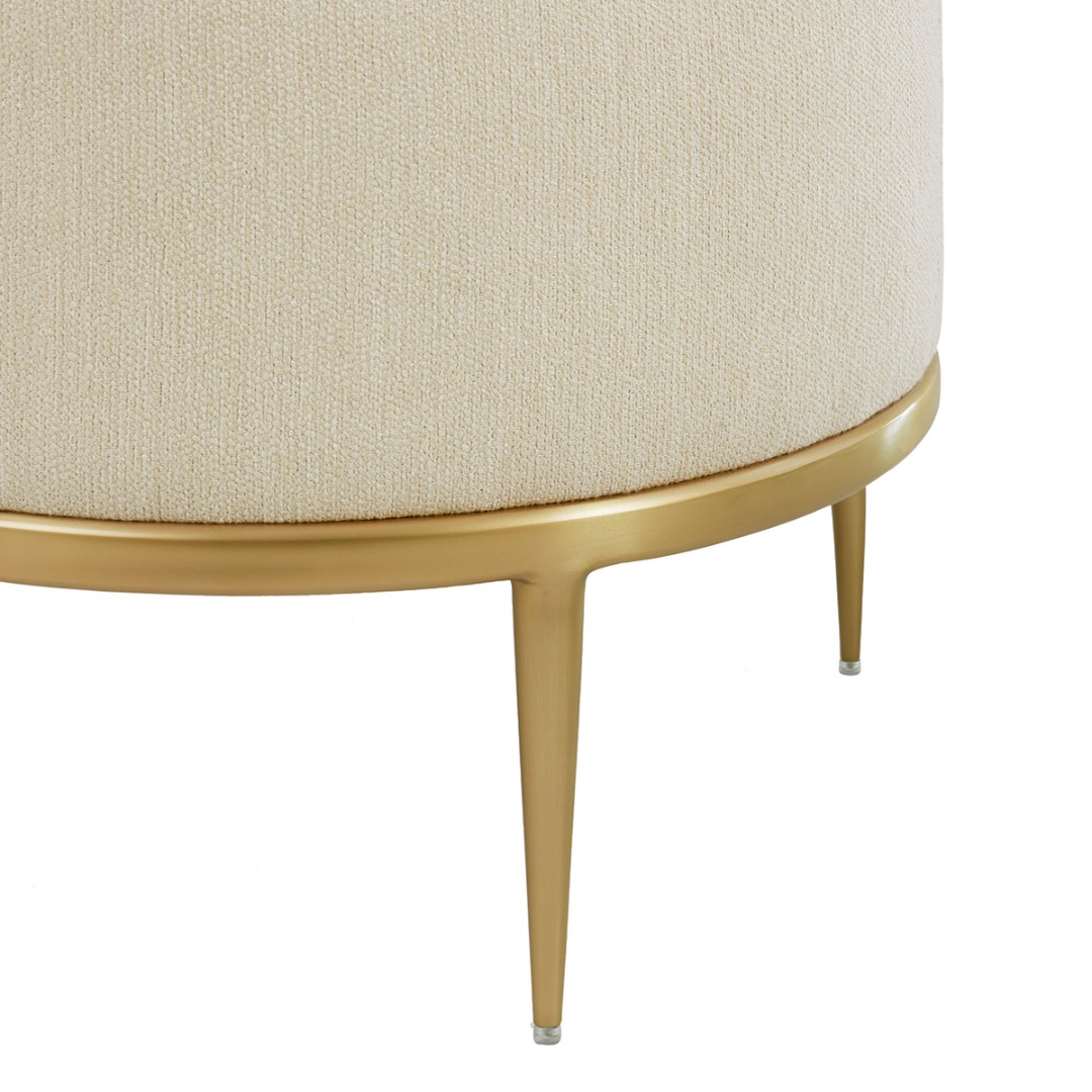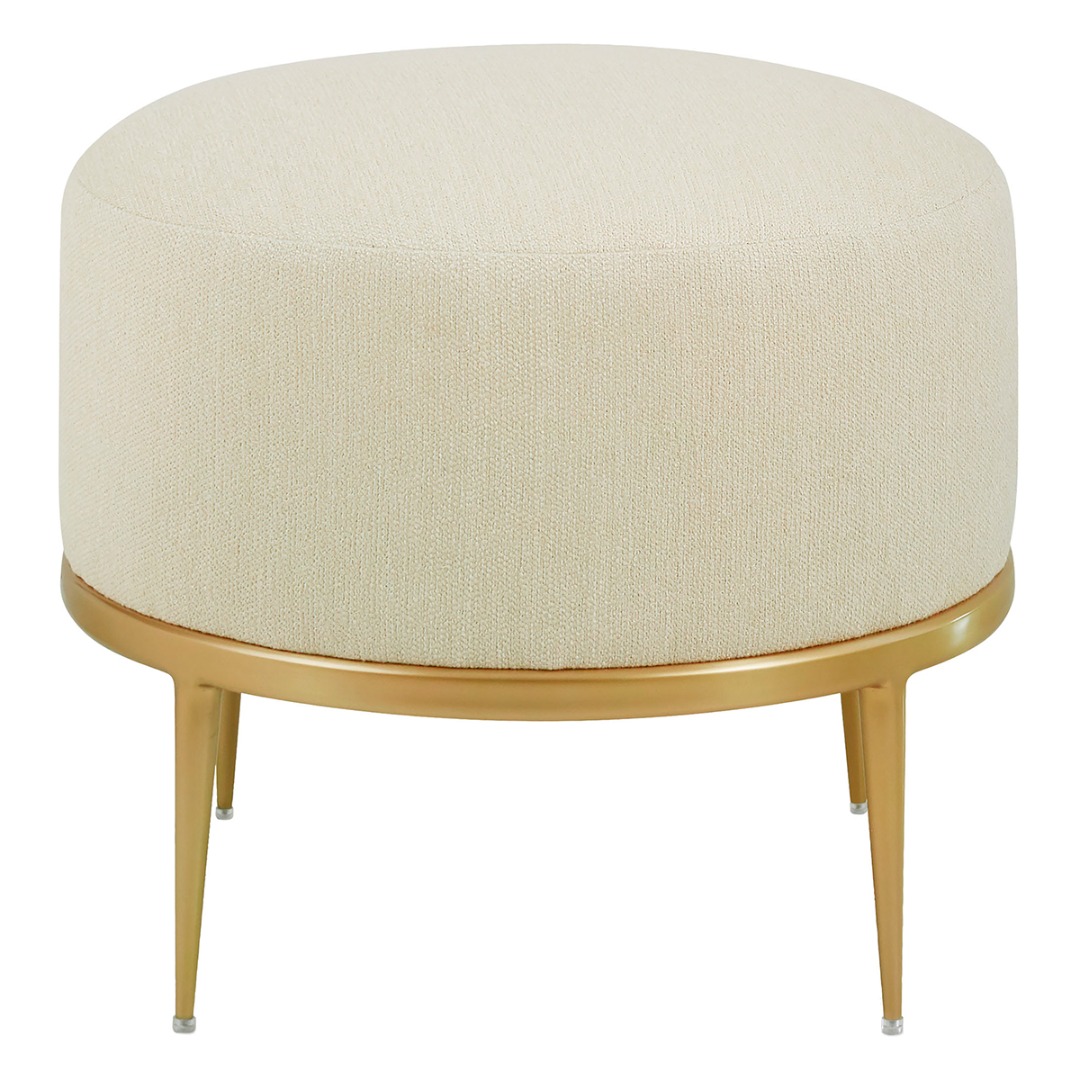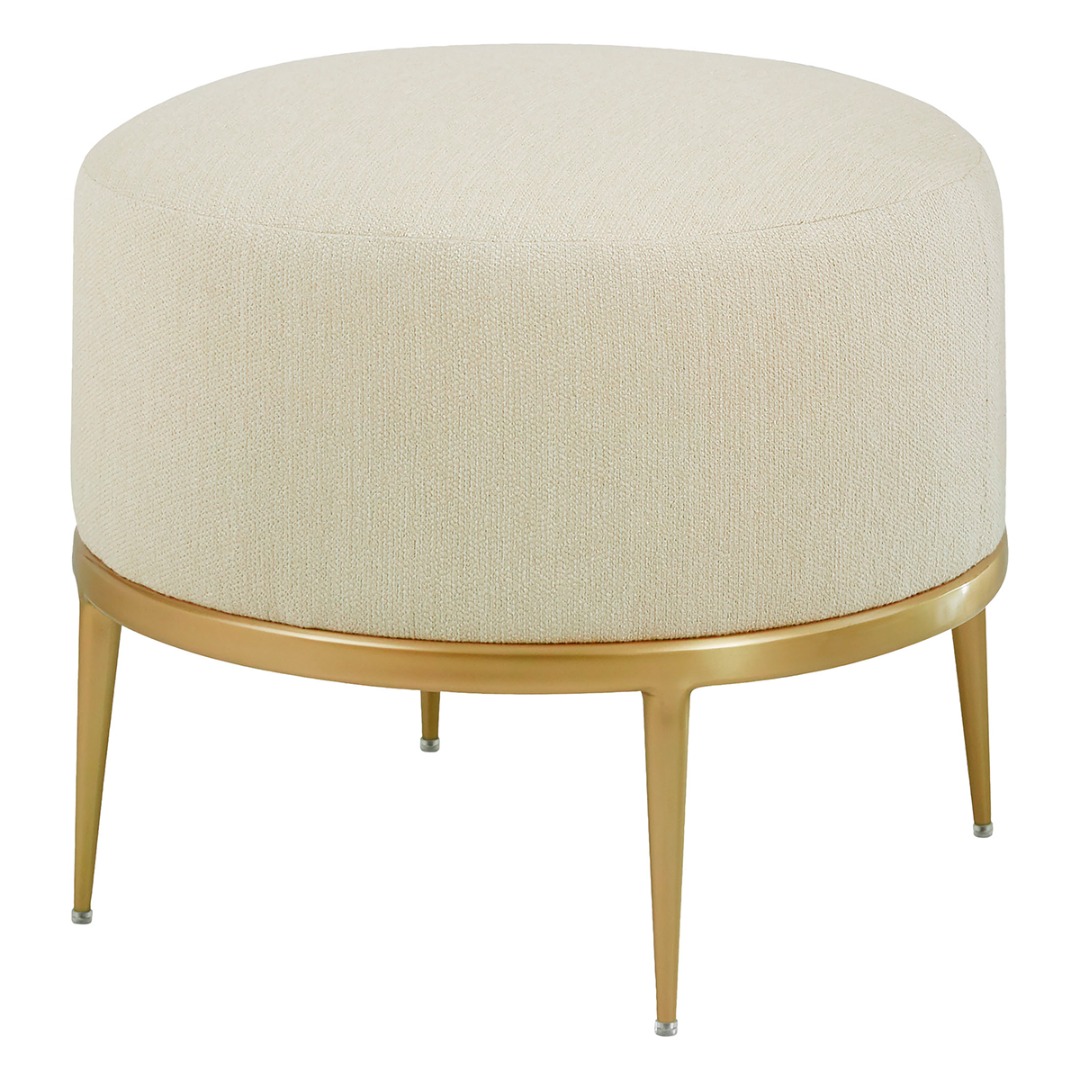 The Colette Ottoman’s gentle curves and circular shape make it a fit for any room, from the dressing area to the bedroom and beyond. A curved bronze band and conical tapered legs support a circle of tight upholstery.