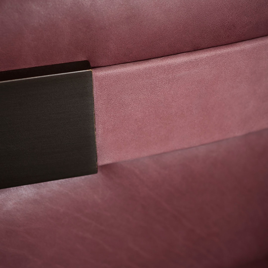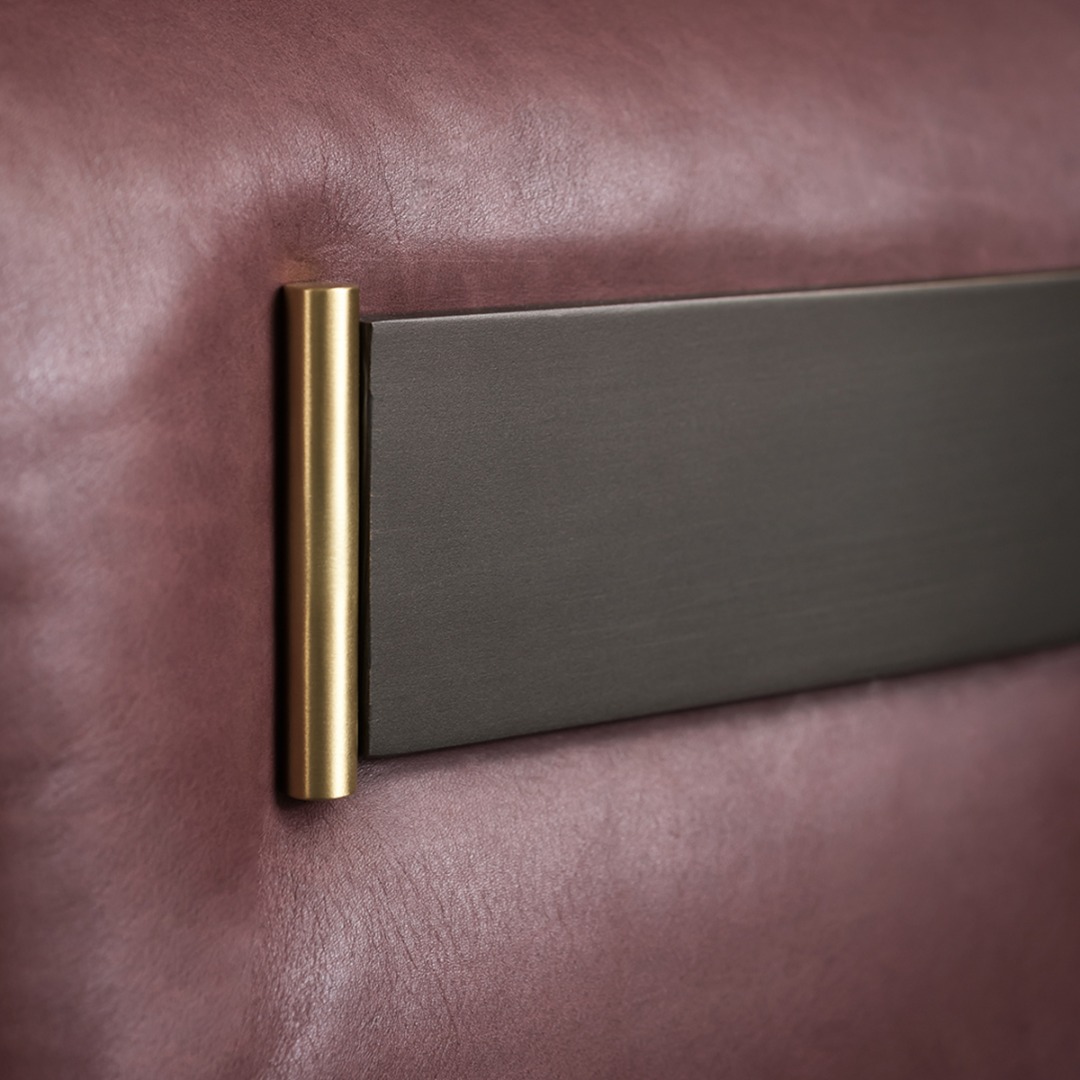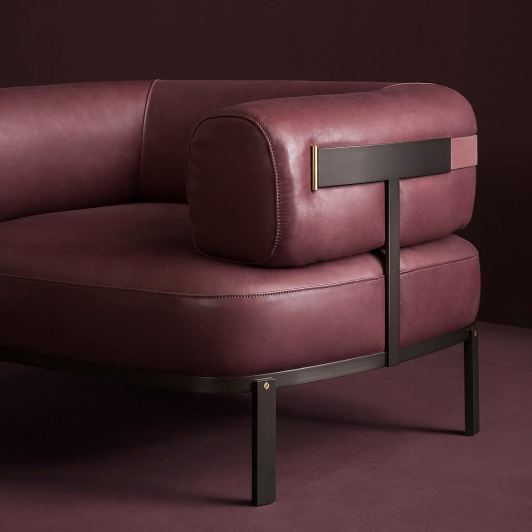 Patinated bronze-varnished metal frame. Seat and back frame in birch plywood. Seat and back cushions available in soft leathers only.