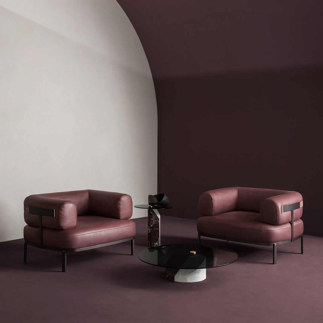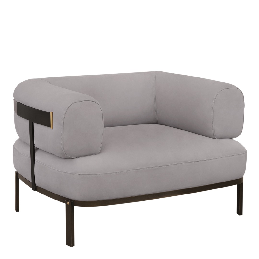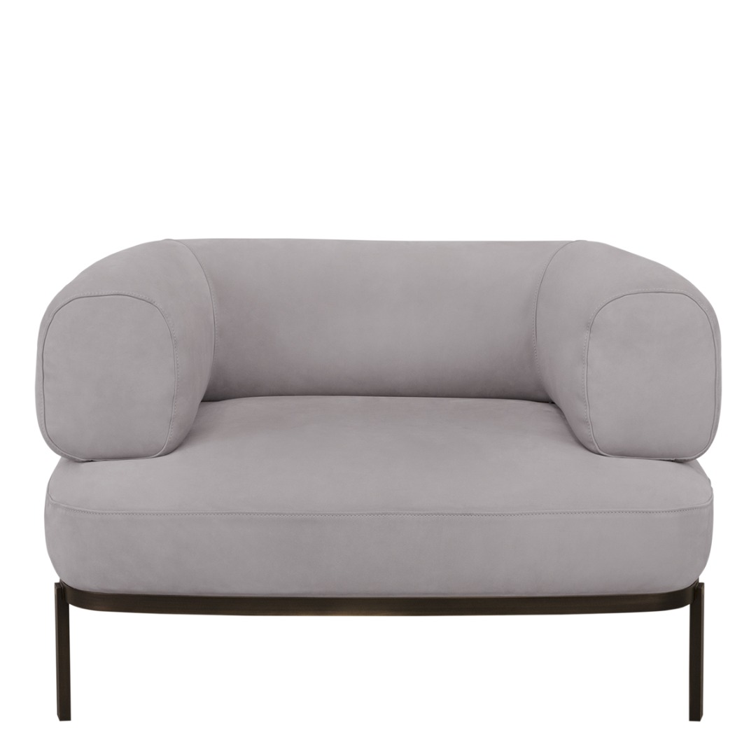Patinated bronze-varnished metal frame. Seat and back frame in birch plywood. Seat and back cushions available in soft leathers only.