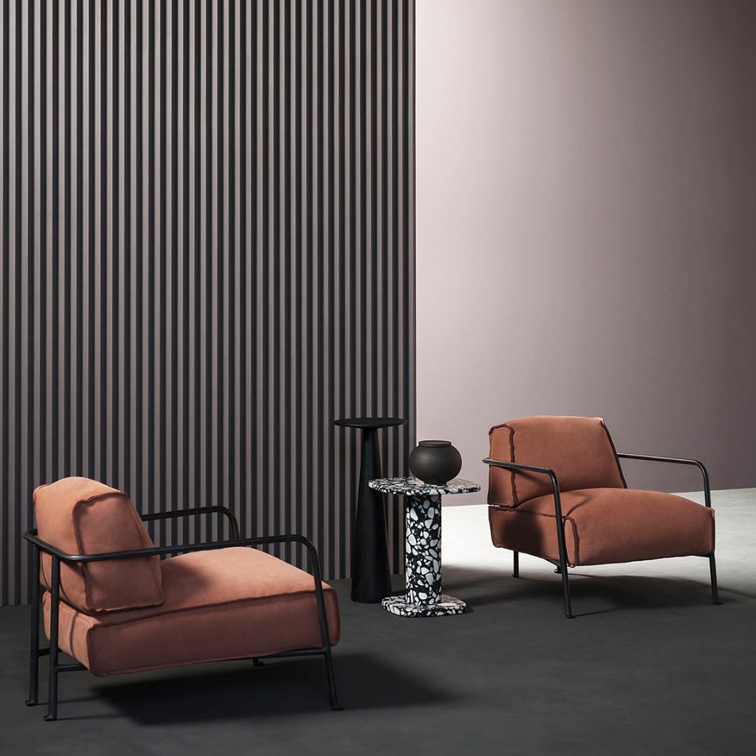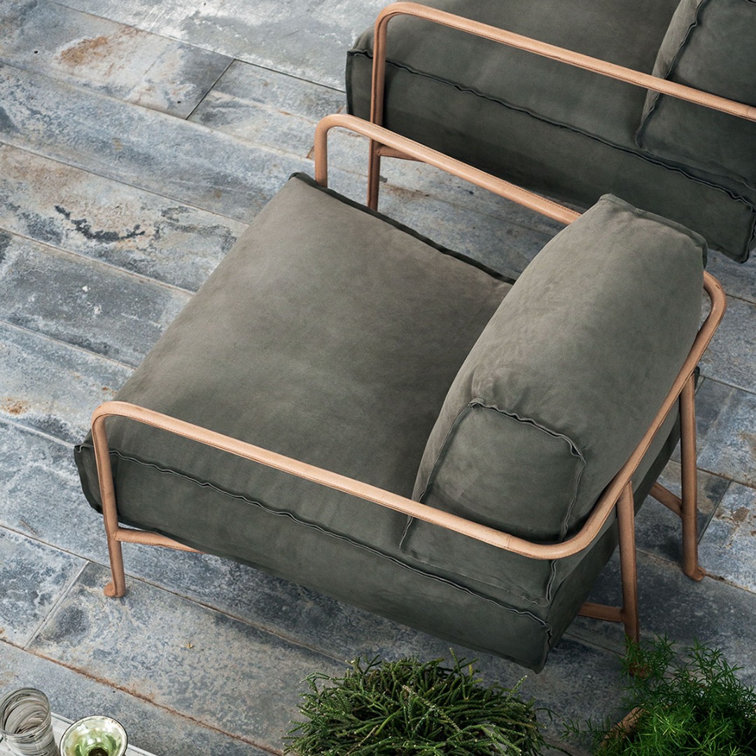 Tubular metal frame covered with natural or anthracite leather. Seat and back cushions in differentiated density polyurethane foam. Springing with woven elastic straps of covered rubber. Poplar plywood inner structure.