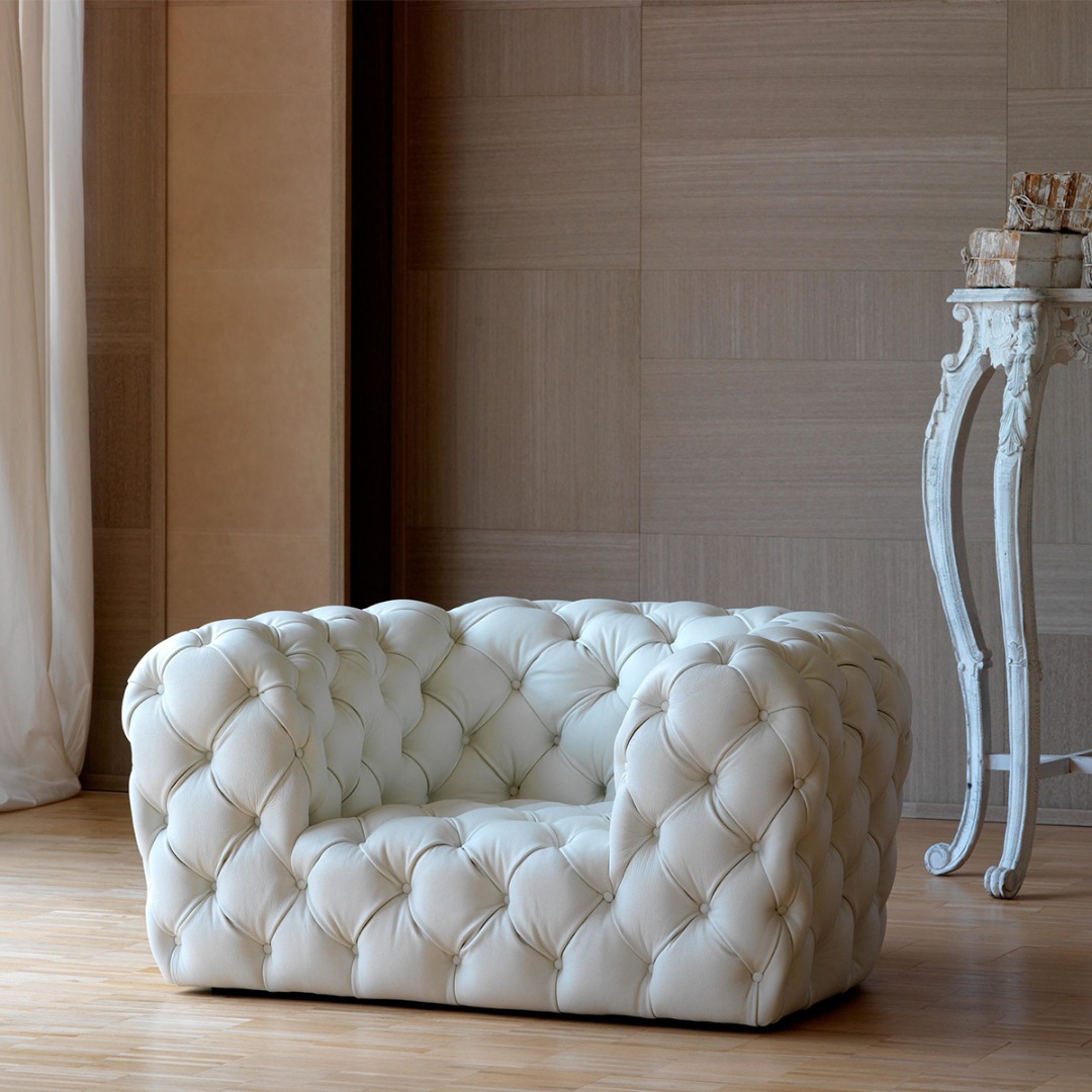 Quilted button back model. Structure in fir plywood. Seat frame in fir. Base in wengé-stained beech.