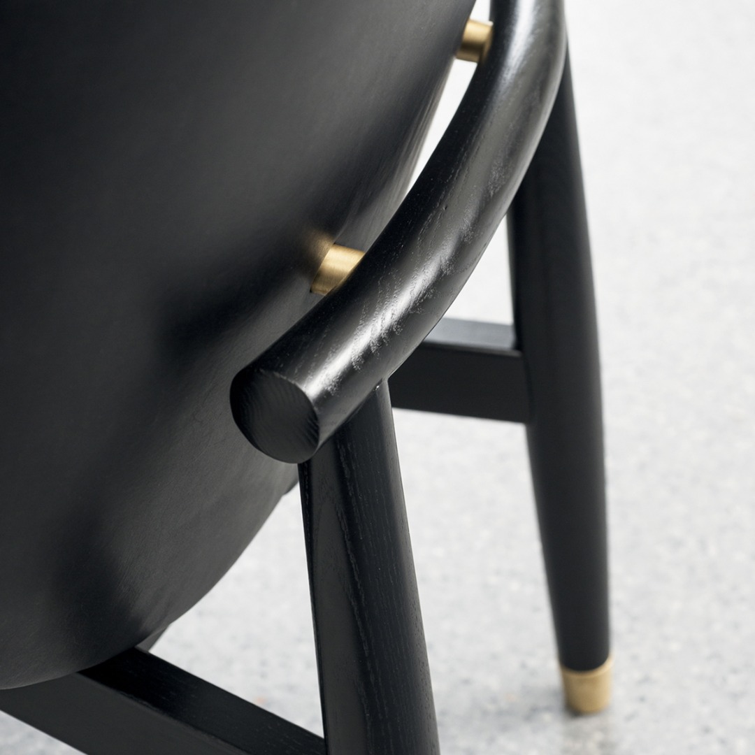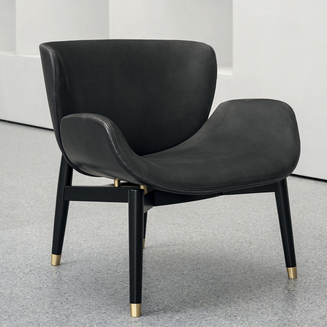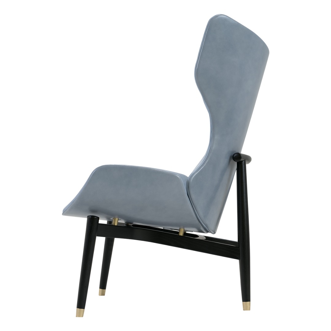 Backrest frame in birch plywood. Feet end in satin brass, hand-finished burnished metal or satin nickeled metal, with matte varnish. Inner back and seat available in soft leathers only.