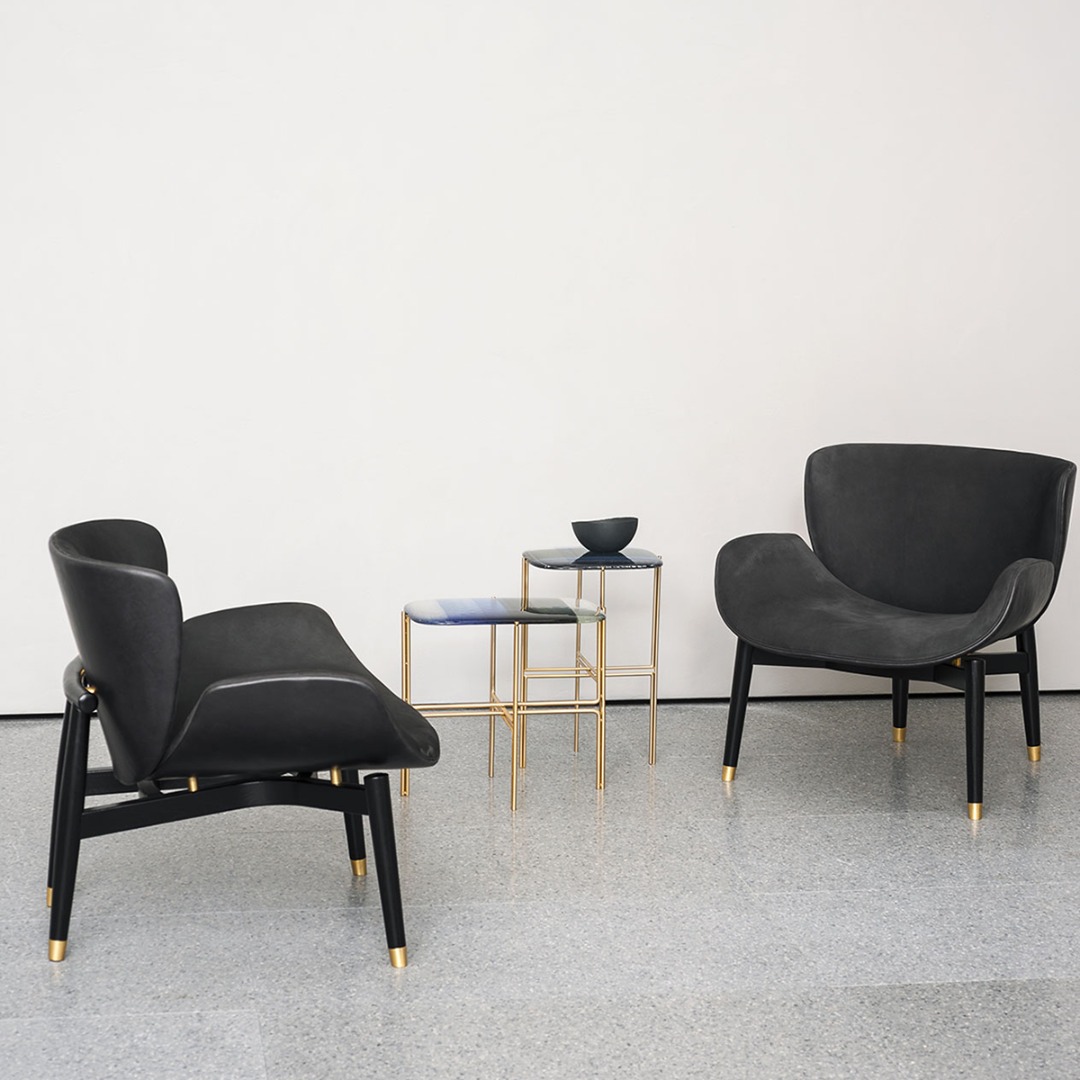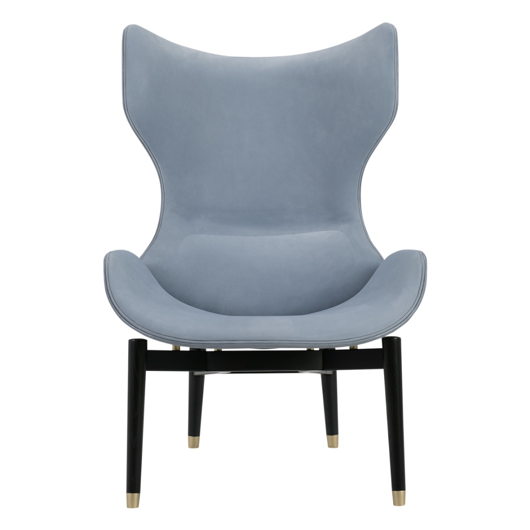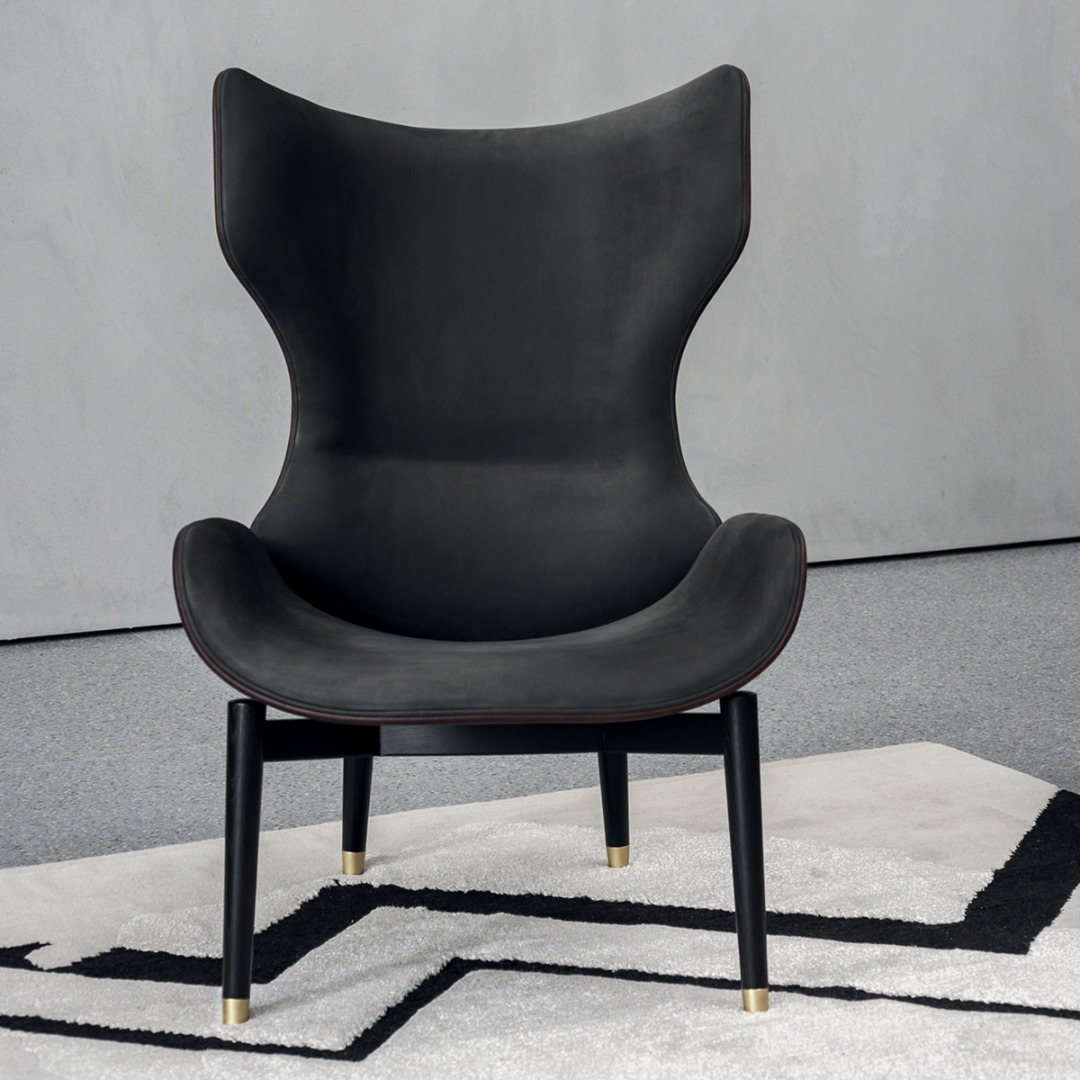 Backrest frame in birch plywood. Feet end in satin brass, hand-finished burnished metal or satin nickeled metal, with matte varnish. Inner back and seat available in soft leathers only.