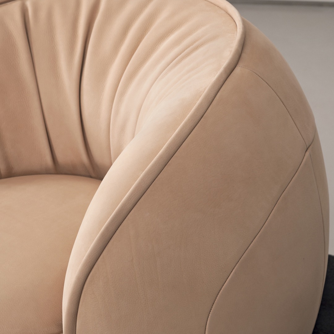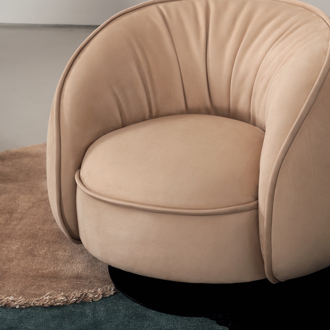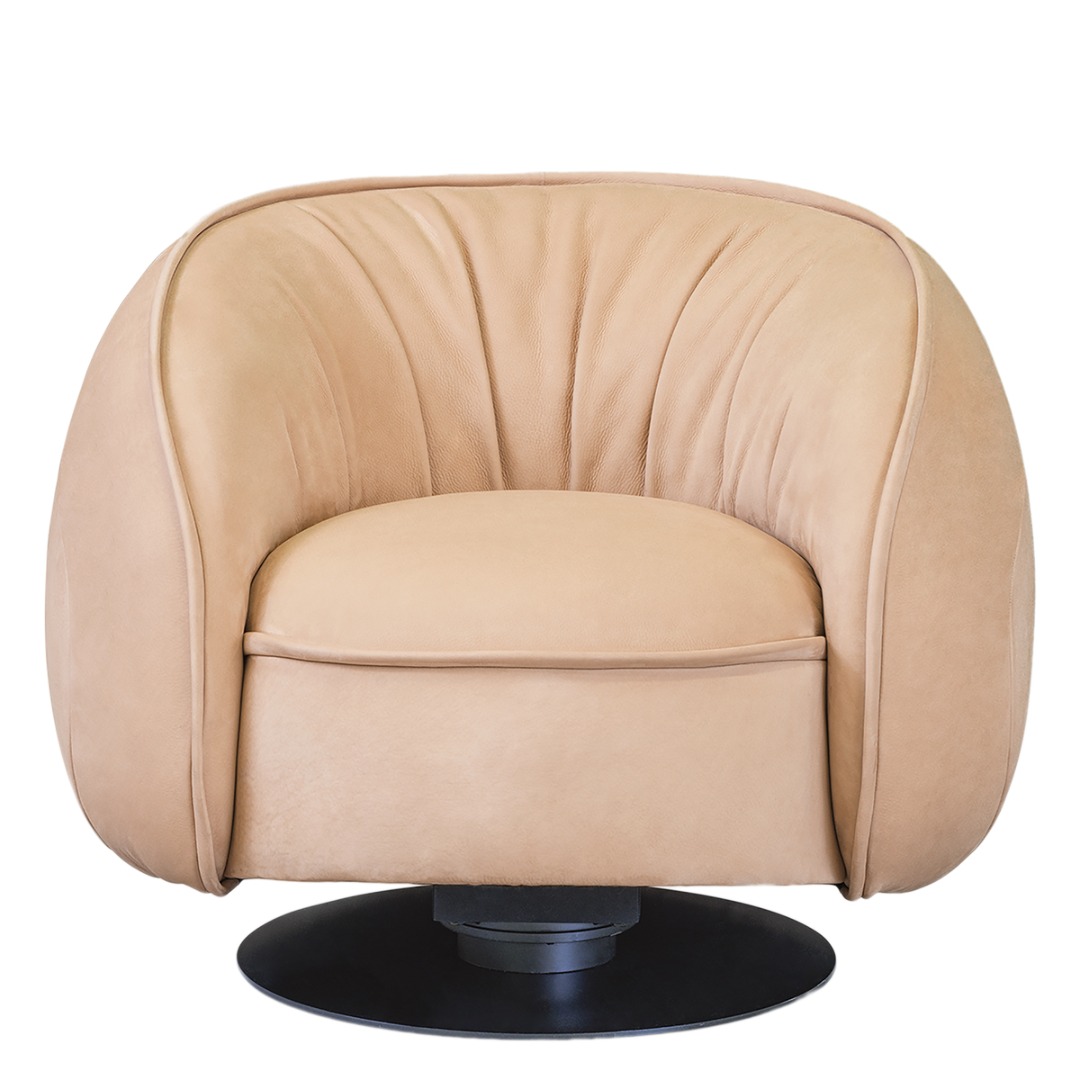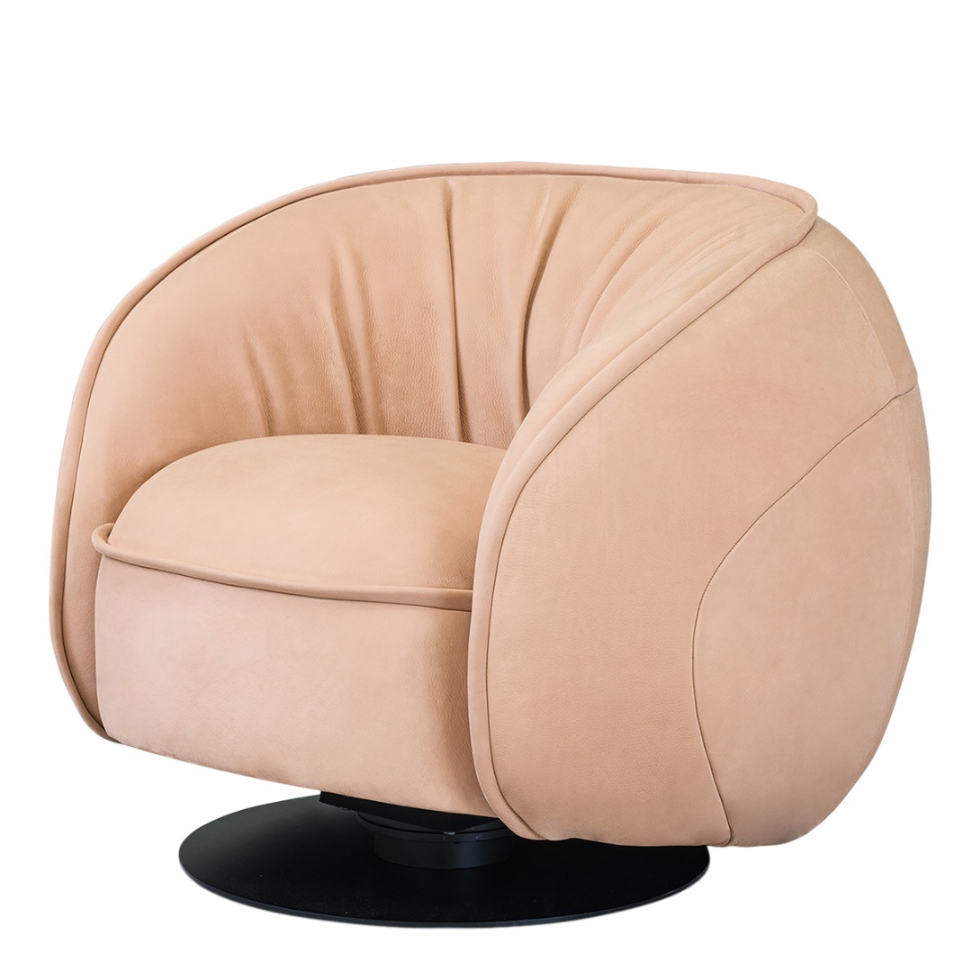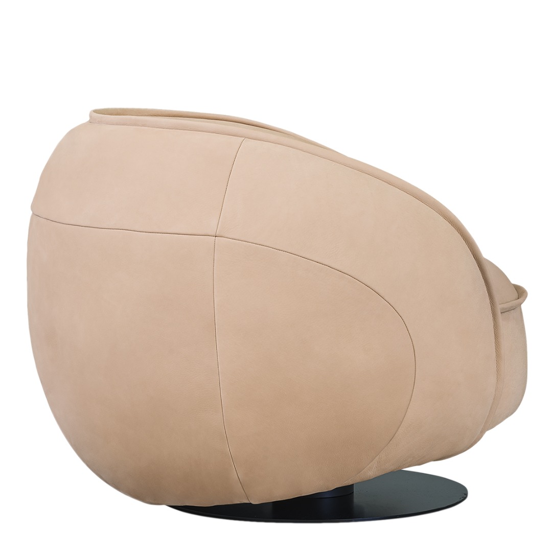 MDF plywood frame. Black-stained underbody base. Armchair with hand-finished burnished metal revolving base.