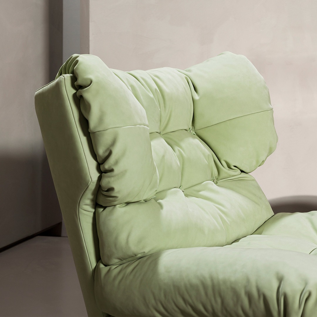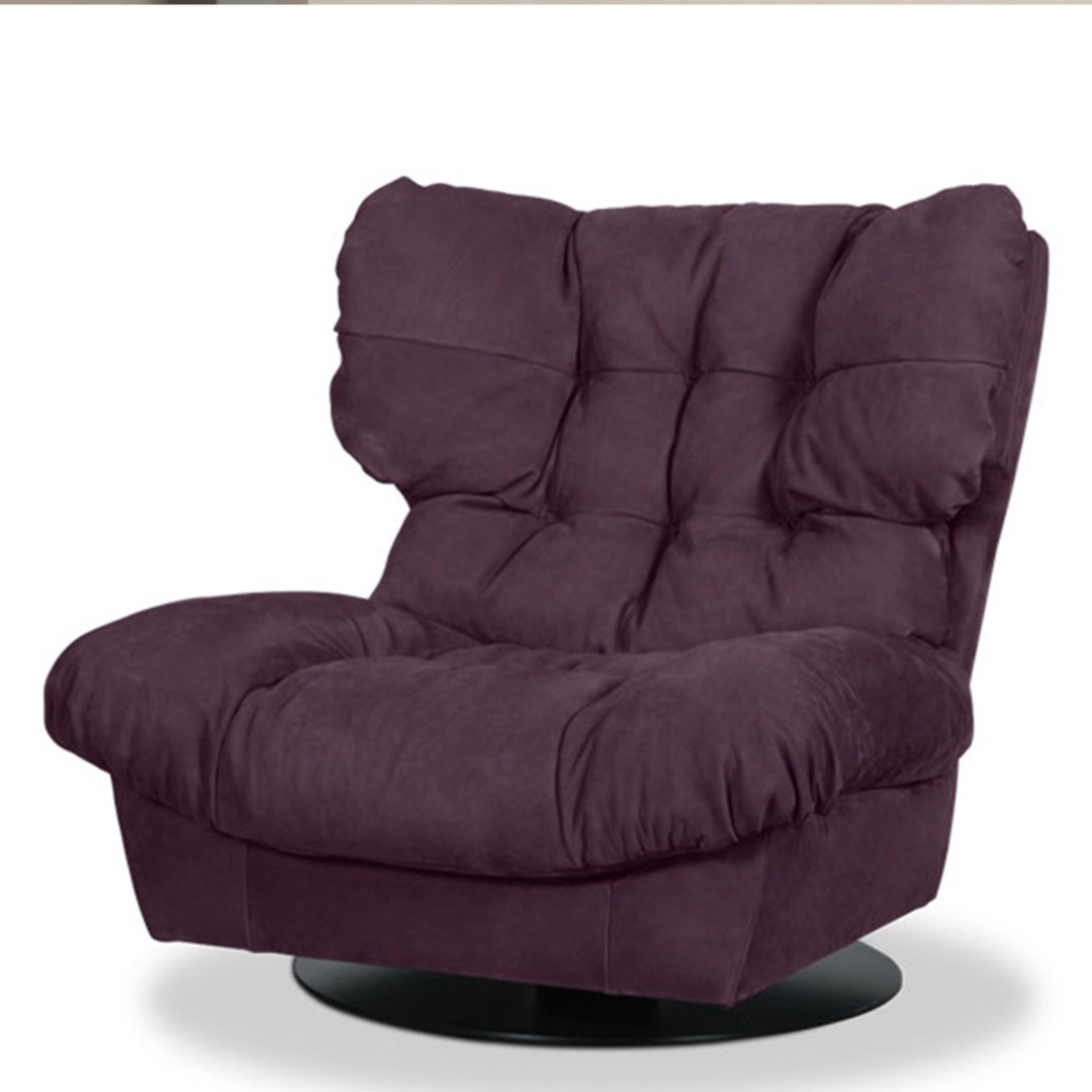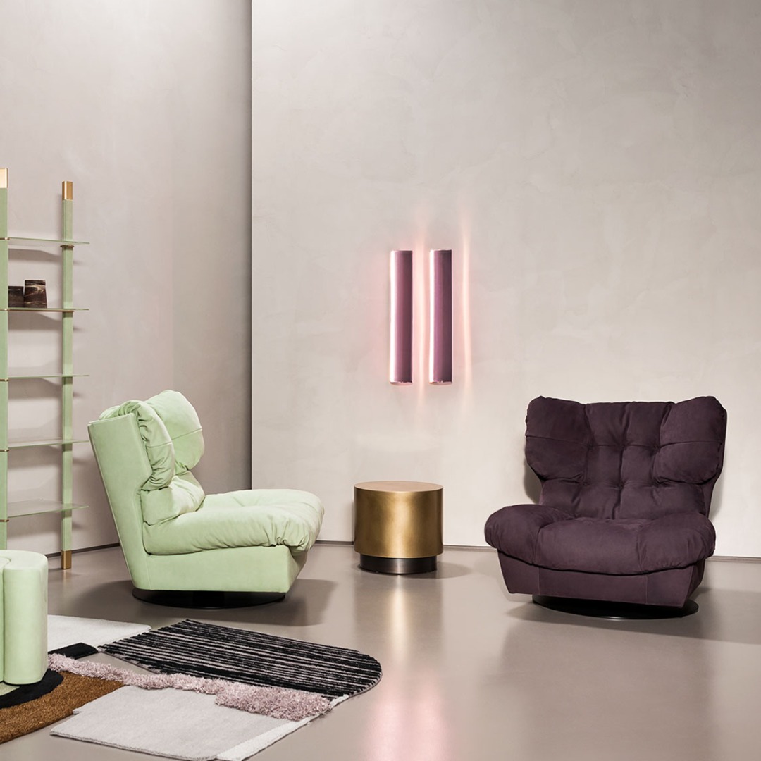 Structure in phenolic plywood and fir essence. Differentiated density polyurethane foam filling with acrylic fibre covering. Decoration with same colour leather and matching or white/red yearn. Armchair with base in matte black-varnished tulipier wood. Armchair with revolving base in matte black varnished metal.