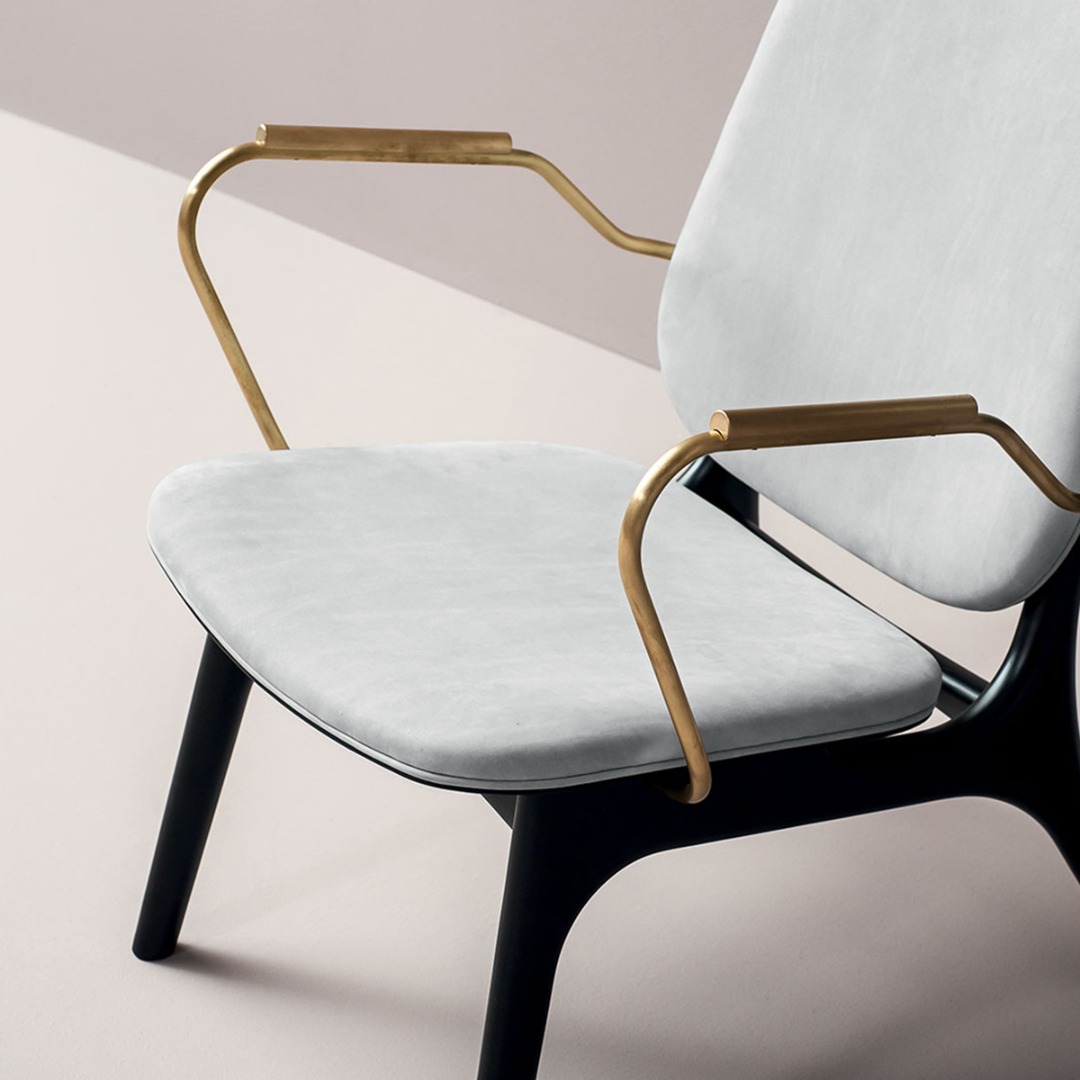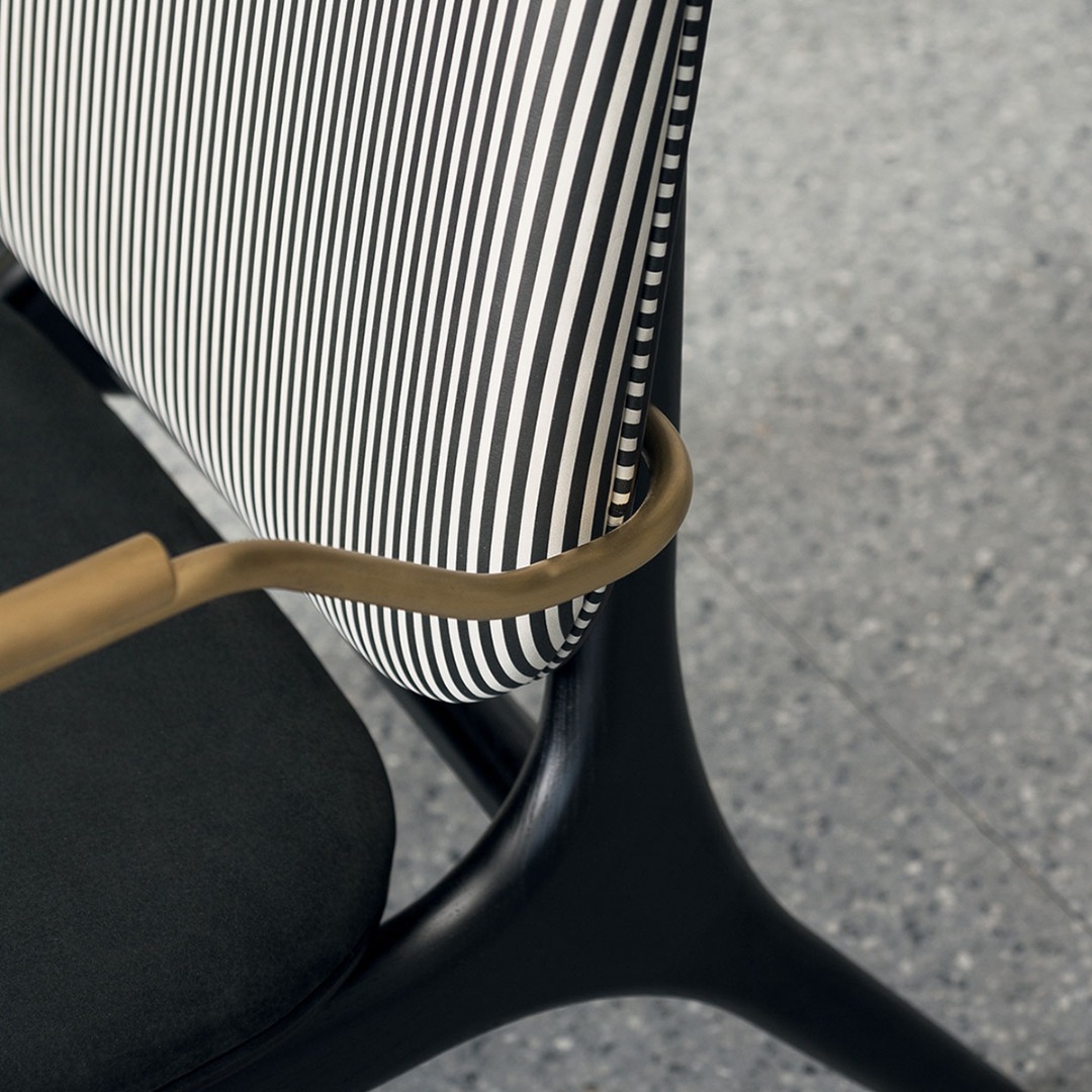 Semi-gloss black-laquered solid ash frame. Seat and back frame in curved birch plywood, black-stained ash veneered, finished with matte clear enamel. Armrests in satin brass reinforcing rod with matte varnish.