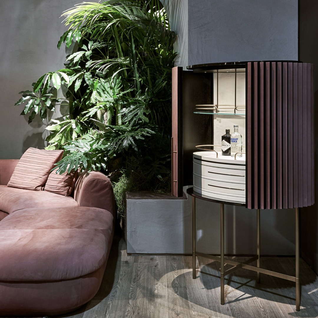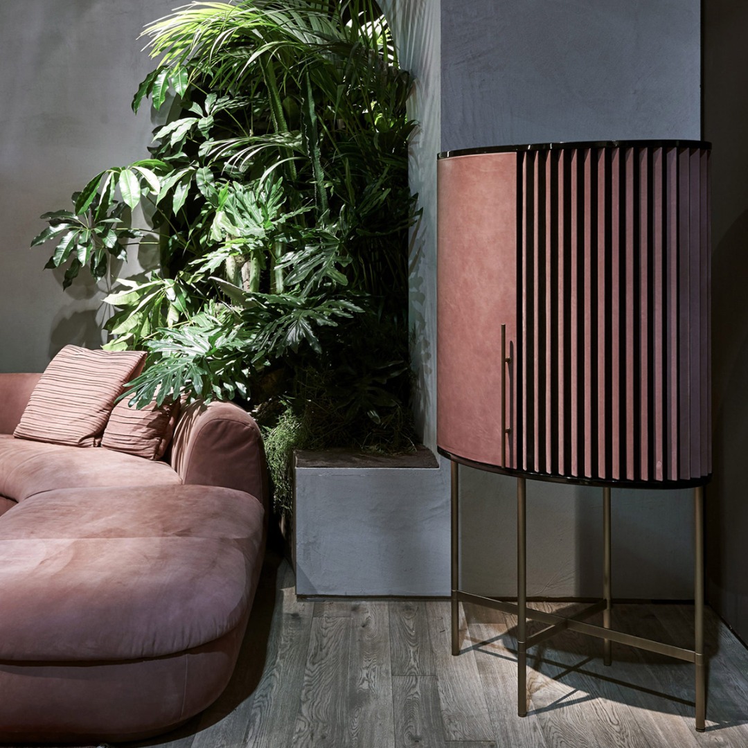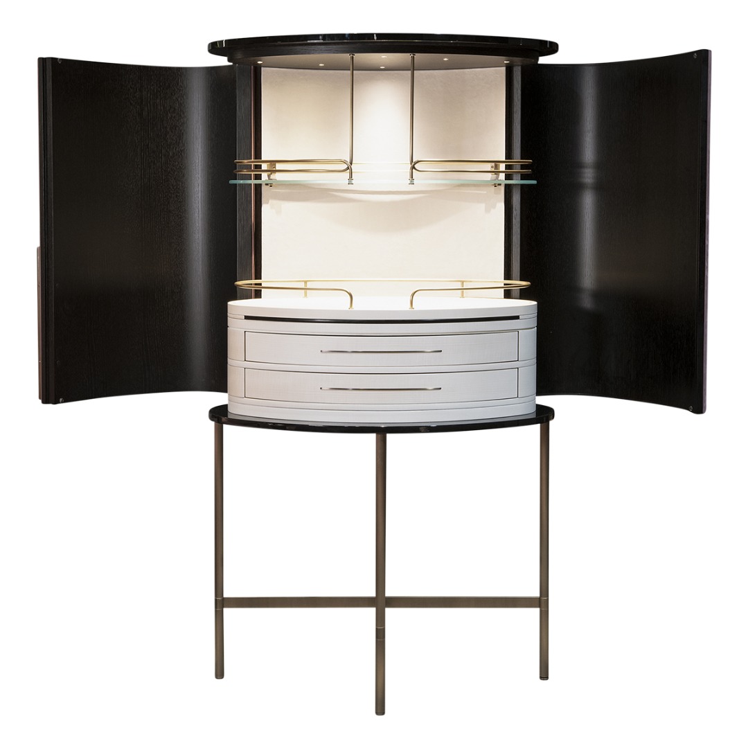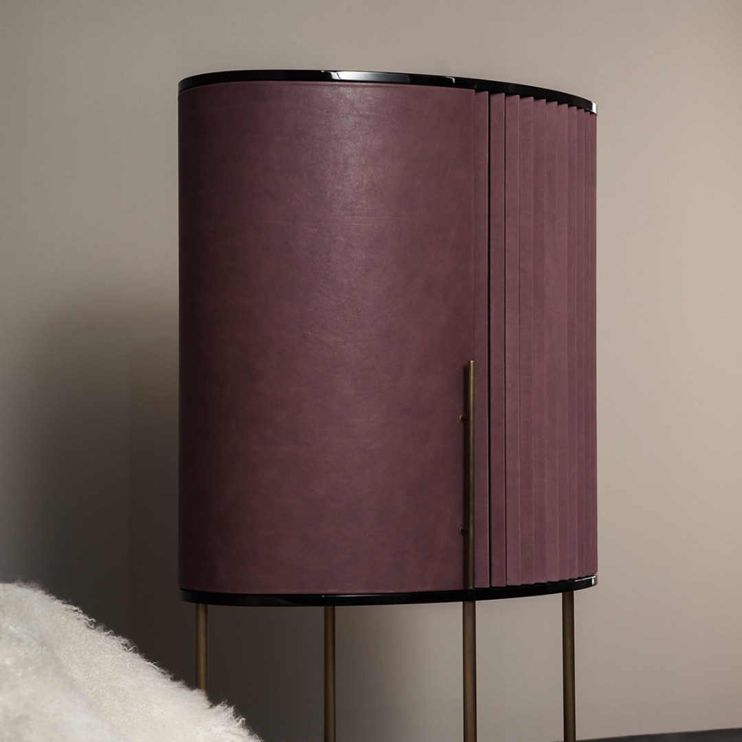 Burnished brass base. Internal natural maple veneered MDF frame with exterior back in matte black-stained oak. Curved shutter in poplar plywood internally veneered in black oak. Externally, one shutter is covered with leather, the other one with triangular plissé pattern. This pattern is matte black-stained oak on one side and leather-covered on the other. Base (bar version only) and top in brushed glossy black-lacquered MDF. Handles in burnished brass.