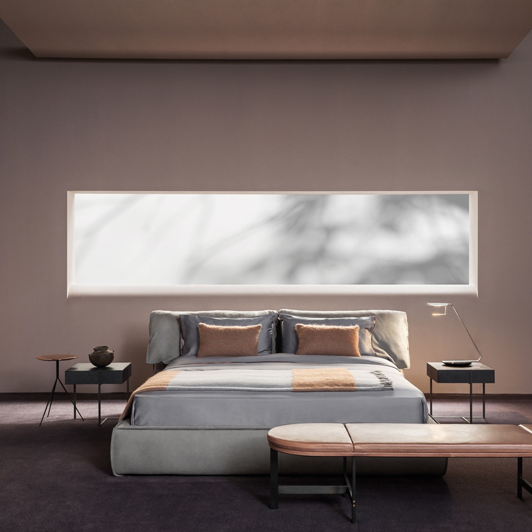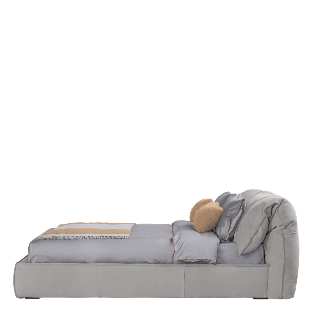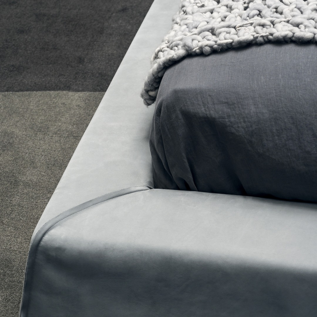Honeycomb fir sommier structure with four demountable side bands. Differentiated density polyurethane foam filling with acrylic fibre cover. Headboard with washed and sterilized goose down. Leather-covered back of the headboard. Leather upholstery with sharp edge stitching. Bed frame upholstery in removable leather. Feet in walnut-stained beech.