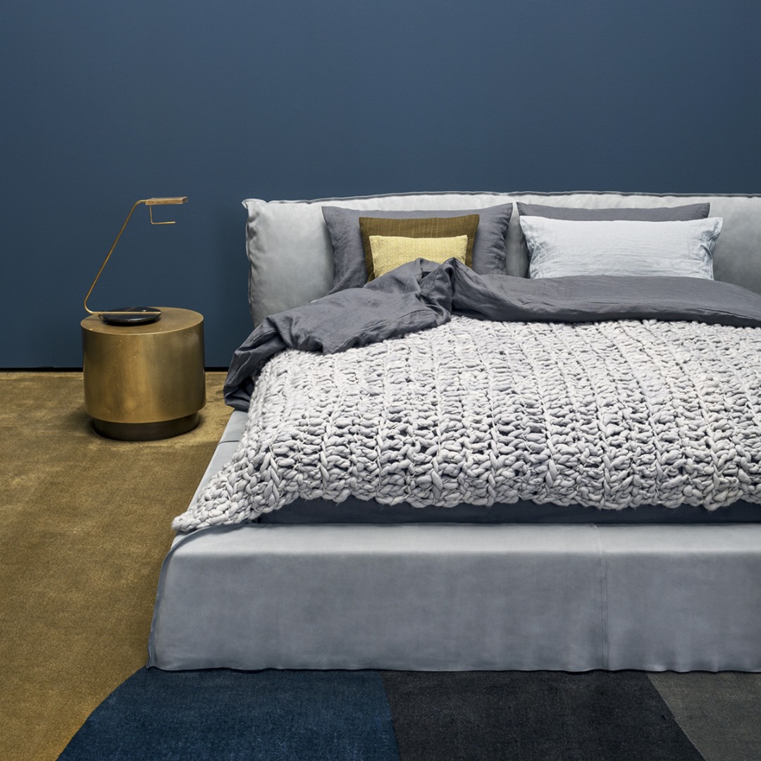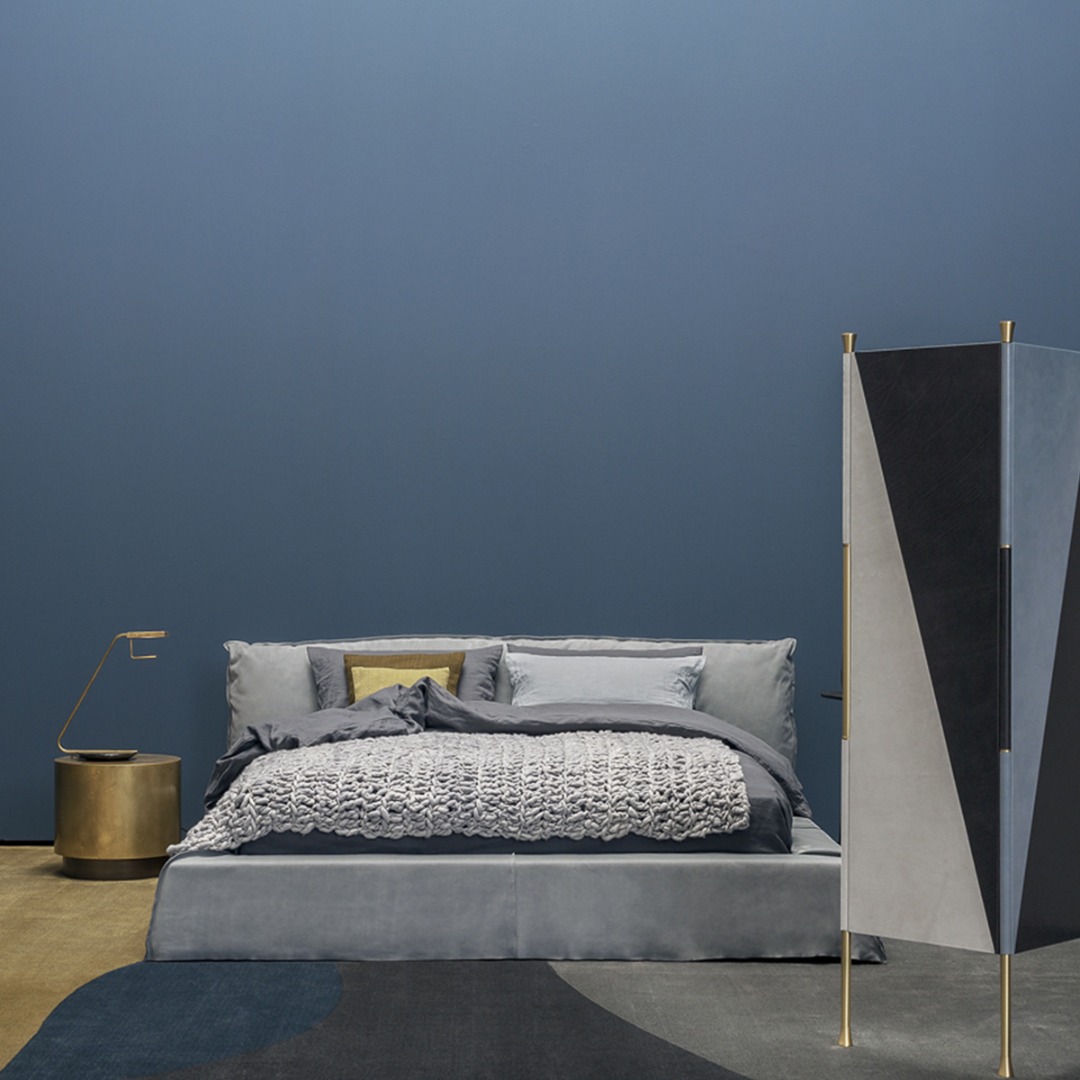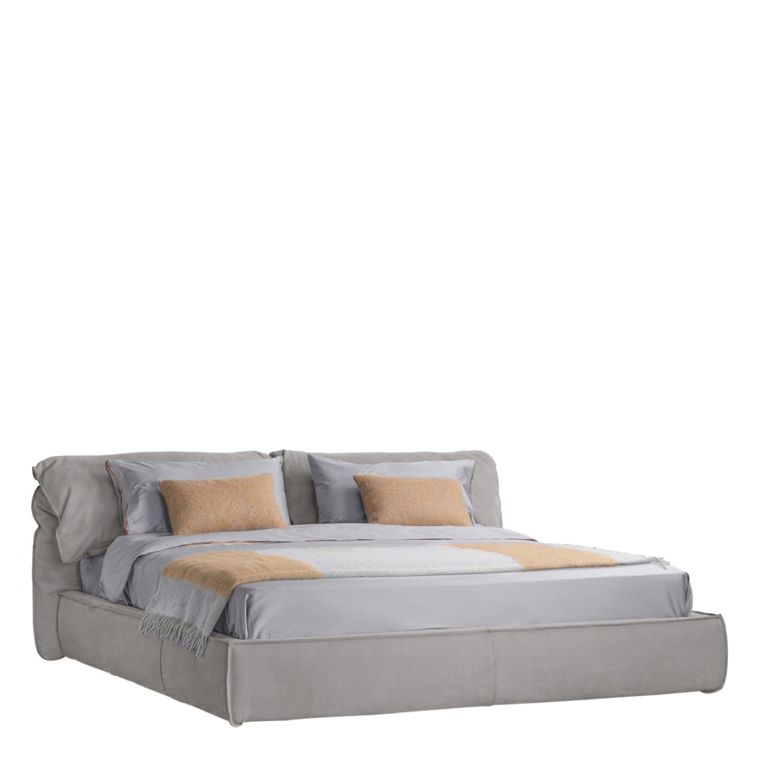 Honeycomb fir sommier structure with four demountable side bands. Differentiated density polyurethane foam filling with acrylic fibre cover. Headboard with washed and sterilized goose down. Leather-covered back of the headboard. Leather upholstery with sharp edge stitching. Bed frame upholstery in removable leather. Feet in walnut-stained beech.