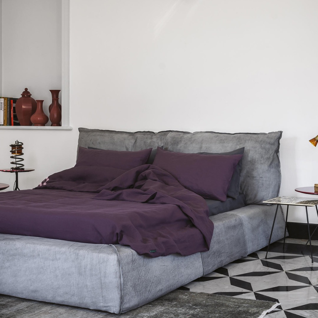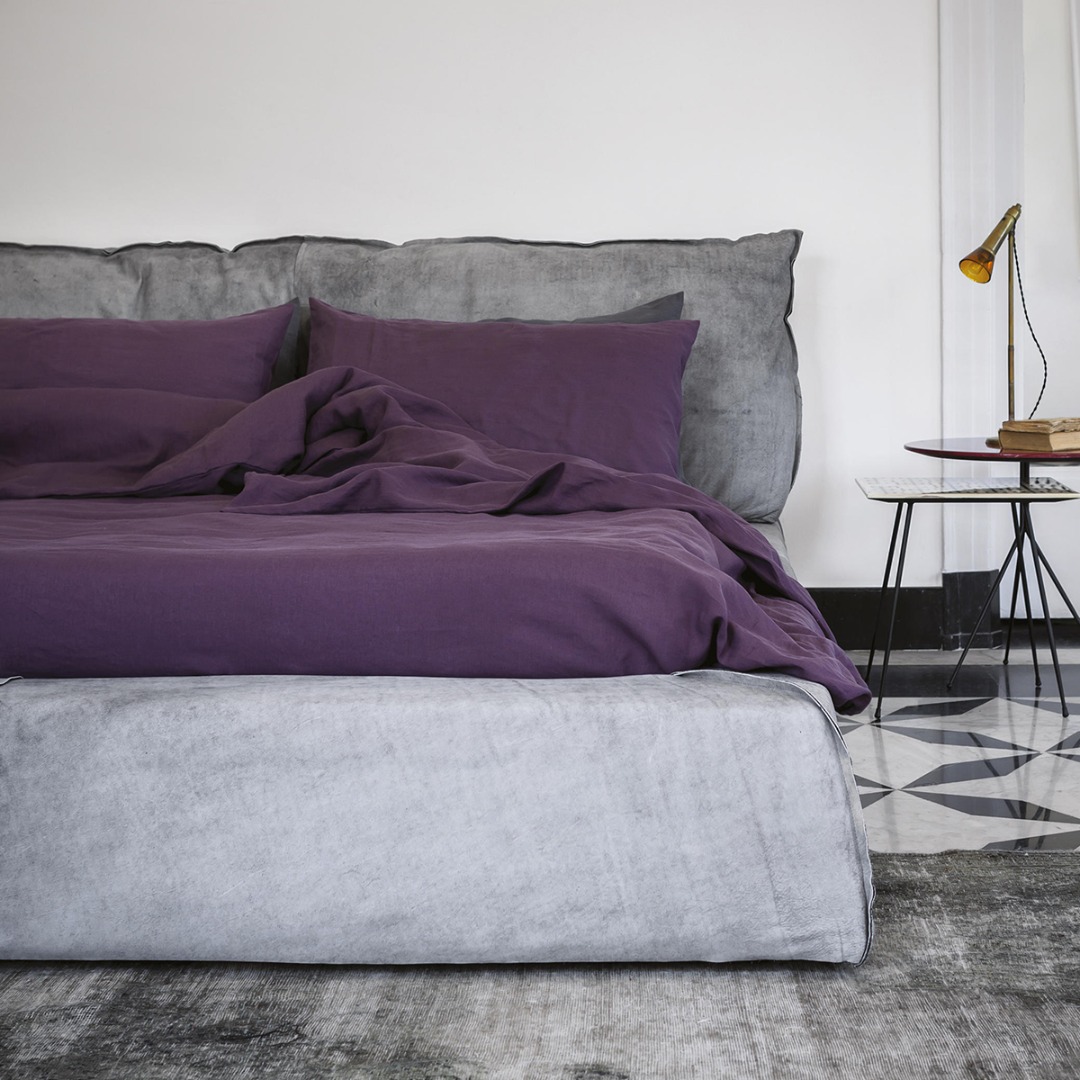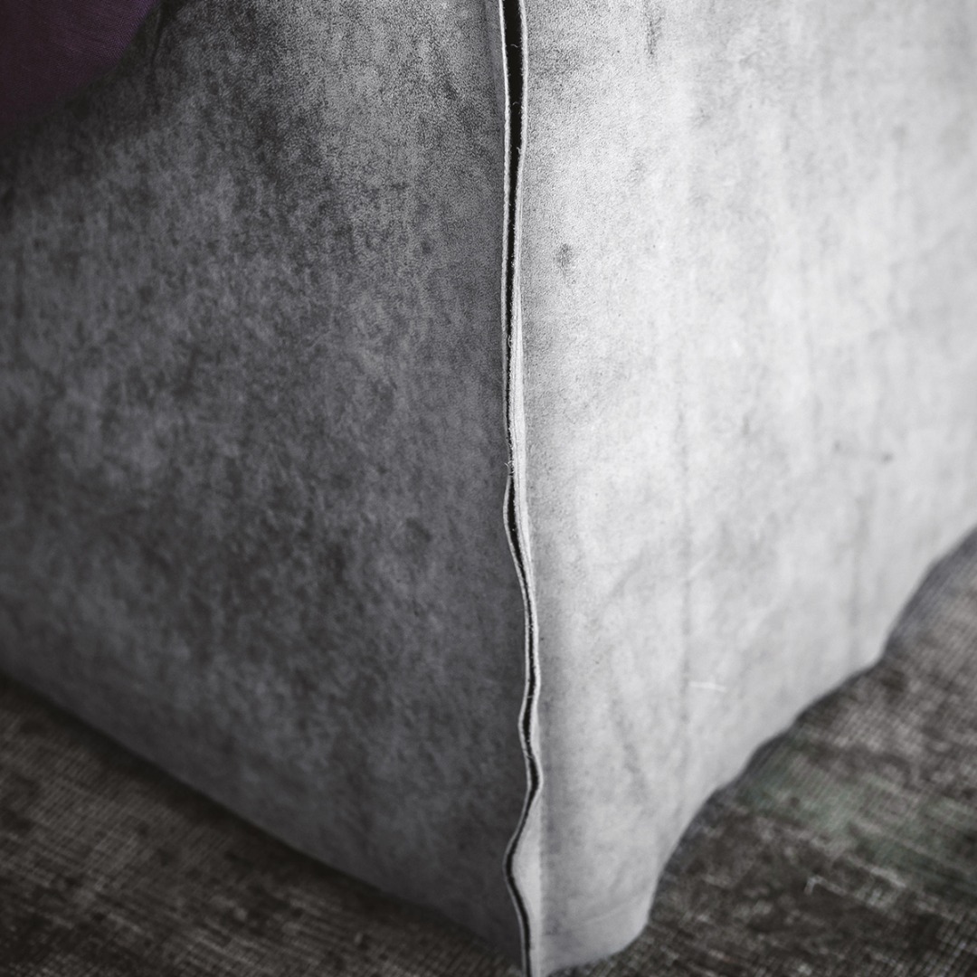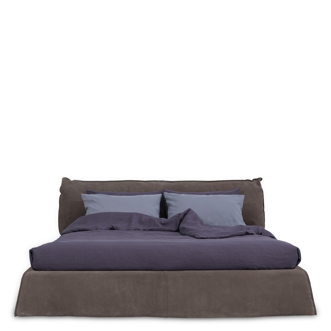 Bed frame with four side bands in honeycomb pine and poplar wood. Padding in differentiated density polyurethane foam, with acrylic fibre covering. Headboard with frame in drawn spring steel, elastic straps, washed and sterelized goose down padding with polyurethane foam insert in differentiated density. Leathercovered back of the headboard. Leather upholstery with sharp edge stitching. Bed frame and headboard upholstery in removable leather. Feet in walnut-stained beech.