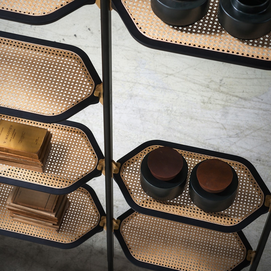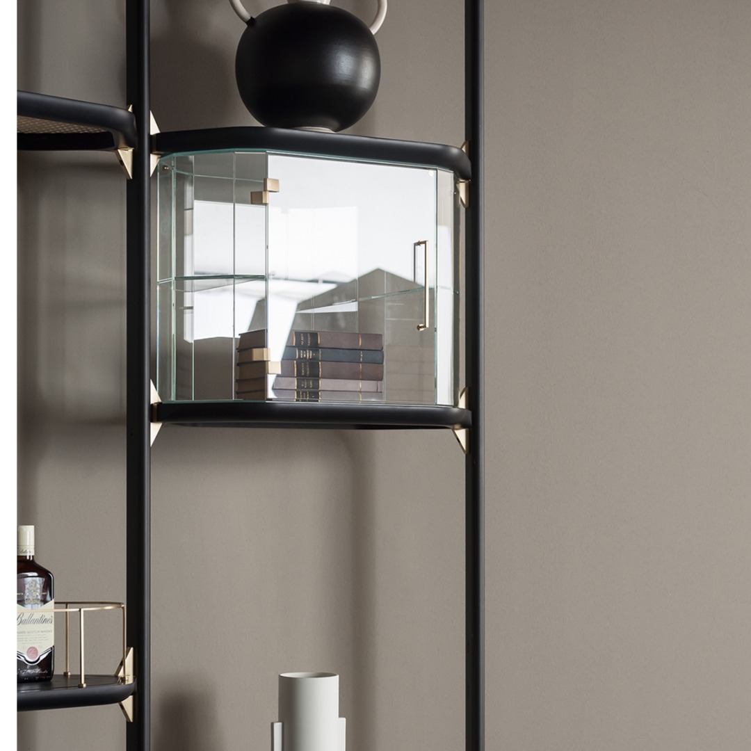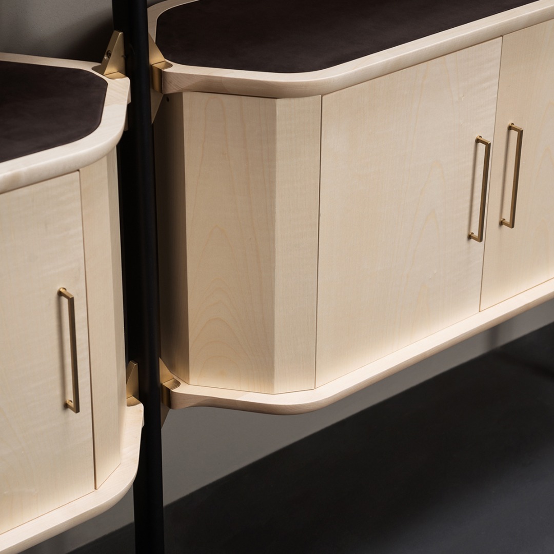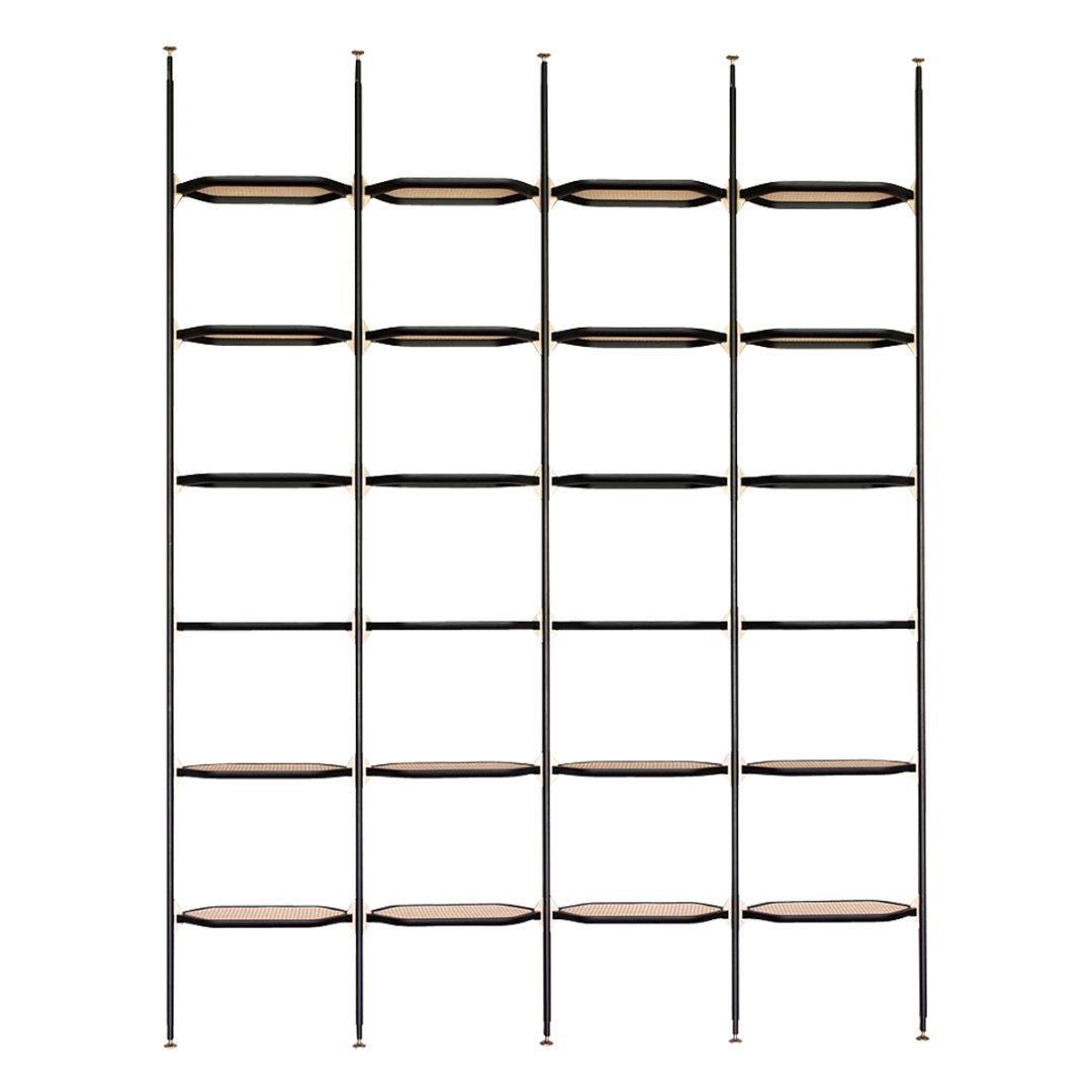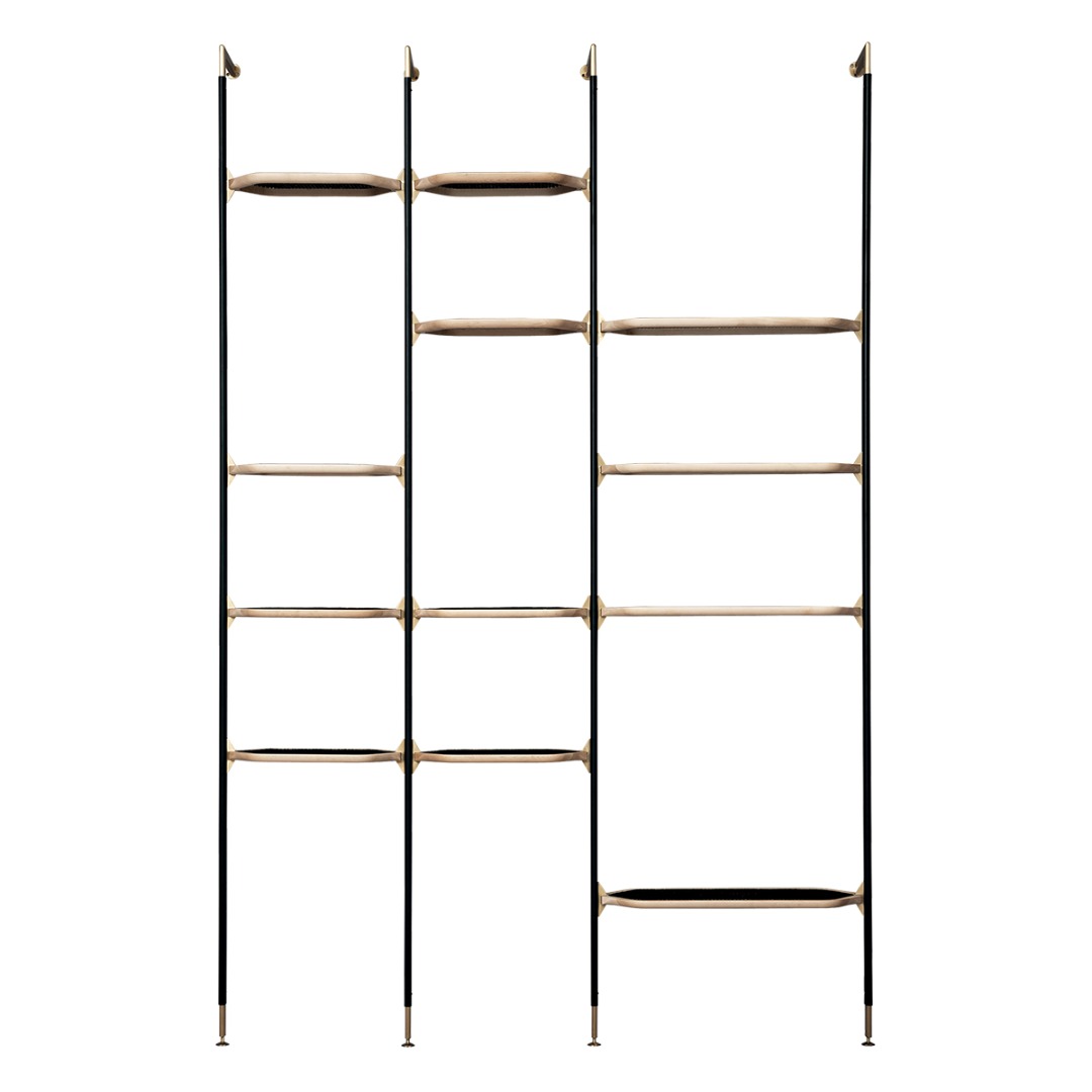 Matte black-varnished supporting aluminium tubular frame, fastened to ceiling or to wall through satin brass pins. Shelves’ supports in satin brass. Shelves with frame in black-stained maple with inside in cane or leather-covered, frame in honey maple with inside in black cane or leather-covered. Storage structure in tempered extra-light glass, 6 mm thickness, or in plywood (honey maple or black-stained maple veneered). Top and base in solid honey maple or black-stained maple with leather upholstery. Supports and handle in satin brass.