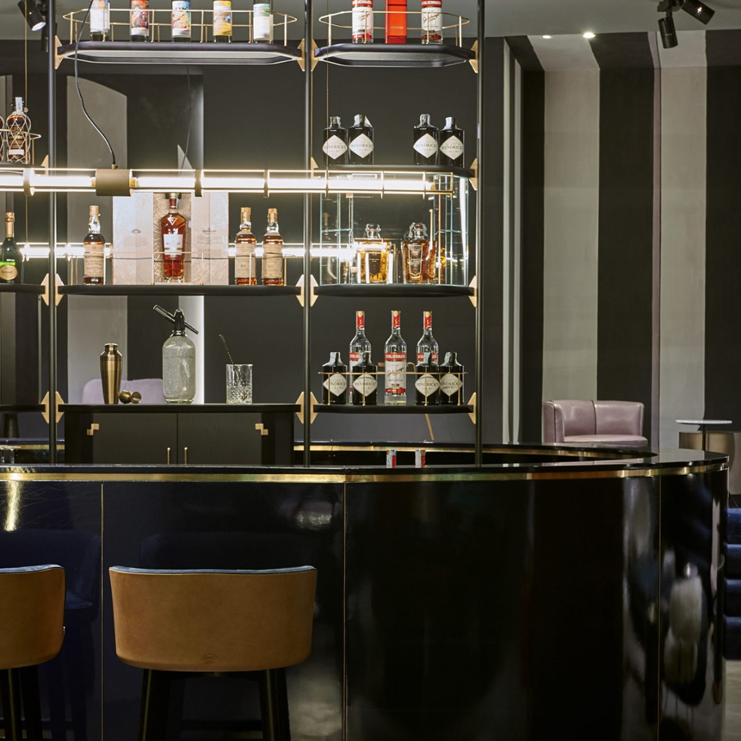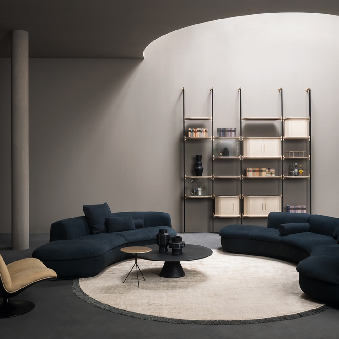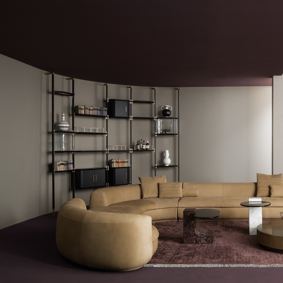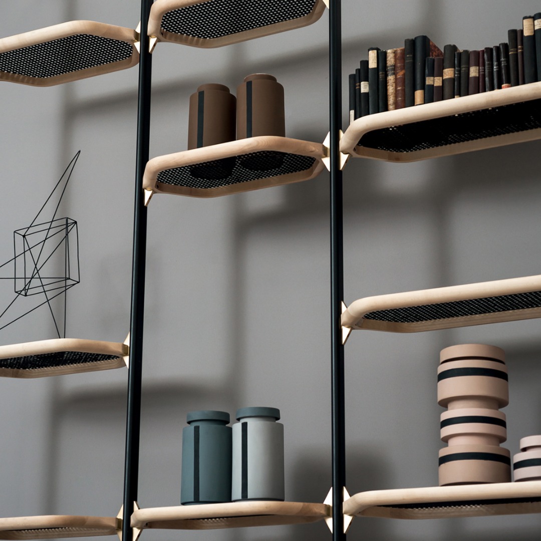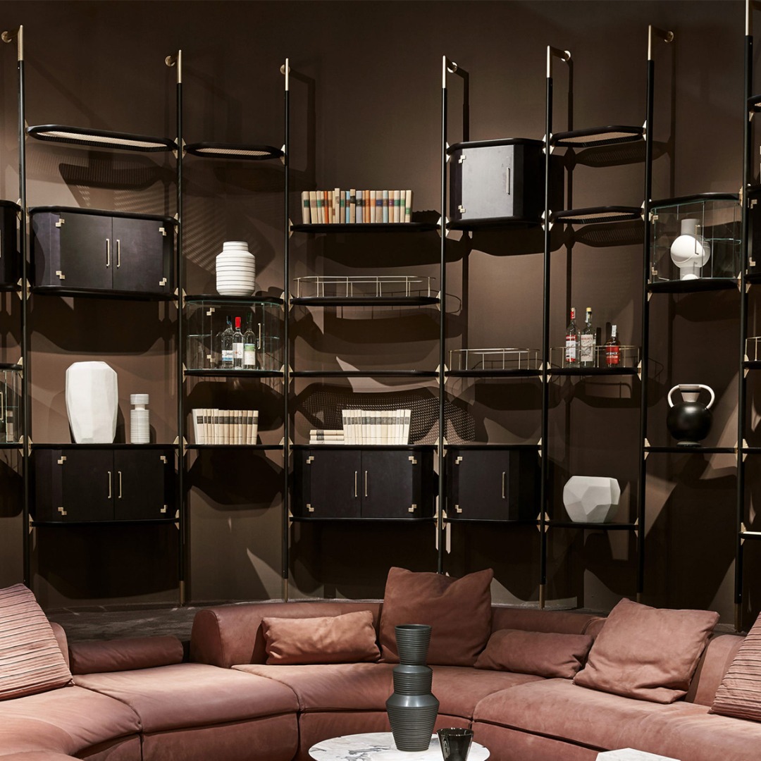 Matte black-varnished supporting aluminium tubular frame, fastened to ceiling or to wall through satin brass pins. Shelves’ supports in satin brass. Shelves with frame in black-stained maple with inside in cane or leather-covered, frame in honey maple with inside in black cane or leather-covered. Storage structure in tempered extra-light glass, 6 mm thickness, or in plywood (honey maple or black-stained maple veneered). Top and base in solid honey maple or black-stained maple with leather upholstery. Supports and handle in satin brass.
