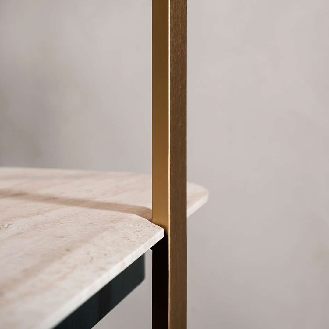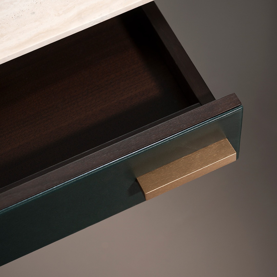 MDF frame with leather upholstery. Bevelled stone top with water-repellent protective oil, 20mm thickness. Leg in tubular satin brass-coated metal or burnished metal with matte varnish, with LED strip housing compartment. Drawers in veneered canaletto walnut, leathercovered front panels and handles in satin brass-coated metal or in burnished metal with matte varnish.