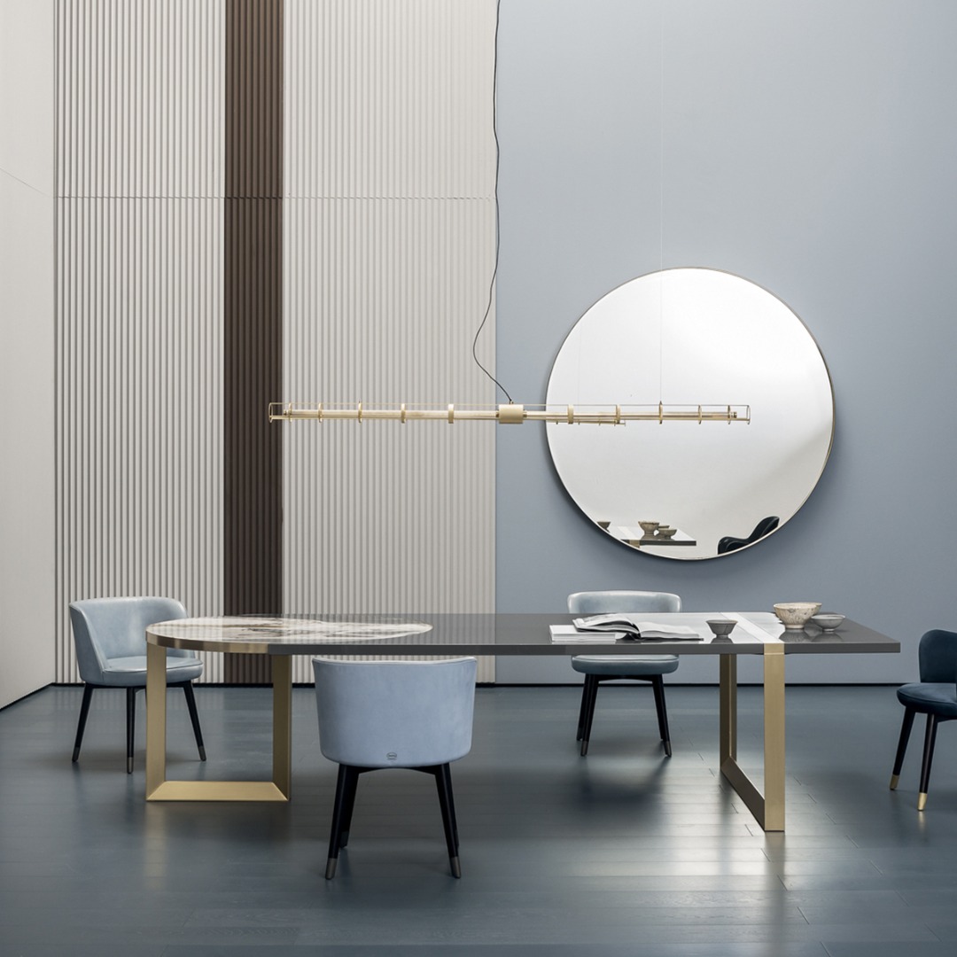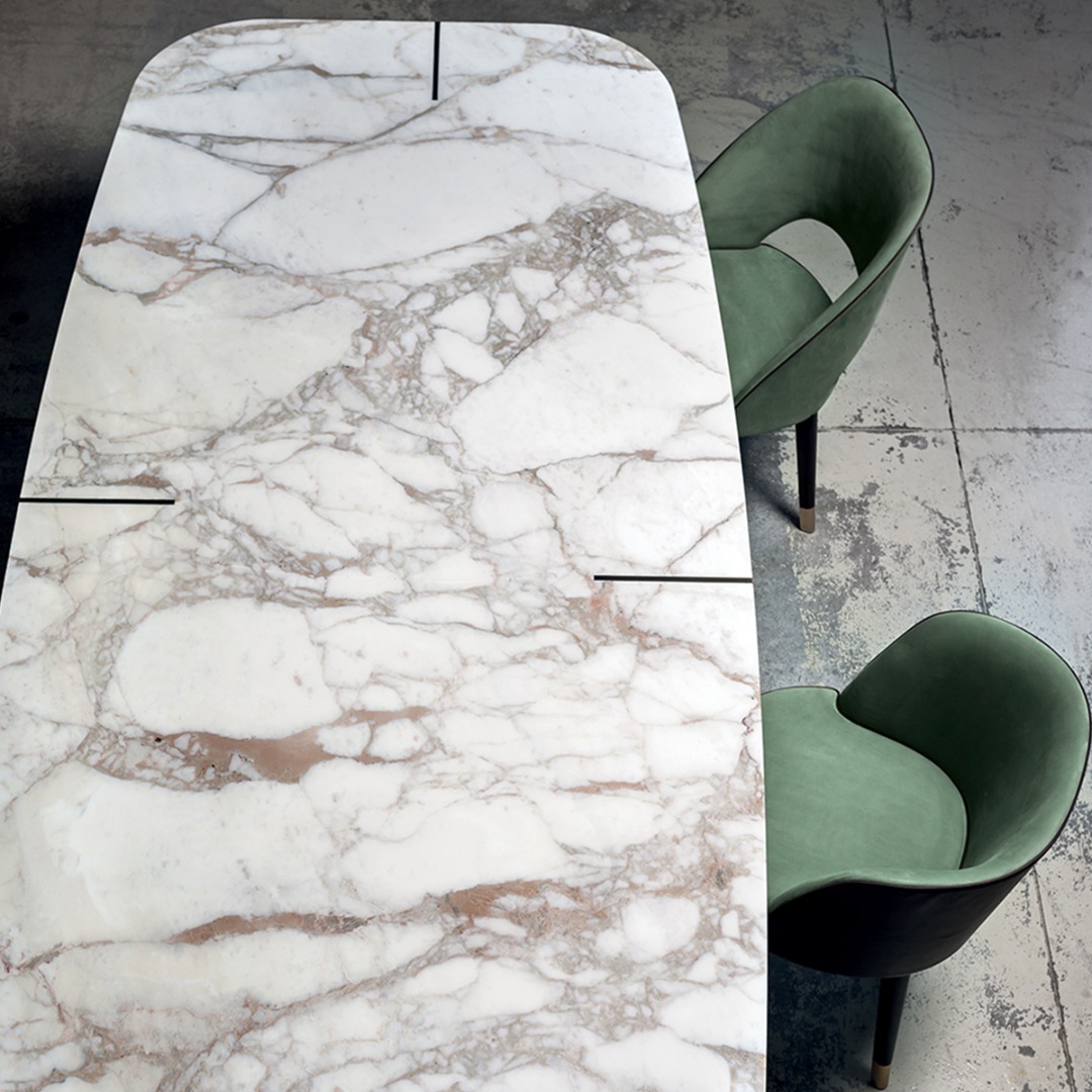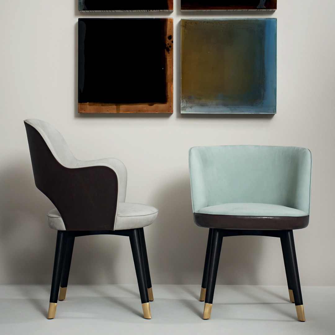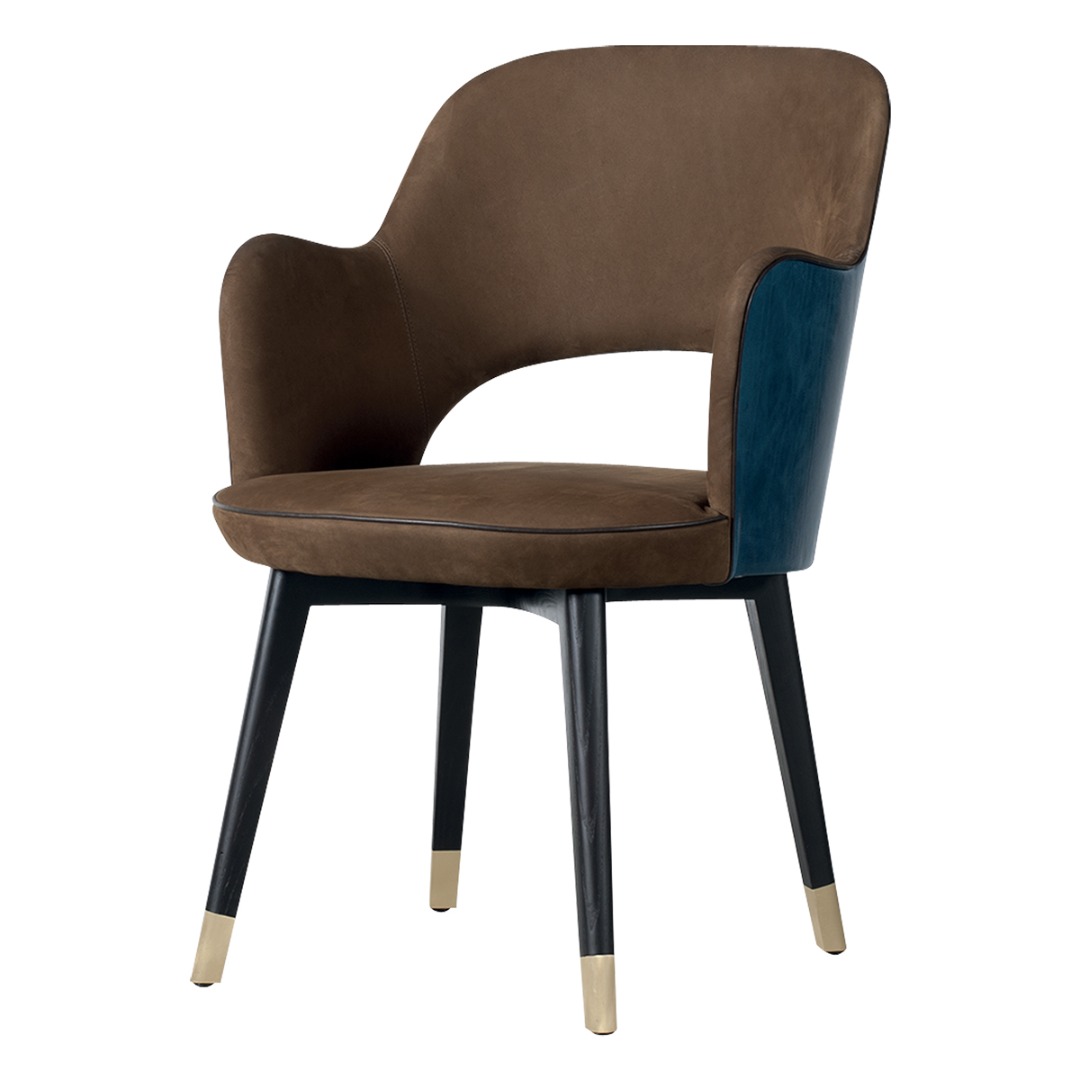 Backrest frame in curved poplar and birch plywood. Base in wengé-stained ash. Feet end in satin brass, hand-finished burnished metal or satin nickeled metal, with matte varnish. Decorative Metallo brunito piping in the same shade of leather.