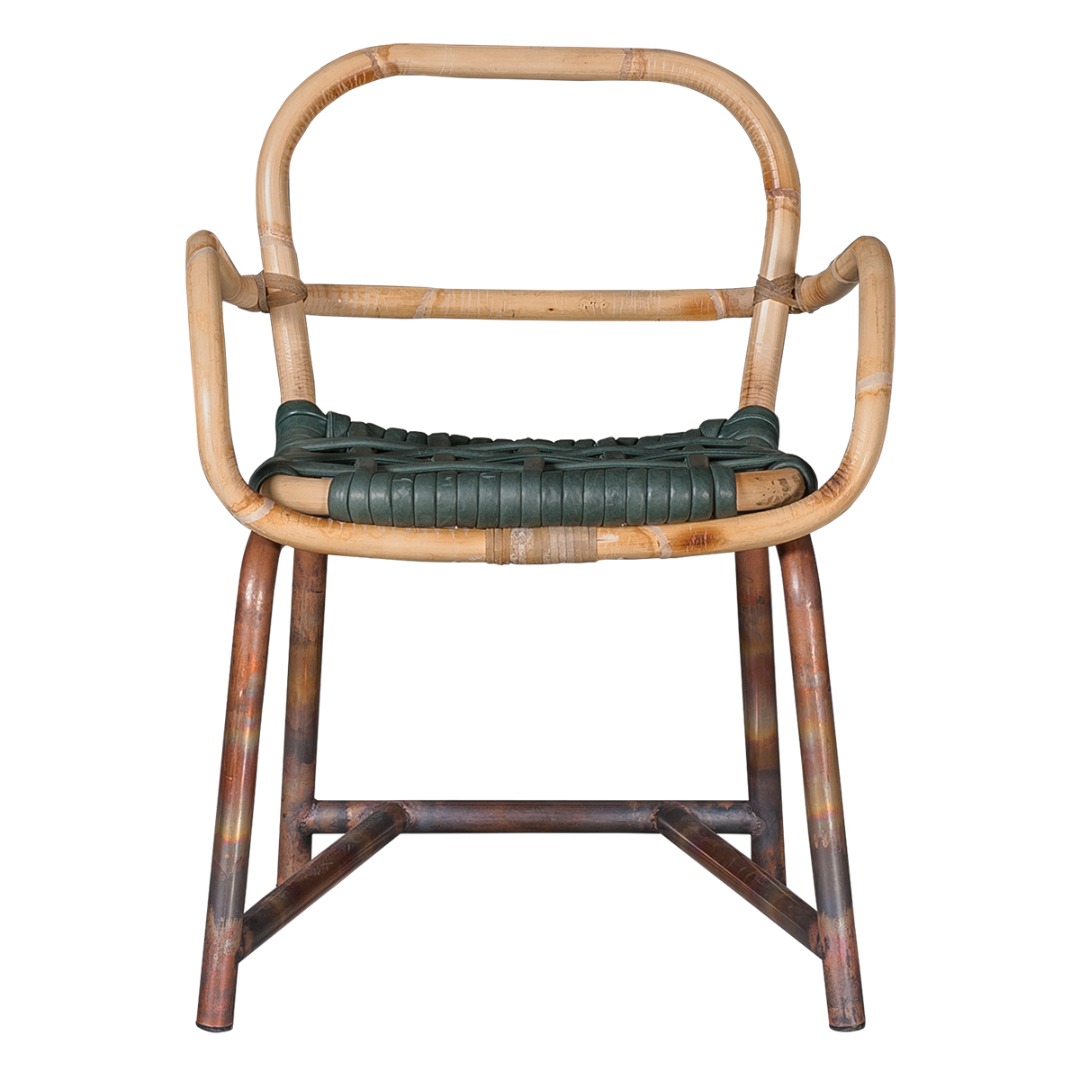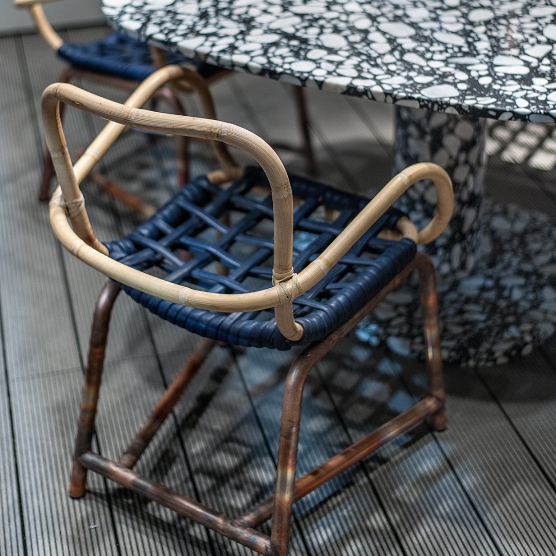 Tubular structure, made of Manila cane and etched copper, interlaced through the plaiting of a technical leather-covered rope.