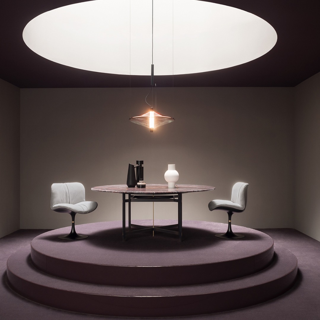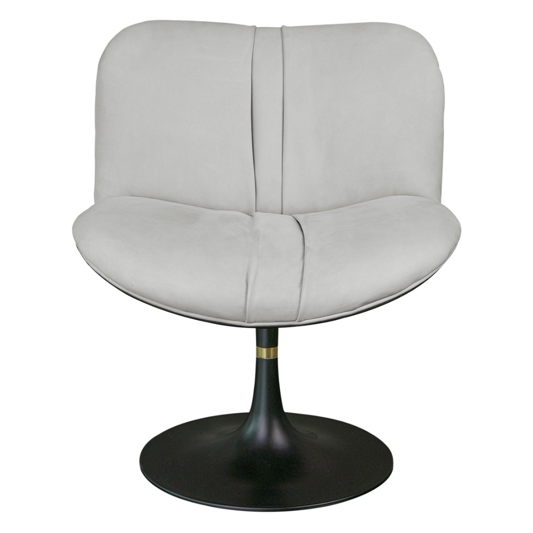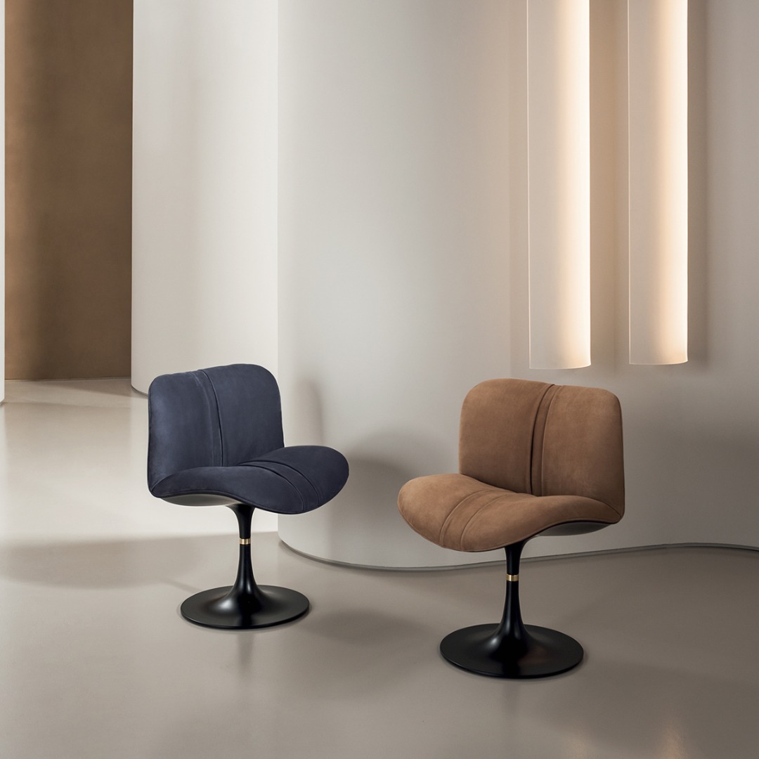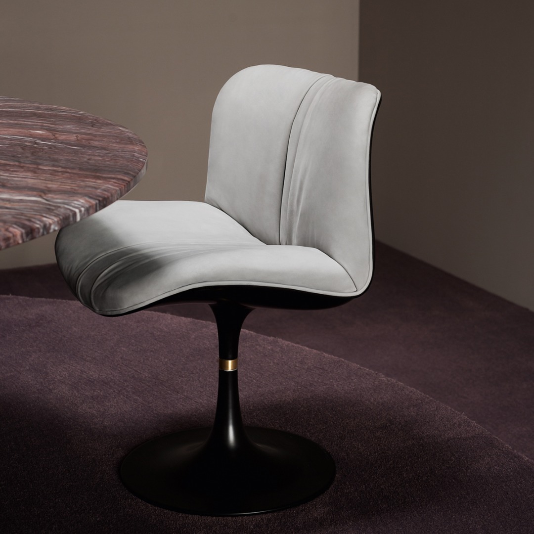 Matte black-varnished rigid frame. Matte black-varnished metal revolving base with satin-finished brass insert. Decorative piping in the same shade of leather of inner back and seat.