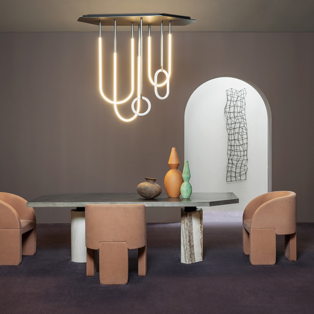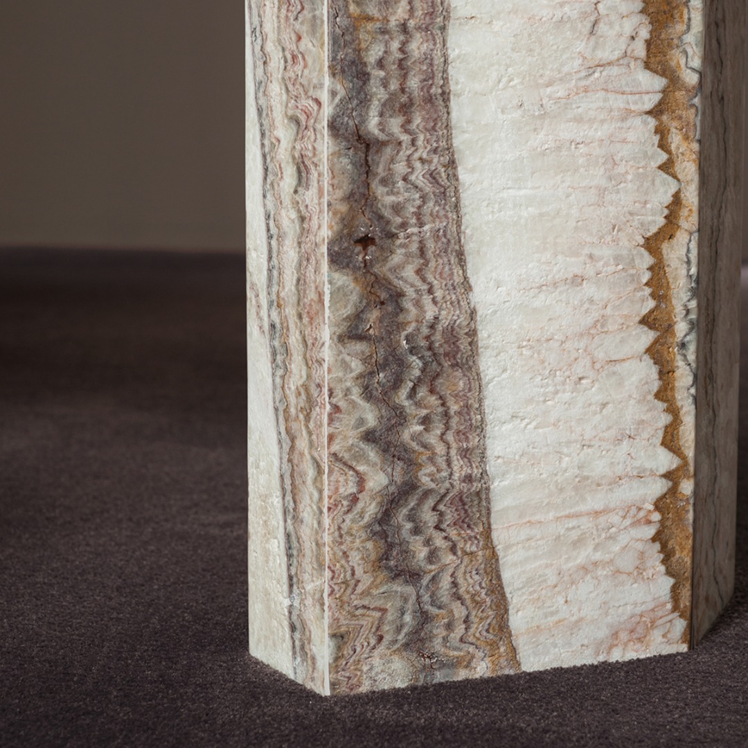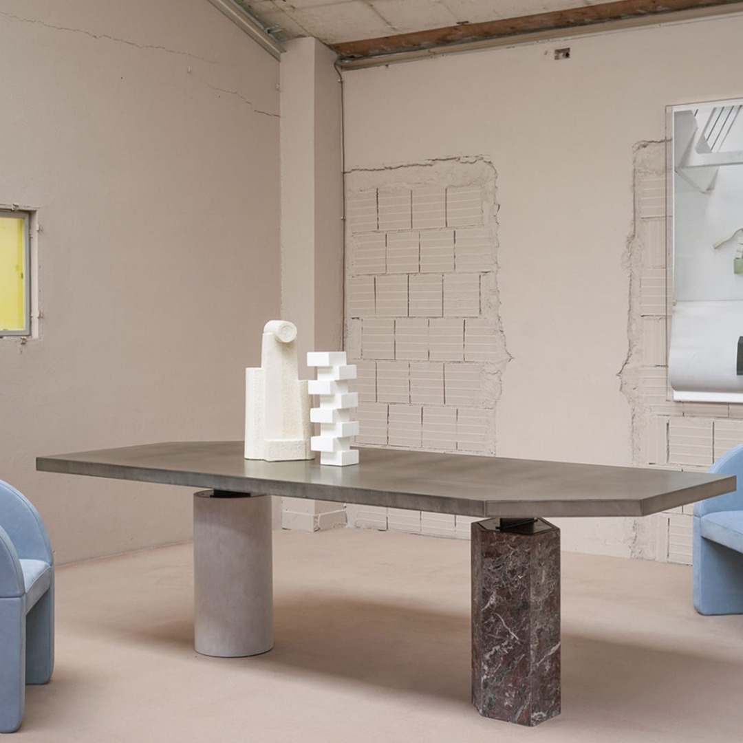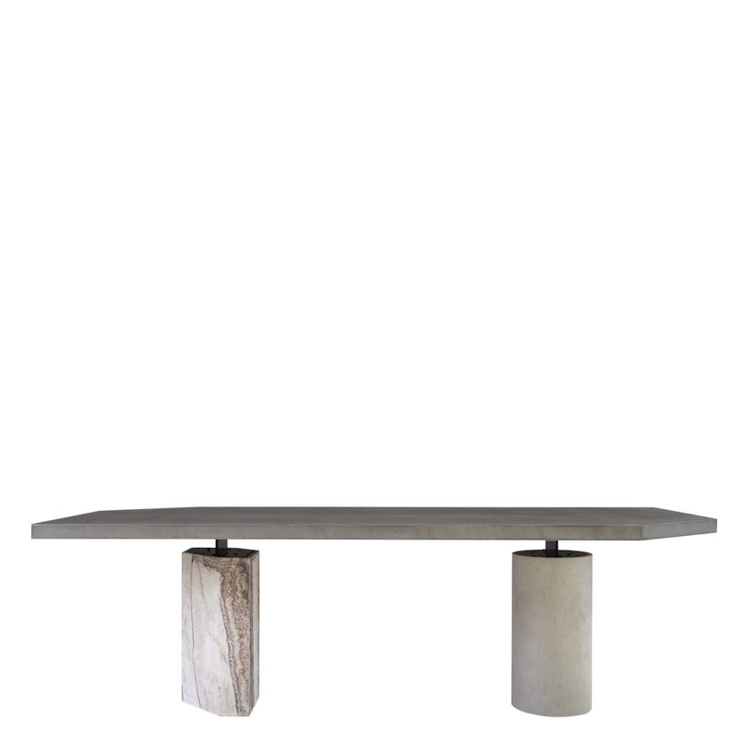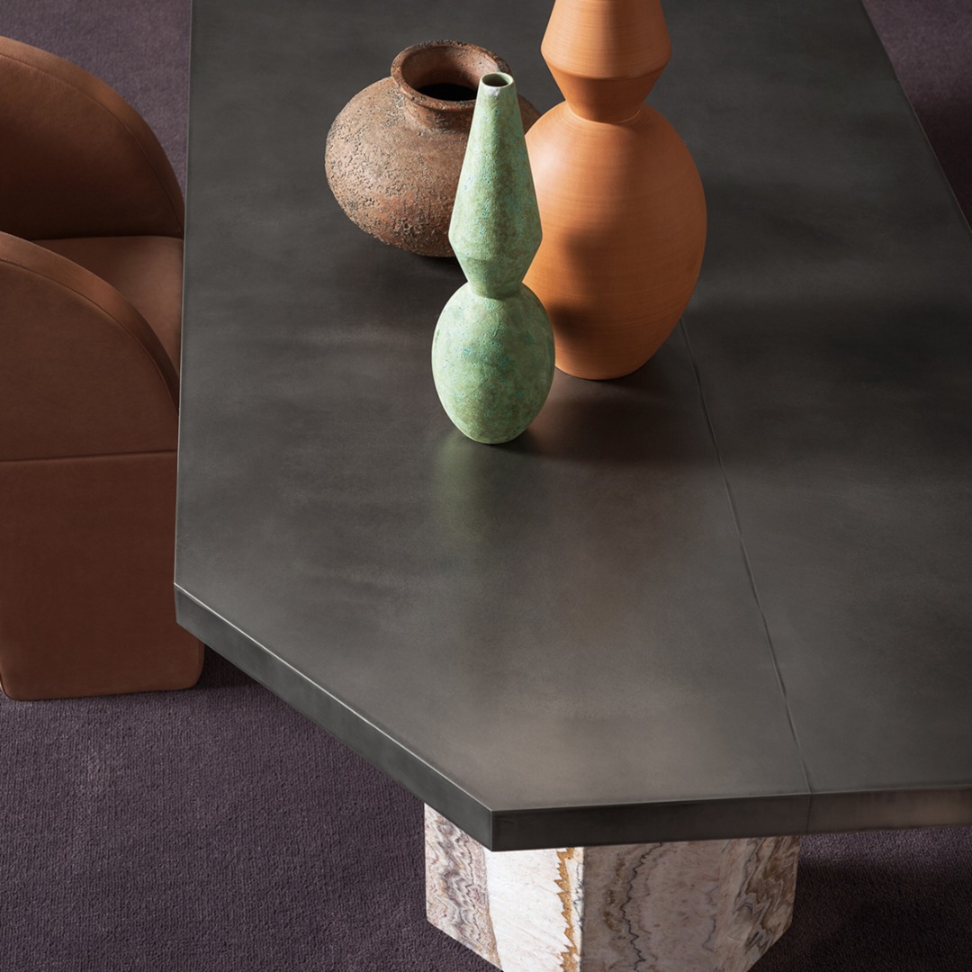 Honeycomb-core top covered with alpacca, in antiqued copper or antiqued brass, with matte varnish. Curved poplar cylindrical-shaped leg finished with Terra Cruda concrete (mineral waterproof finishing, semi-deformable mono-component cementitious material) hand-paddled by master craftsmen. Plywood contoured leg with irregular shape with stone covering with water-repellent protective oil.