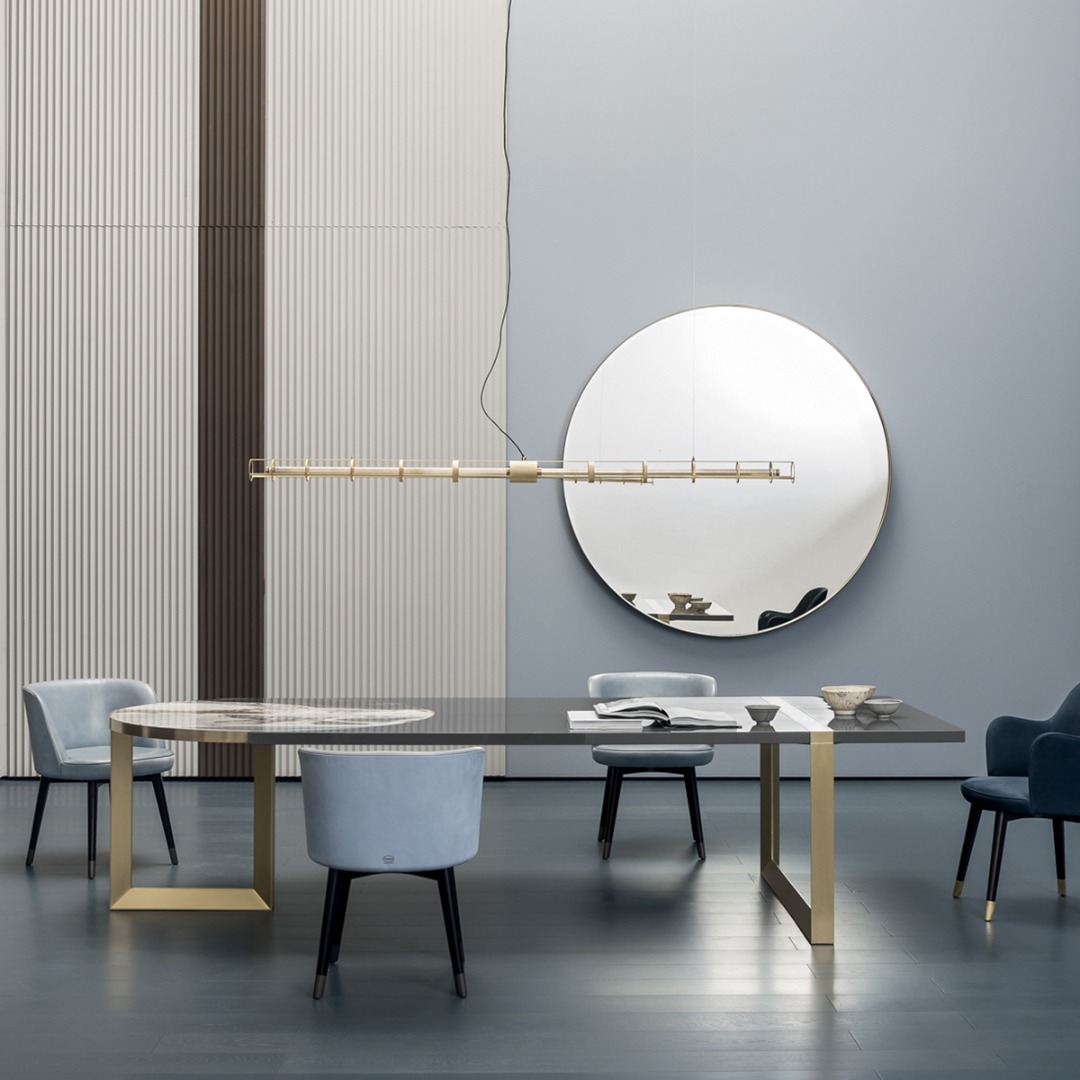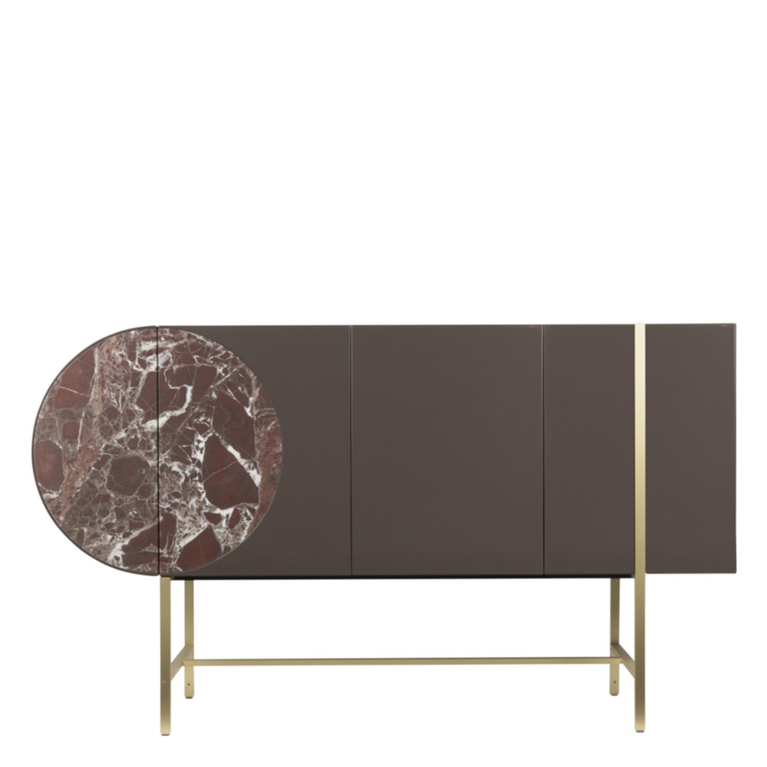 Base and top decorative inserts in satin-finished brass with wax finish. MDF top, with reinforcing aluminium sheets, lacquered true colored polyester, made in 8 full-colour hands, with 100 gloss brushed finish. Stone inserts with water-repellent protective oil with aluminium honeycomb support, 14 mm thickness.