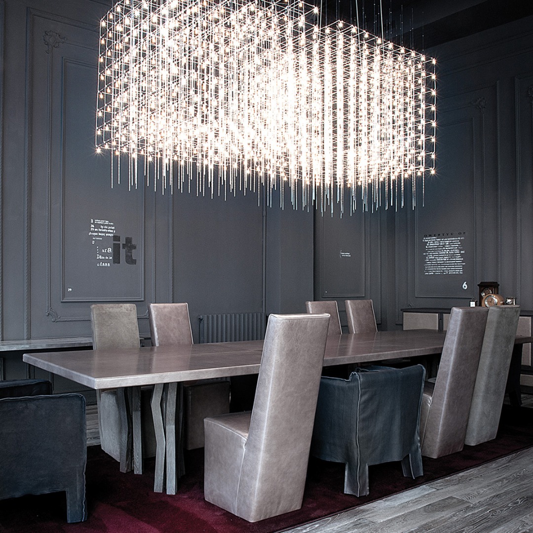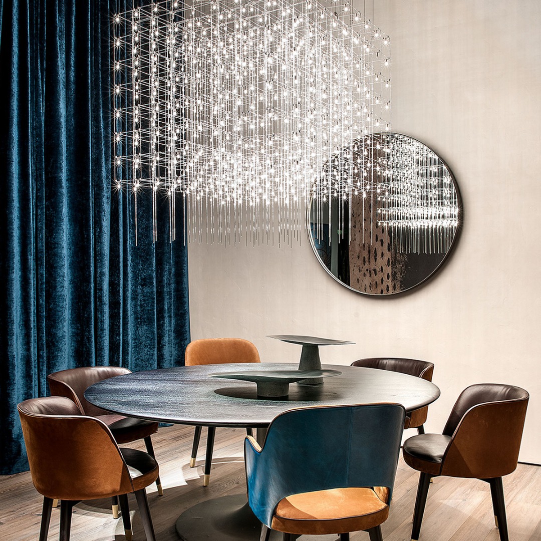 Curved nickel rows, connected with special clamps with incorporated bulb holder. Fringe composed by 64 removable glass sticks.
