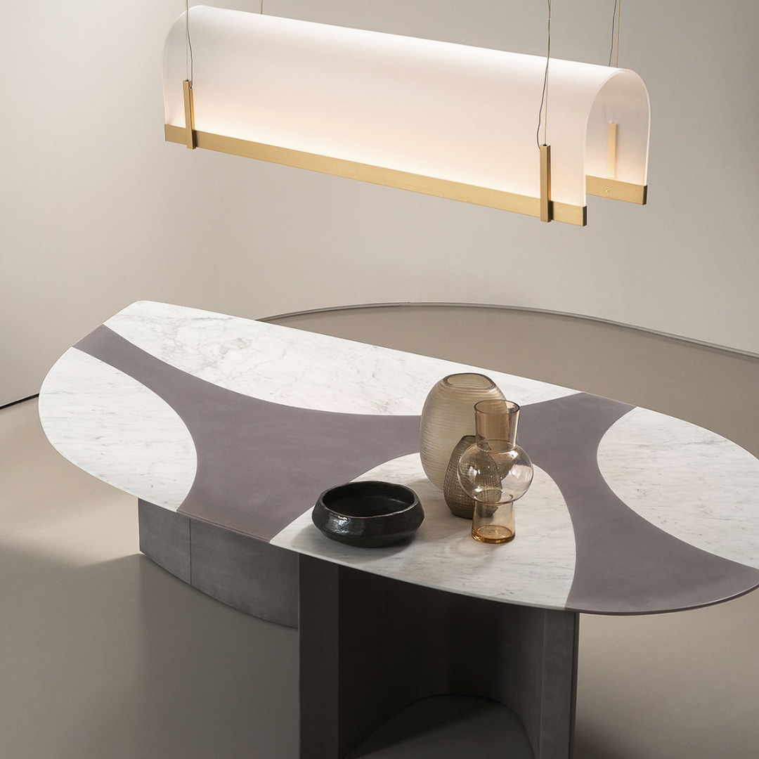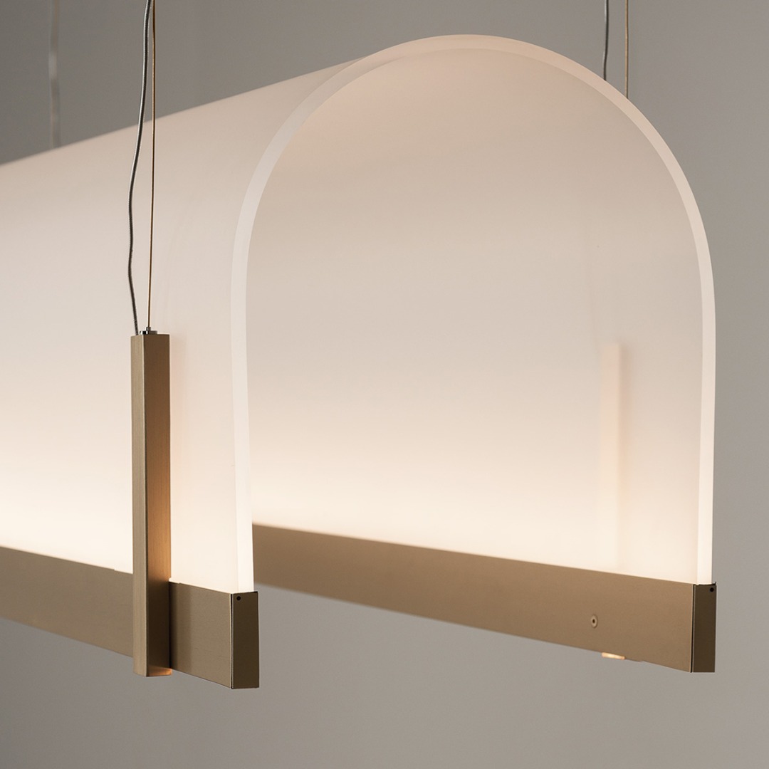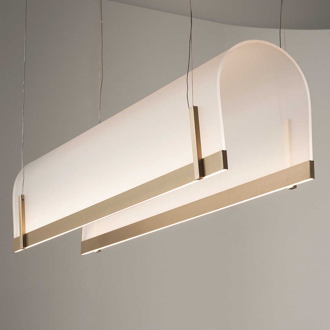 8 mm thick lampshade in printed curved methacrylate. Profiles and details in satin brass-coated metal with matte varnish. Lamp with 2700K led light source.